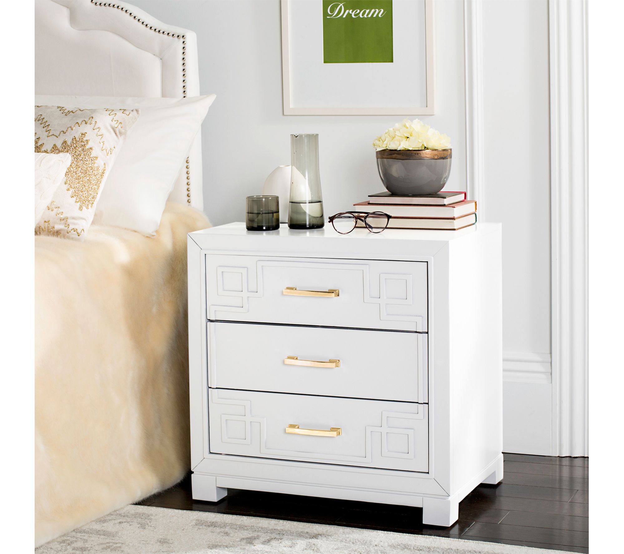 Invite modern sophistication into your bedroom with this Raina Greek key night stand. Designed with three spacious drawers, it offers plenty of space to store your nighttime essentials. From Safavieh.