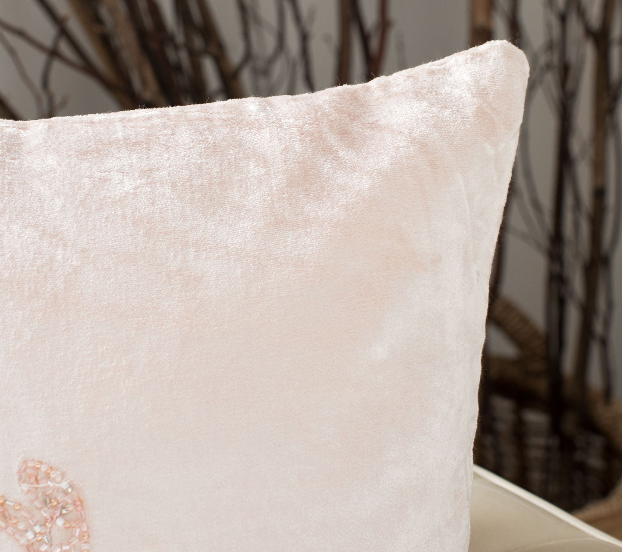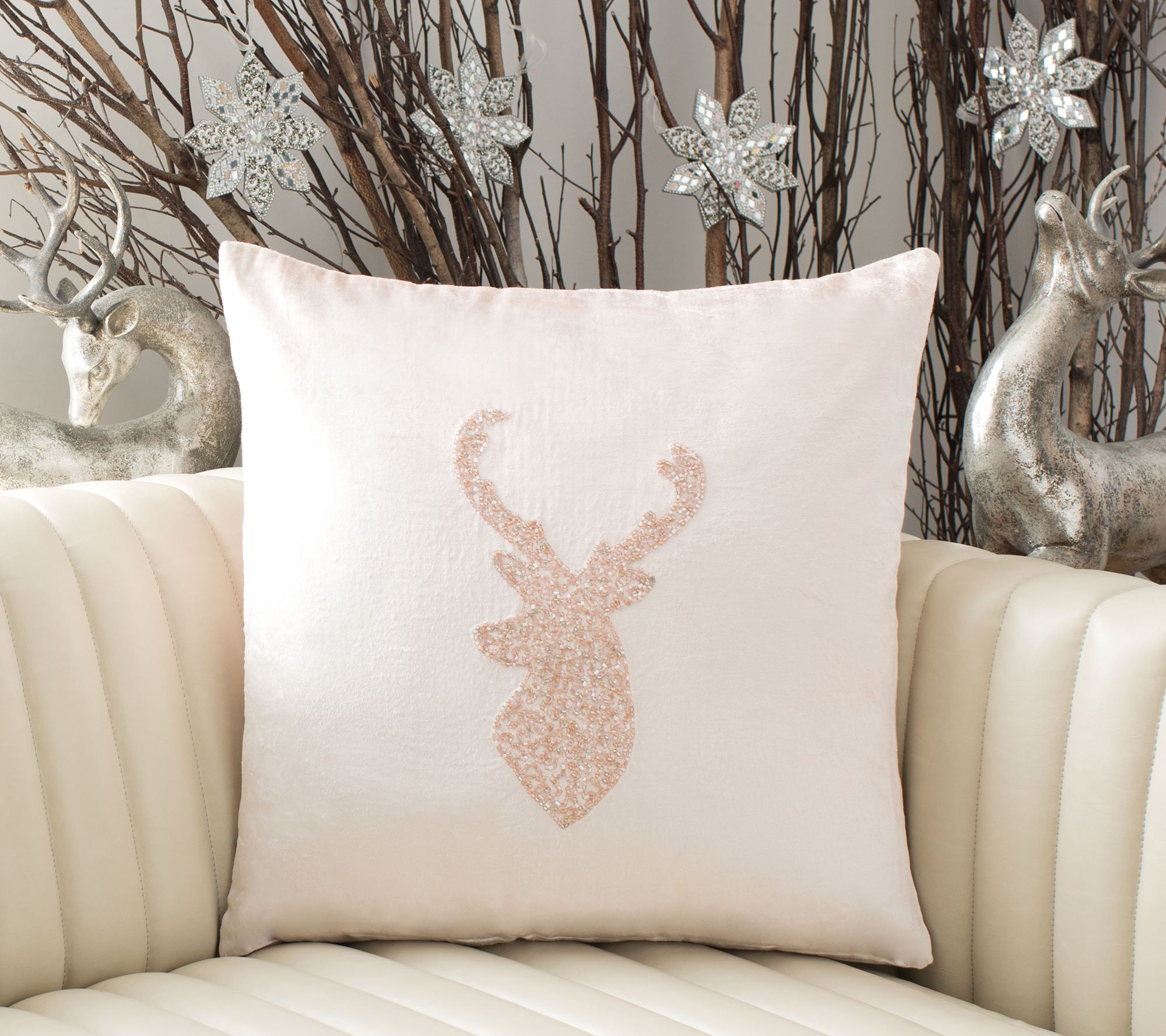 Paying homage to Santa's noble reindeer, this hint-of-glamor pillow is luxuriously soft in a blush velvet viscose with an iconic silhouette in meticulous, shining beadwork. From Safavieh.