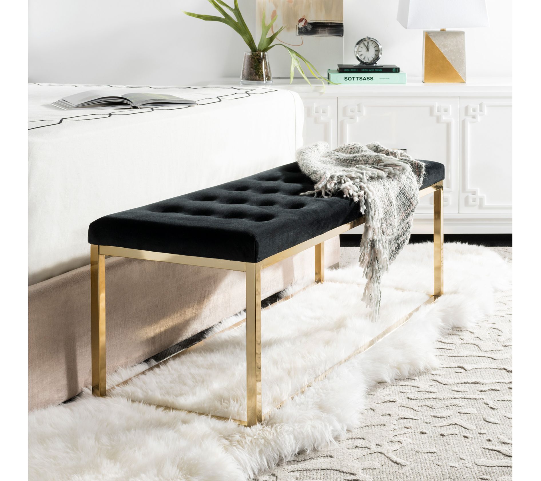 The hallmark of the Reynolds bench is its versatility--it's right at home in contemporary, industrial chic, and even transitional spaces, from entryways to bedrooms. Its comfortable tufted seat and Parsons legs exist in perfect harmony, making this piece an absolute must. From Safavieh.