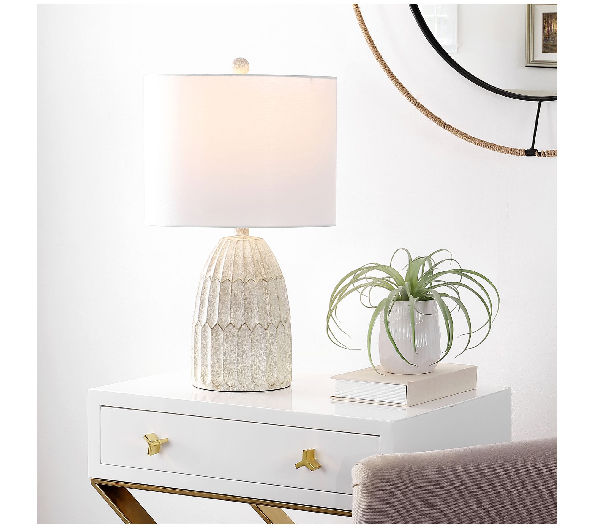Taking inspiration from ancient architecture, the Ronken table lamp is a must-have for the well-traveled collector thanks to its elegantly elongated textured hexagons, weathered finish, and fresh white cotton shade. From Safavieh.