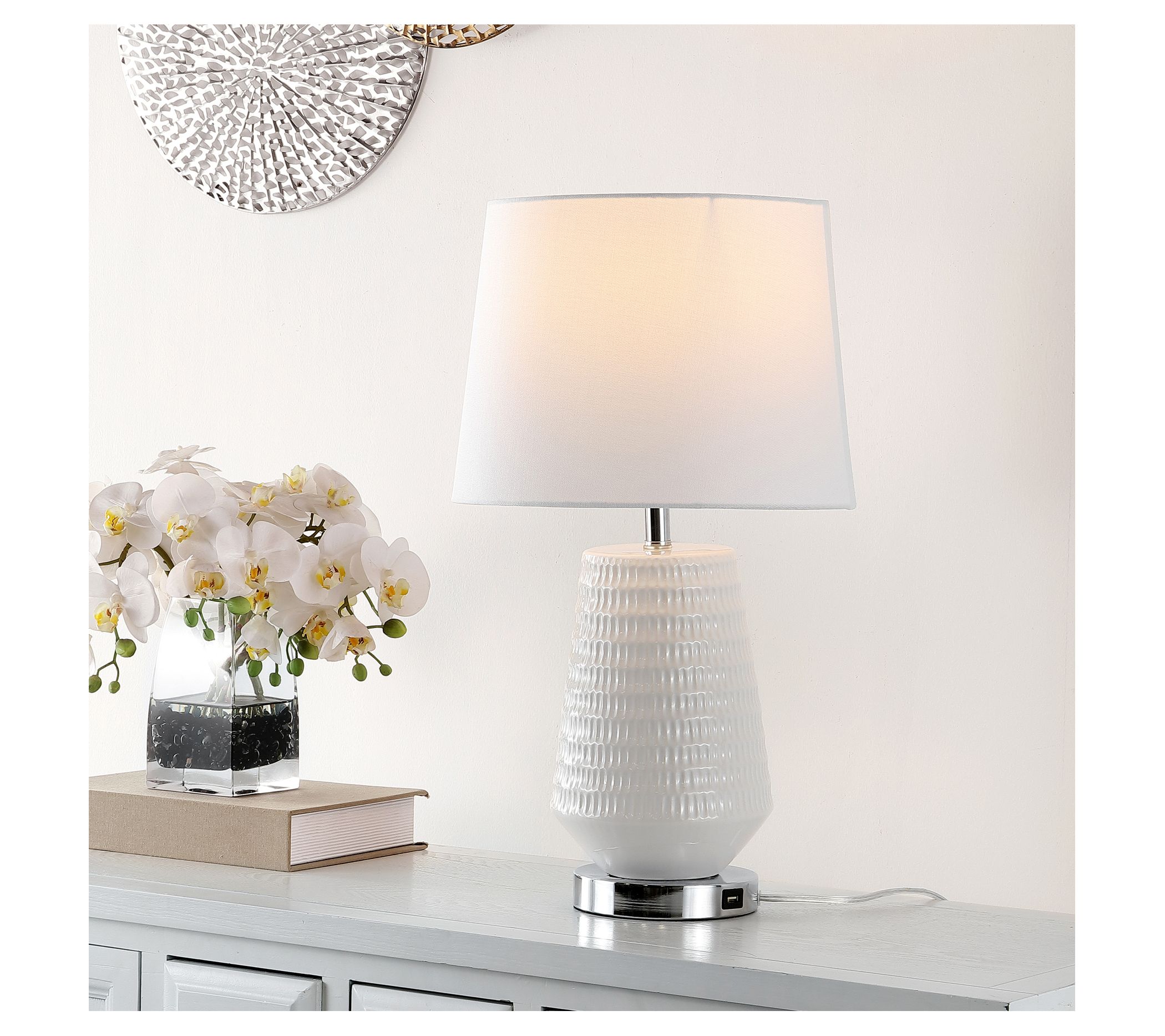 Inspired by the work of modern sculptors, this contemporary table lamp brings high style to your living room space. Crafted with a subtle, delicate texture, its clean finish is light and refreshing. Plus, the tapered 100% cotton shade casts a welcoming glow. From Safavieh.