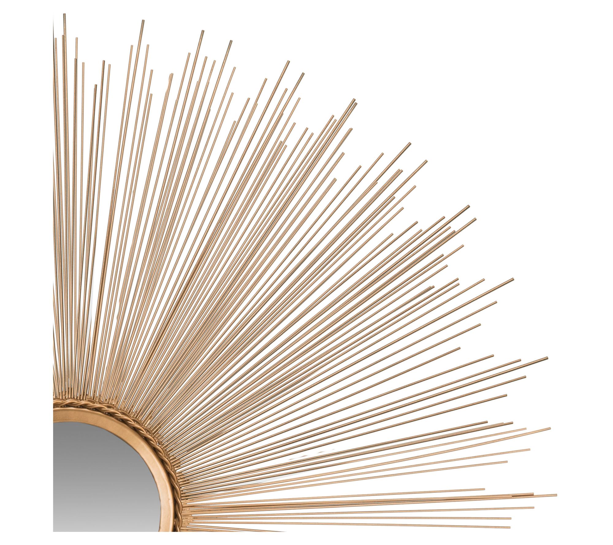 Showcasing delicate goldtone wire spokes radiating from a central disc, this sunburst mirror adds a shimmering touch of elegance and fun to your room. From Safavieh.