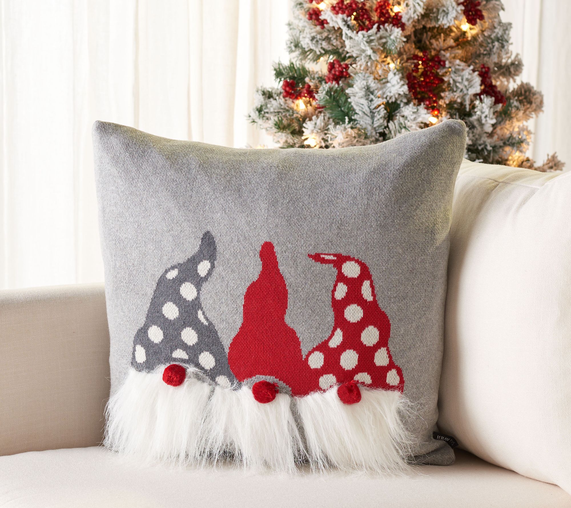 Celebrate the unsung heroes of the holiday season with the Trio Elves Pillow, featuring playful red pompom noses and textured fluffy white beards that bring a touch of whimsy to your festive decor. From Safavieh.