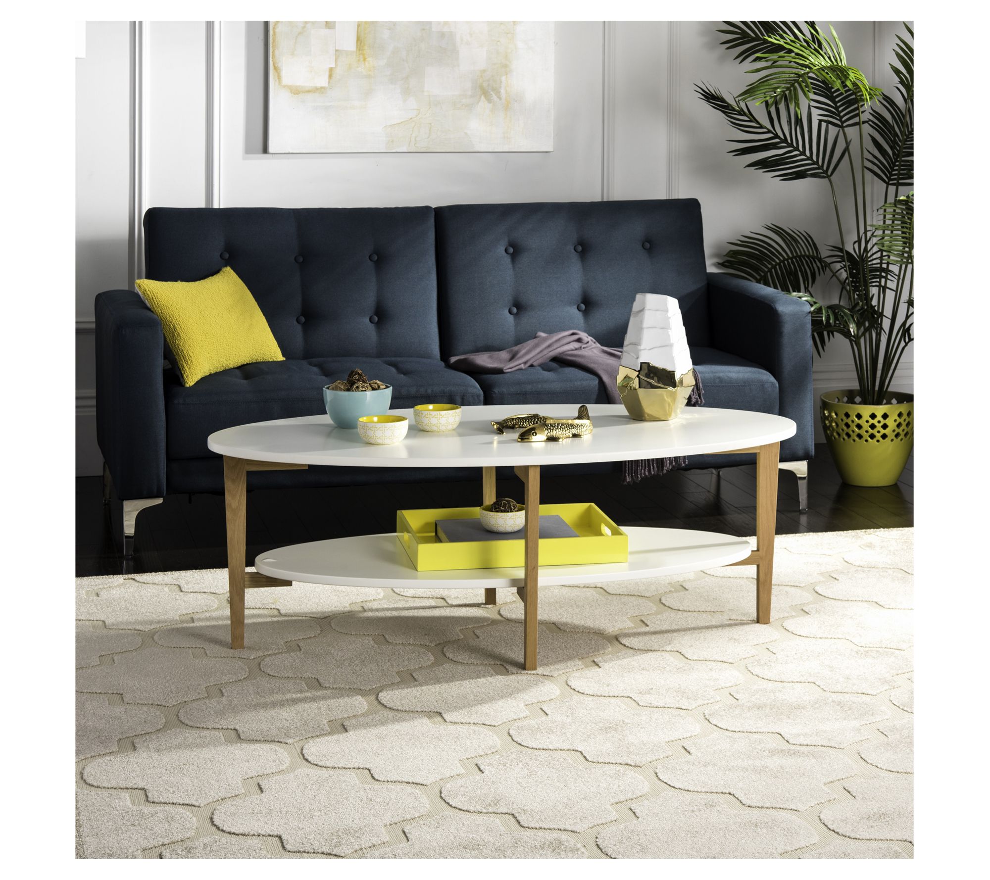 Transform your living space with the Safavieh Woodruff Oval Coffee Table, a piece that blends contemporary style with functional design. Inspired by iconic Finnish architecture, this table features a polished white and natural wood finish, offering two levels for stylish display and storage. From Safavieh.
