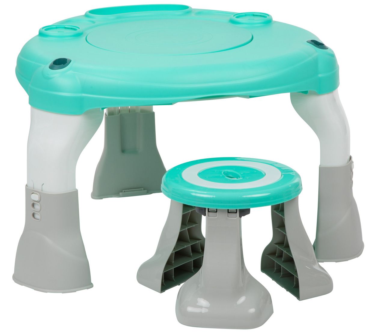 • Four-in-one design converts from an infant activity center to a baby balance board, toddler play table, and child activity table with stool