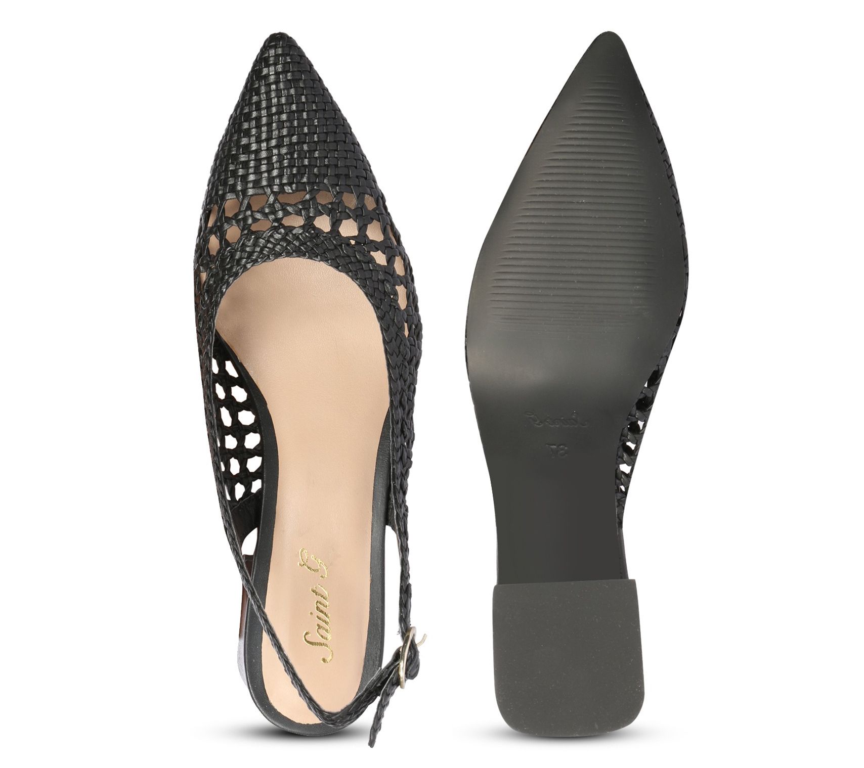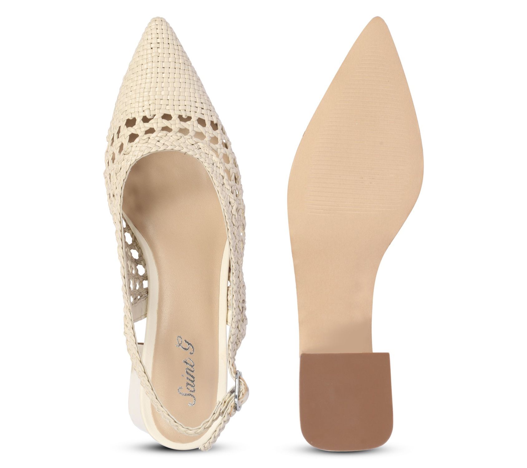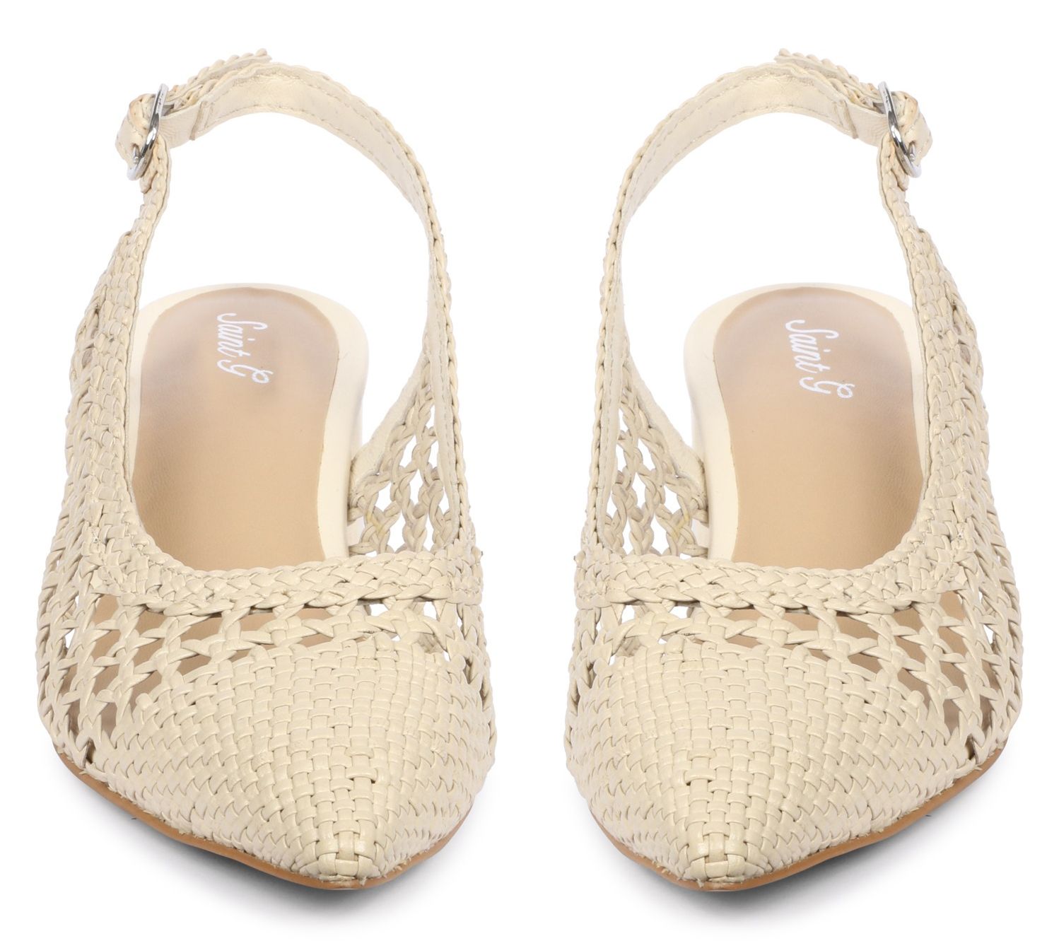 A day at the office, a lunch date, or an evening event -- these woven leather slingback pumps from Saint G fit seamlessly into your plans. The statement woven upper, combined with a pointed toe and a mid-block heel, adds an edgy touch to your attire. Designed with comfort in mind, they feature a padded leather footbed and a buckle-fastening strap for a secure fit. Effortlessly chic and versatile, they elevate any ensemble with ease. From Saint G.