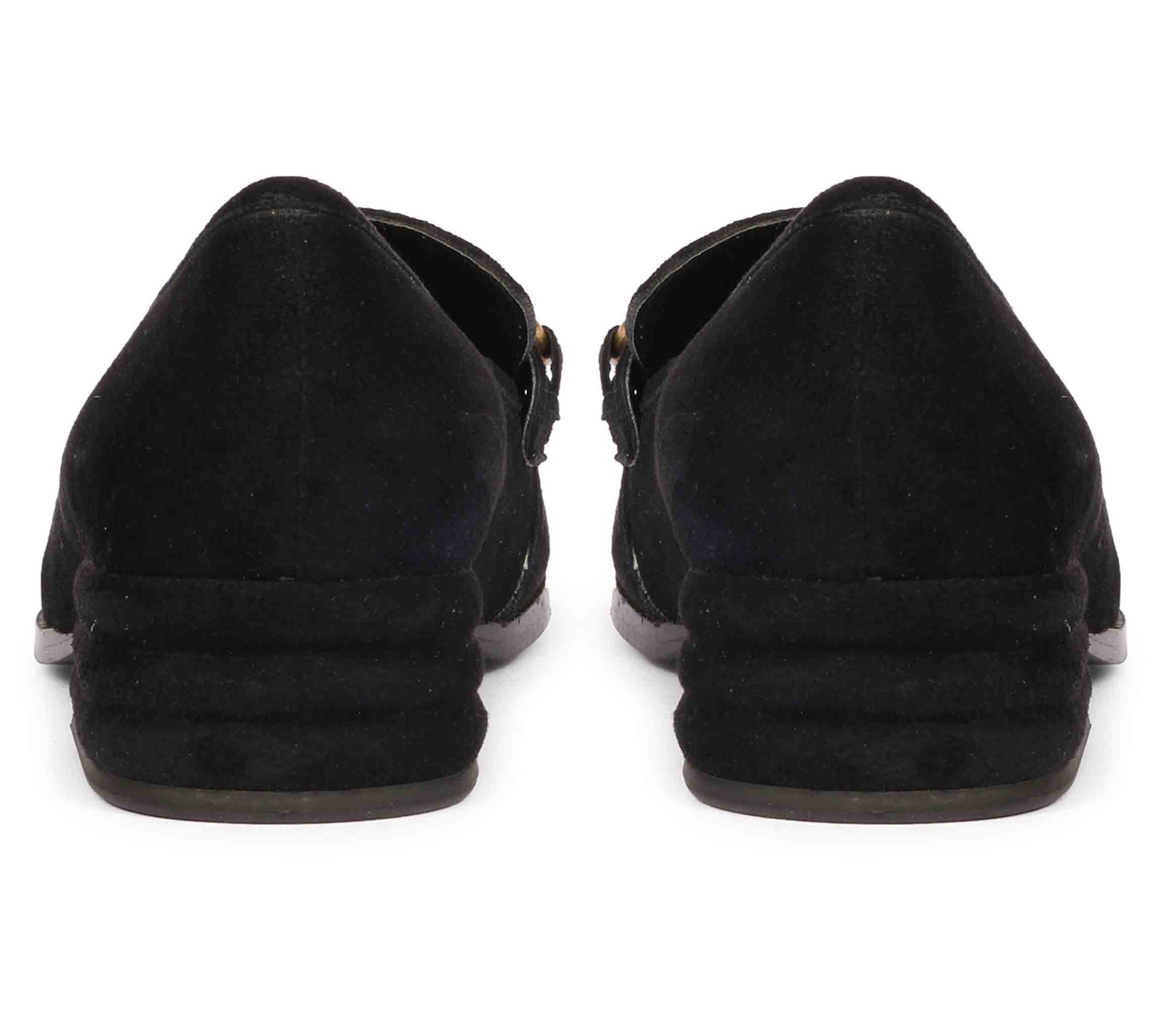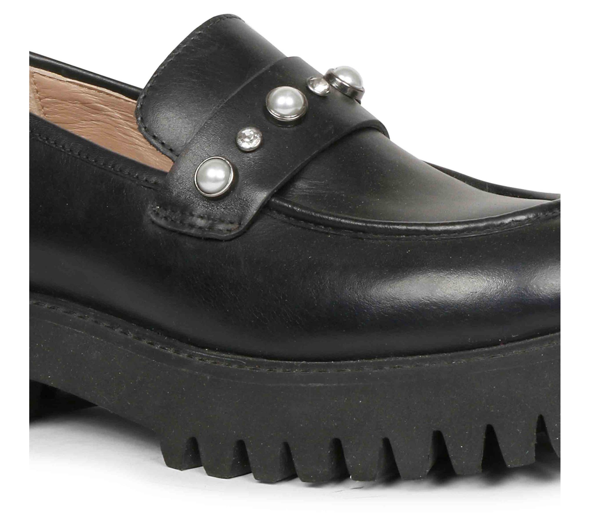 Slip-on design, leather upper, simulated pearl embellishment, rounded toe