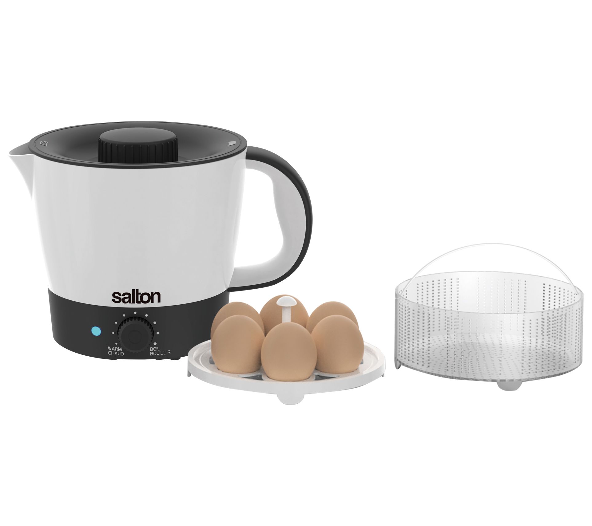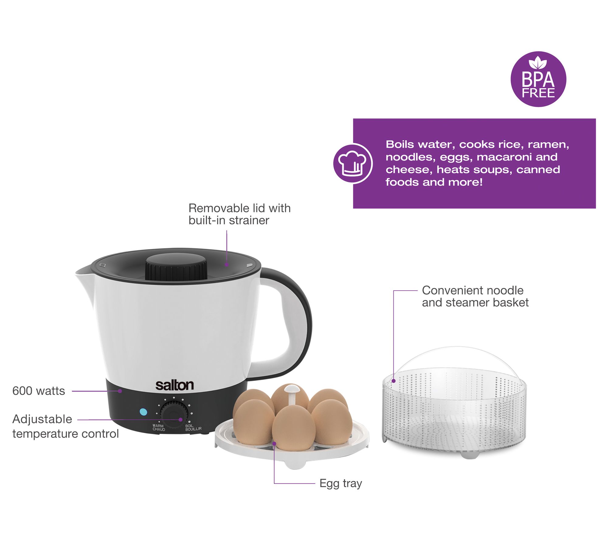 Make meal prep a breeze with the Salton 1.25L Multi-Pot Quick Meal Maker. This versatile kitchen essential lets you cook, reheat, or steam a variety of dishes, from ramen and rice to soups and eggs. Its adjustable temperature control and removable lid with a built-in strainer make it easy to use and clean. From Salton.
