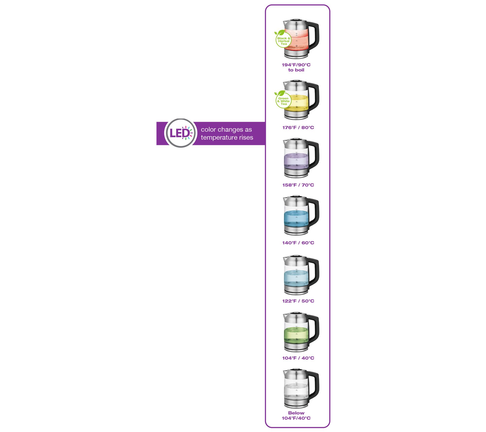 Brew your favorite tea at the perfect temperature with this high-tech kettle featuring an LED indicator that lets you see boiling progress at a glance. From Salton Appliances.
