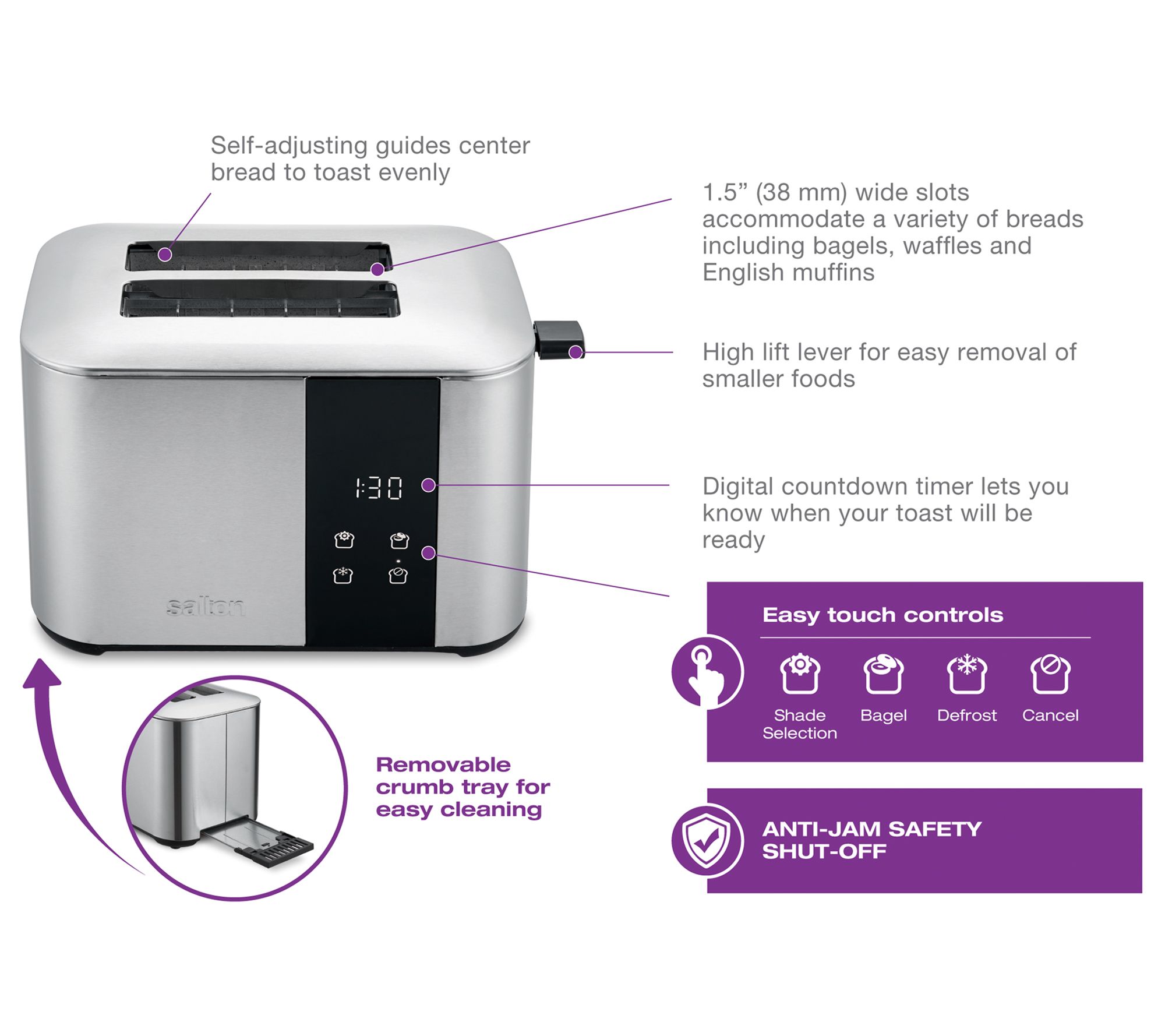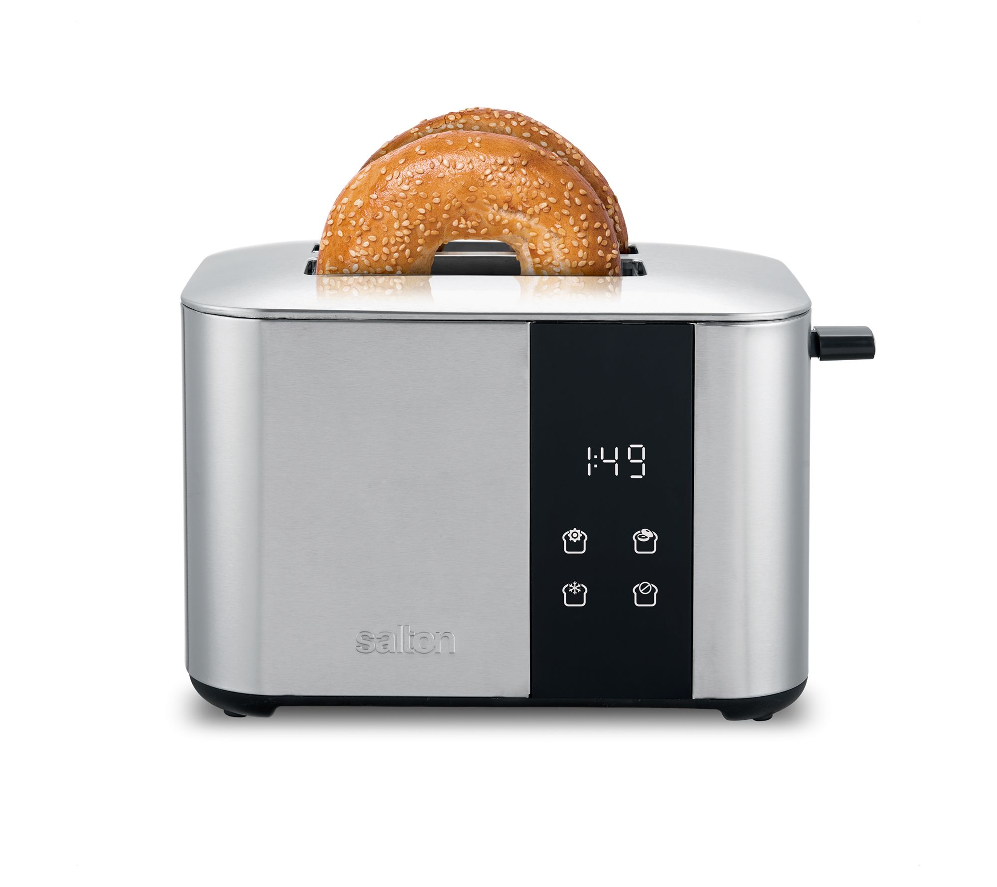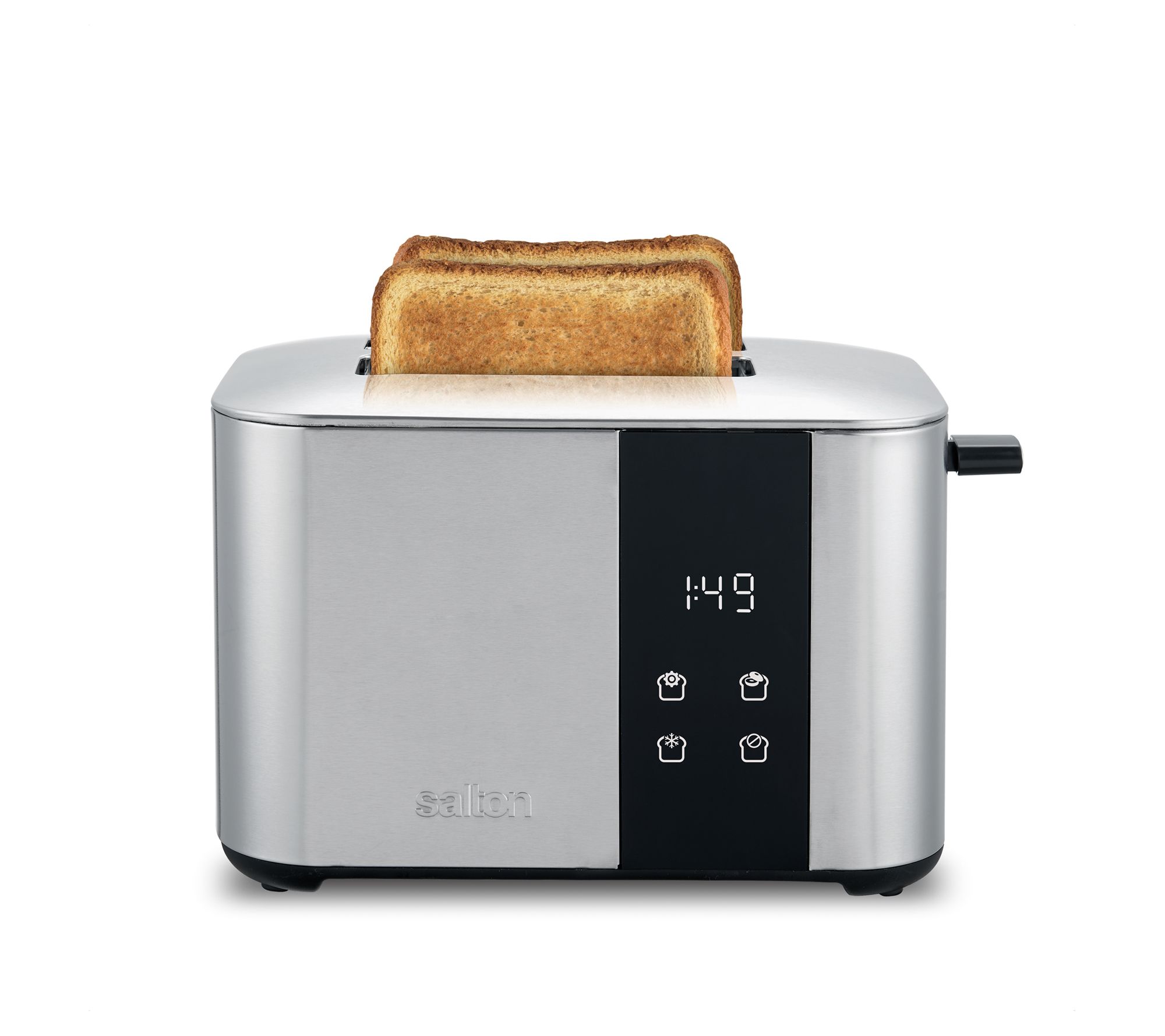 Enjoy perfectly toasted bread every morning with the Salton stainless steel 2-slice digital countdown toaster. Its digital countdown timer and easy touch controls for bagel, defrost, and cancel functions make breakfast a breeze. The 1.5" wide slots accommodate a variety of breads, including bagels and waffles, while the high lift lever ensures easy removal of smaller foods. From Salton.