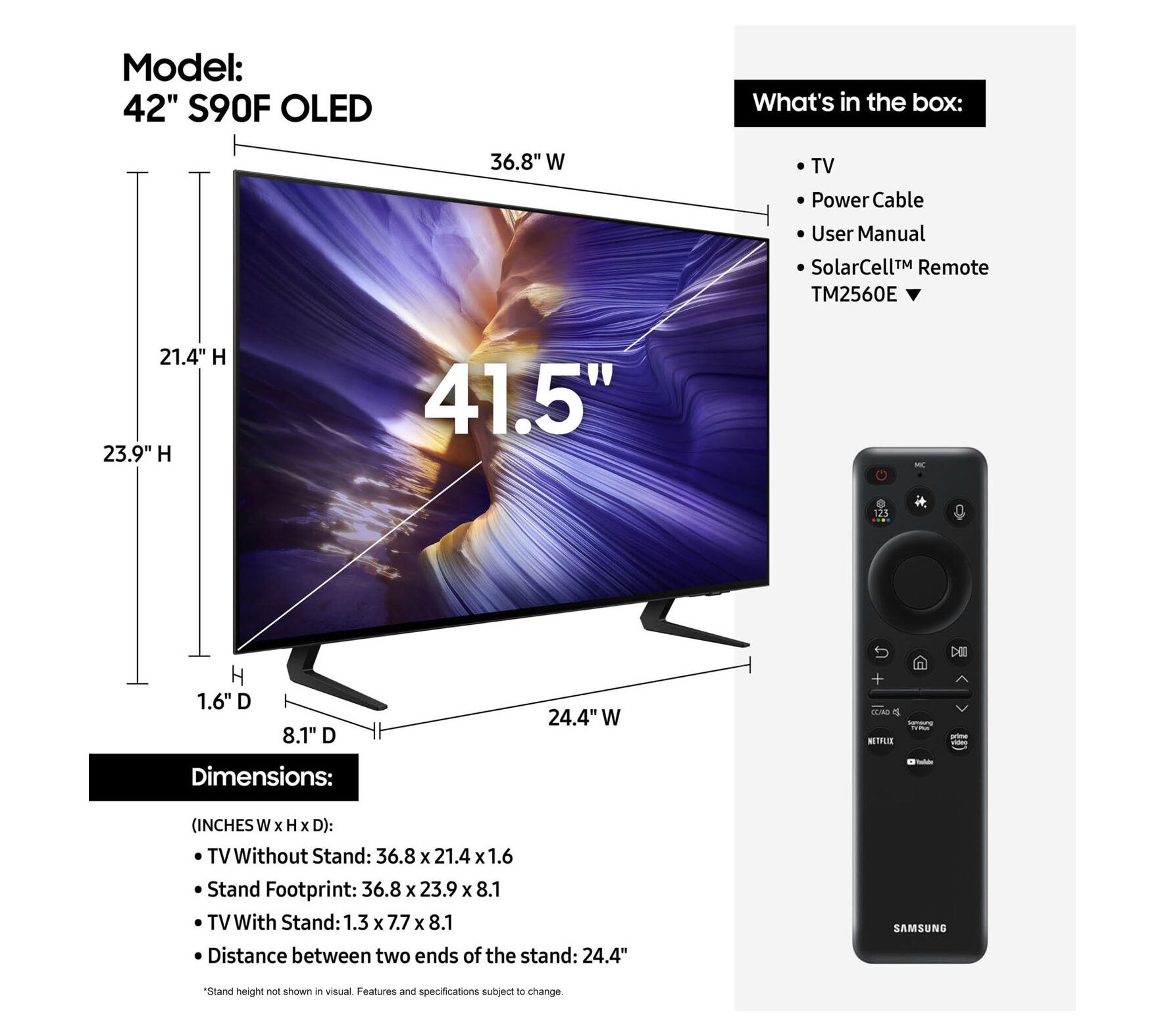 Includes 42S9D S90 Smart TV, stand, power cable, remote control, two AAA batteries, manual, and quick start guide