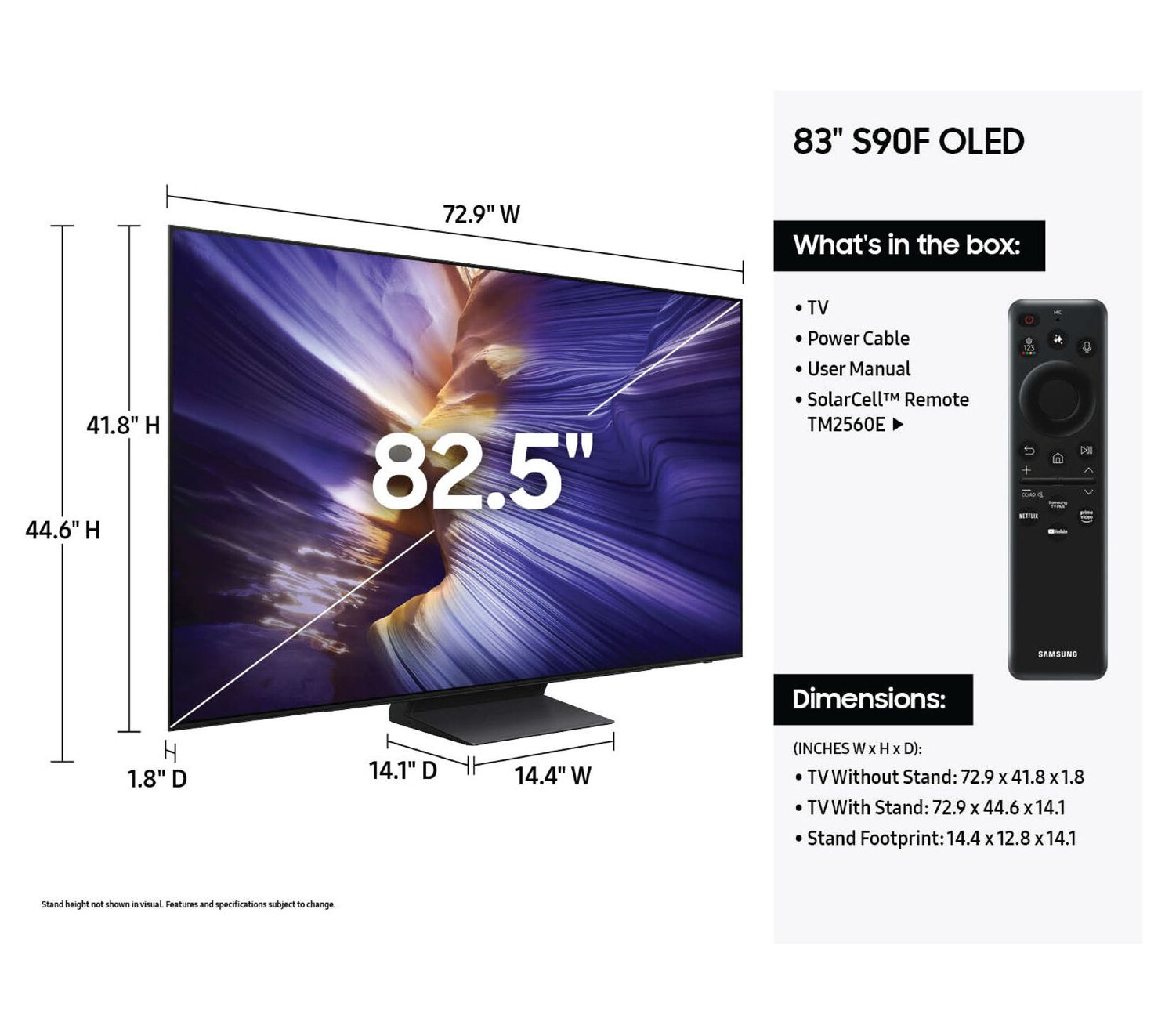 • Approximate measurements: With stand 72.87" x 41.84" x 14.13", weighs 86.4 lbs; Without stand 72.87" x 41.85" x 1.77", weighs 82.89 lbs