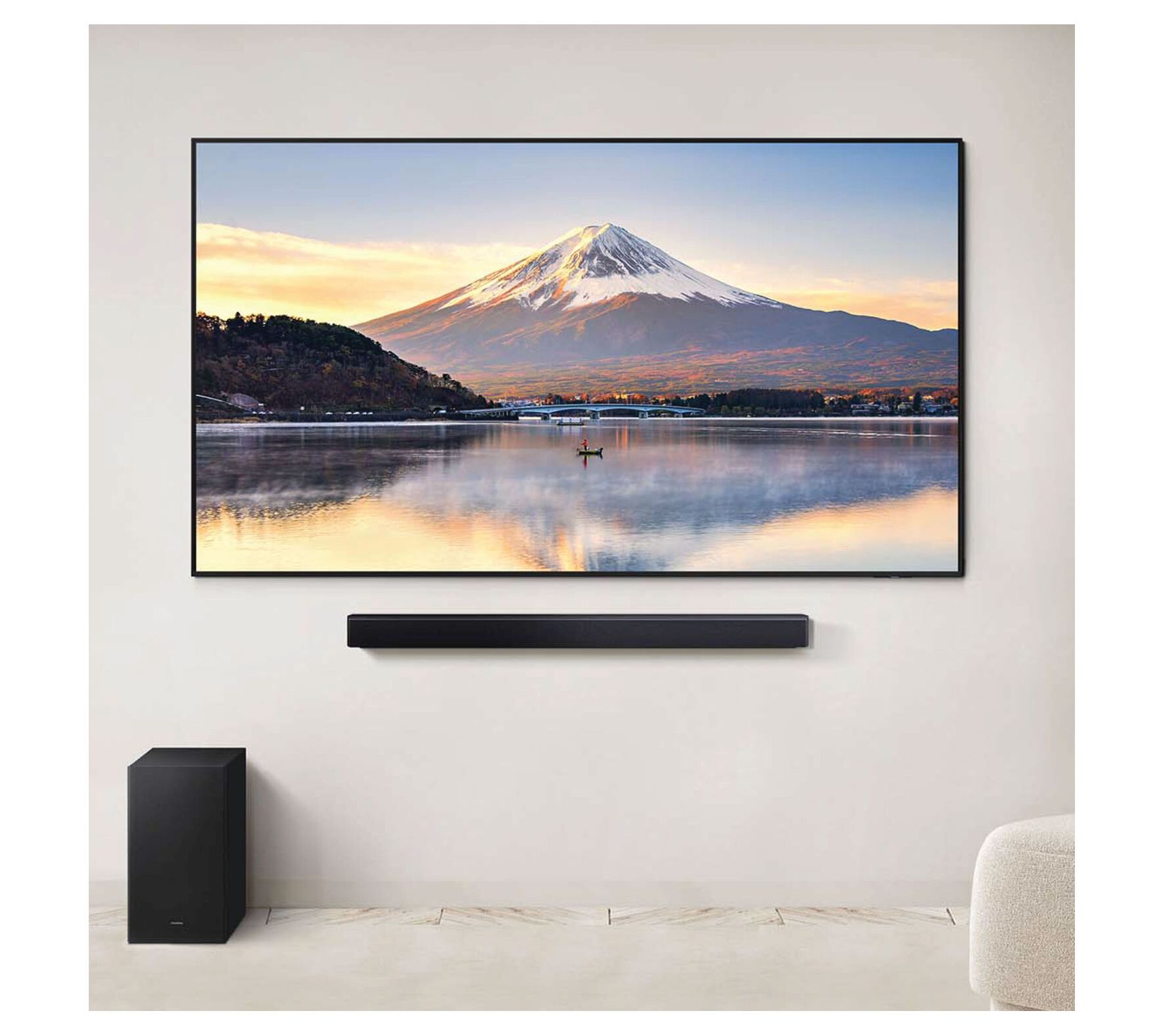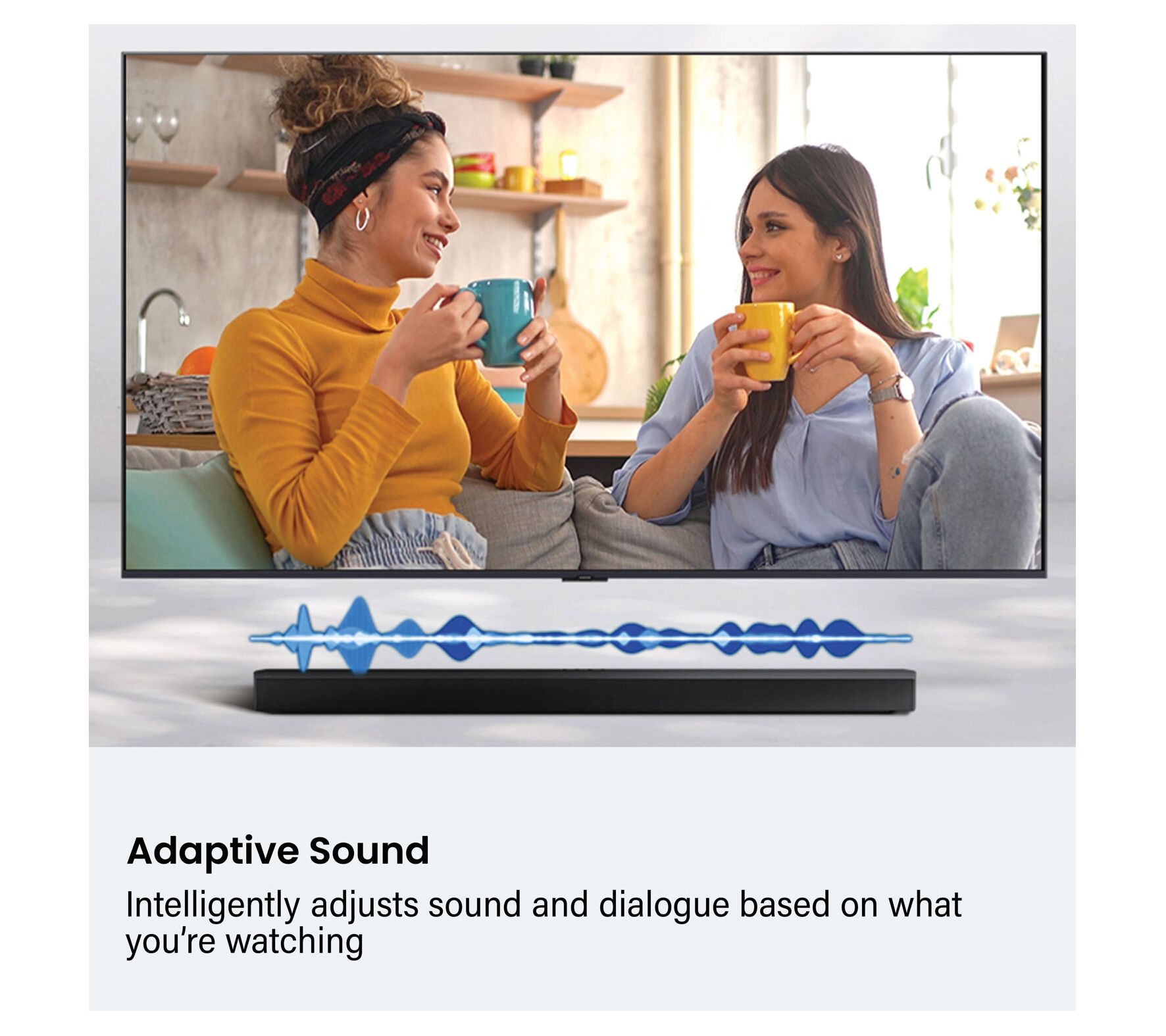 Movie night gets a serious upgrade with the Samsung B550 2.1-channel soundbar and subwoofer, featuring a sleek design that slides easily beneath your TV. Feel the thrill of room-filling sound with impressive bass, while Game Mode and Adaptive Sound help tailor audio to every scene or match. Bluetooth connectivity lets you pair your TV wirelessly for hassle-free setup and a cleaner look. From Samsung.