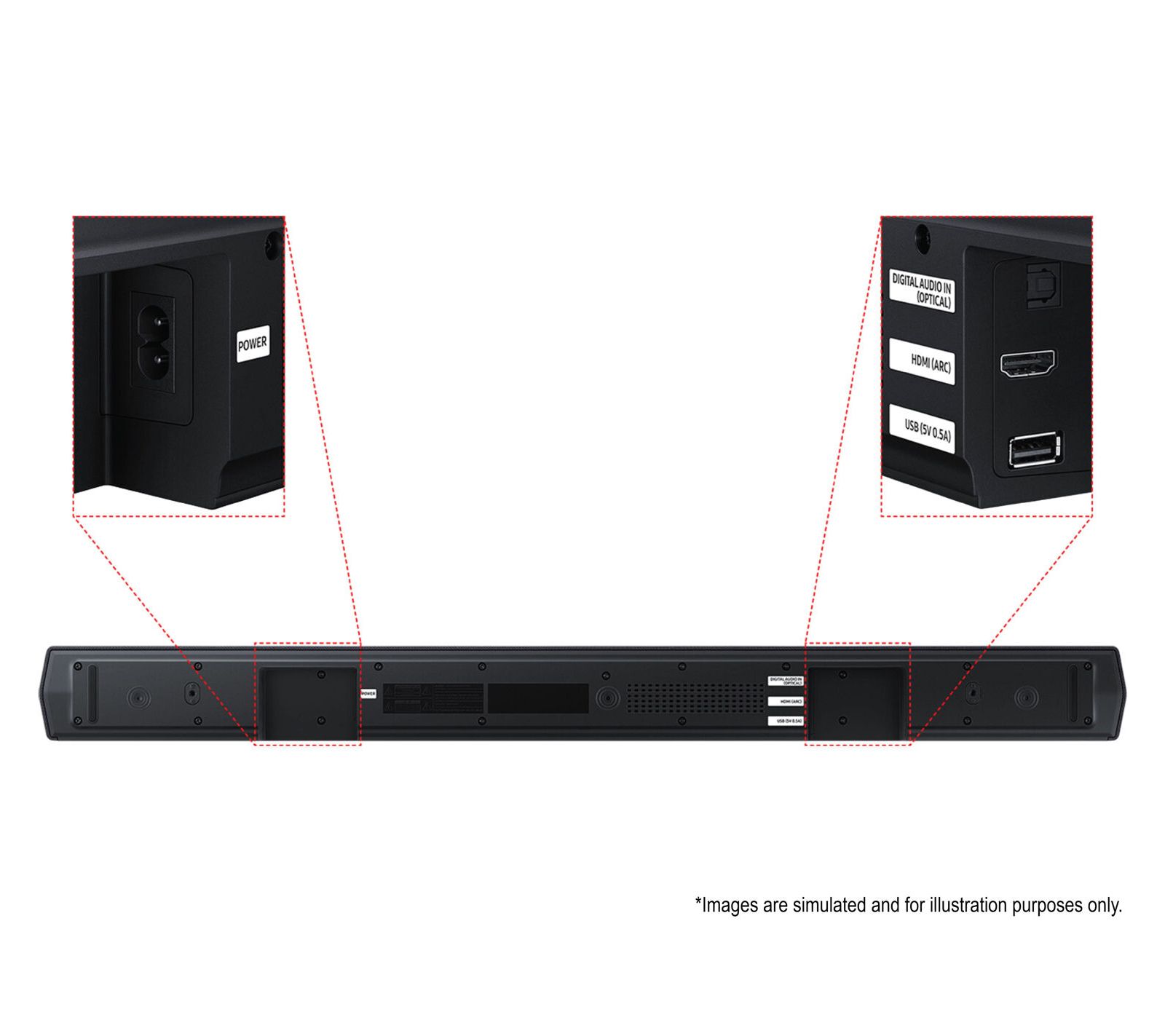 Includes B550 soundbar, subwoofer, remote control, 2 AAA batteries, wall mount kit, and optical cable