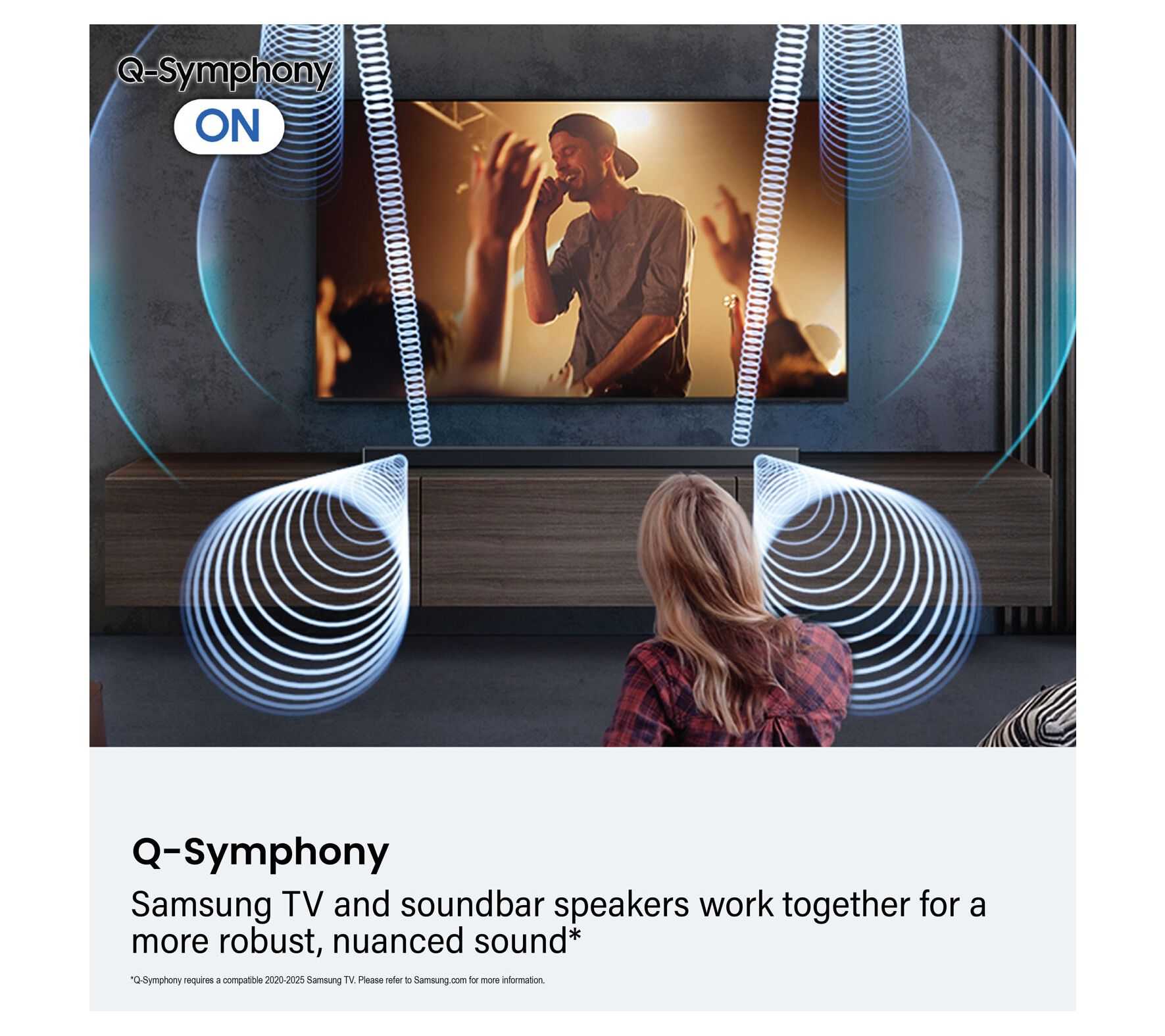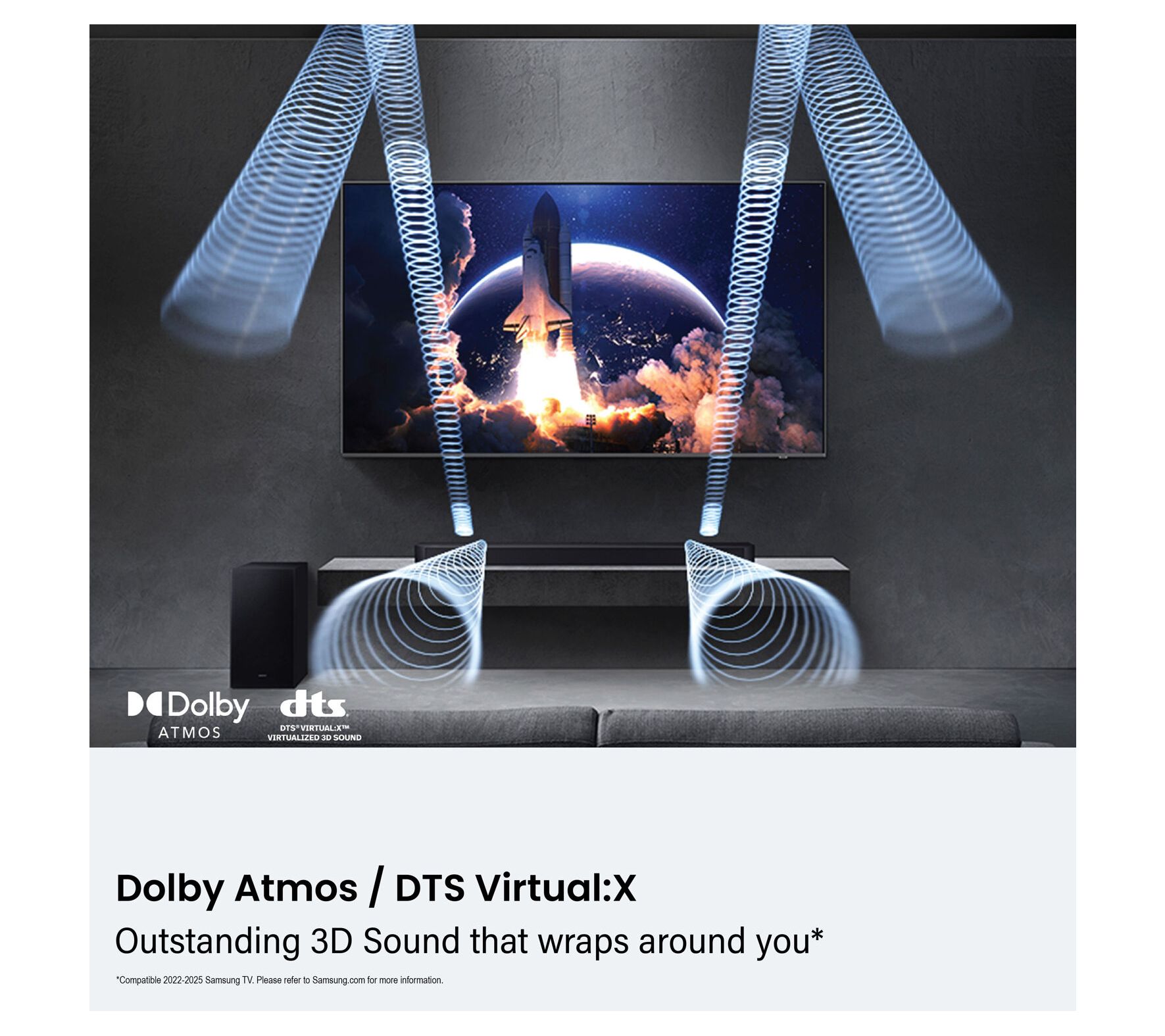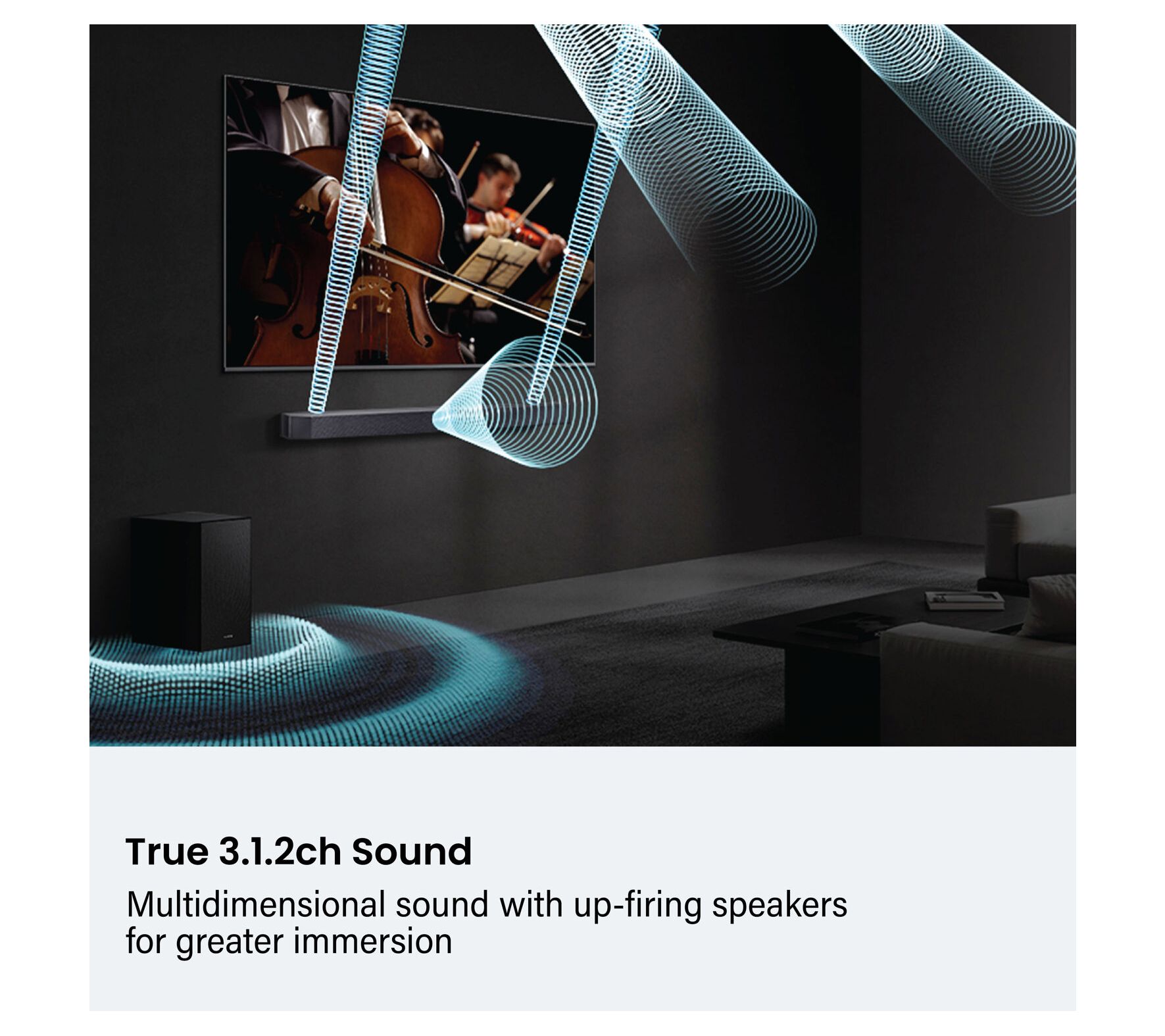 Transform movie nights with Samsung's Q-600 3.1.2-channel soundbar, featuring a sleek, low-profile silhouette that blends into any living space. Dive into cinematic sound with Dolby Atmos and DTS Virtual:X, feeling every explosion and whisper swirl around you. Connect wirelessly via Bluetooth wireless technology and enjoy powerful, adaptive audio that calibrates to your room, making every seat the best seat. From Samsung.