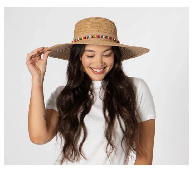 Enjoy the sunshine while staying stylish with the Fiesta Round Crown Large Brim Sun Hat. Crafted to keep you cool and protected, its ultrabraid material and wide brim offer sun protection. The colorful tonal grosgrain band and wood bead chain add a playful touch, making it perfect for spring and summer outings. From San Diego Hat Co.