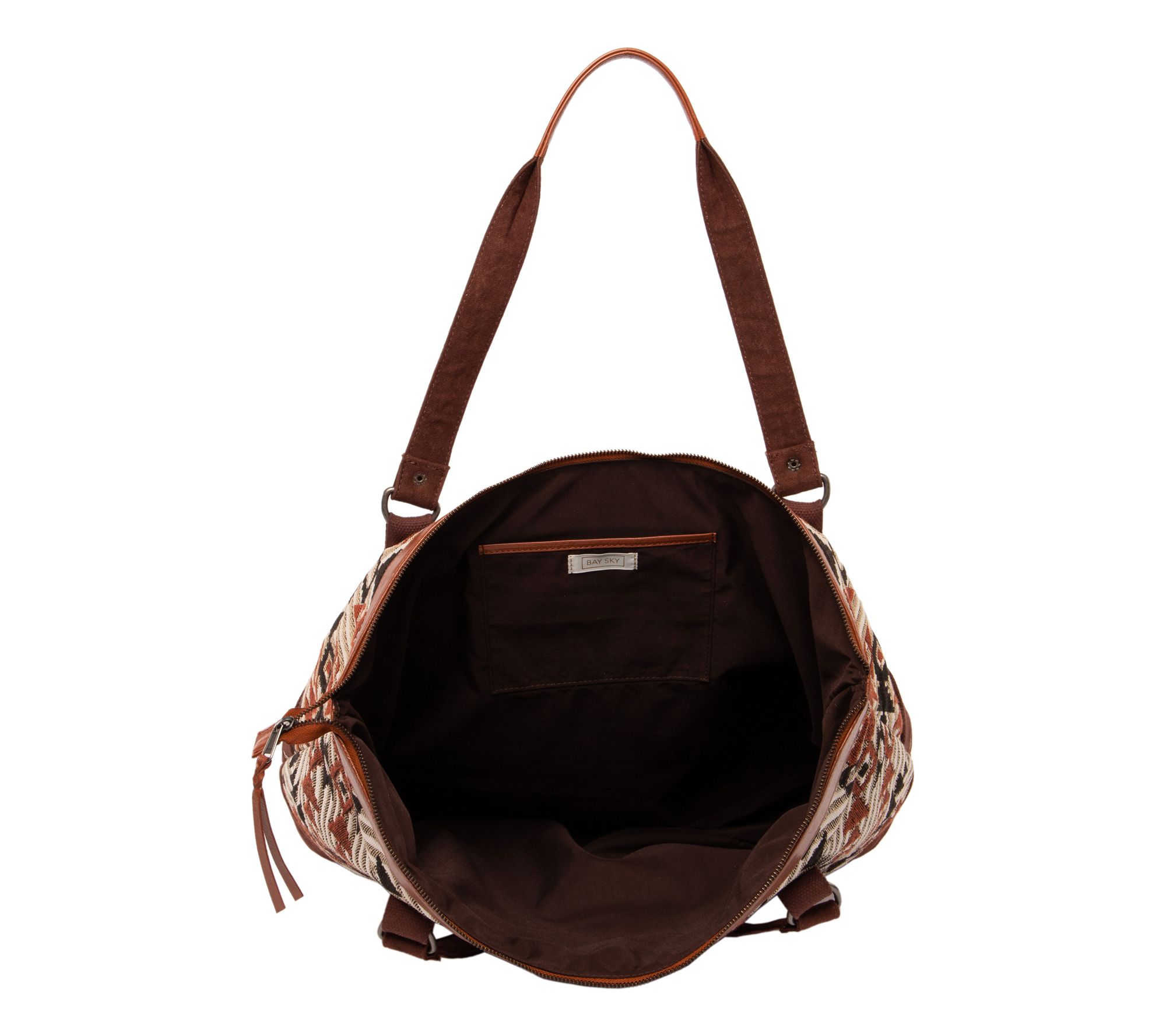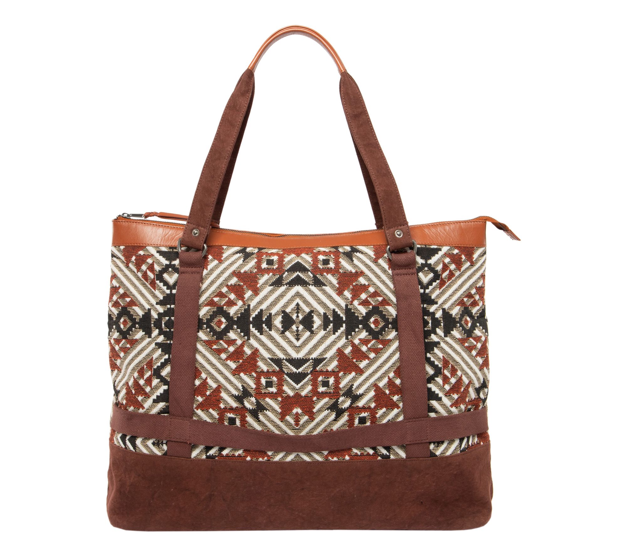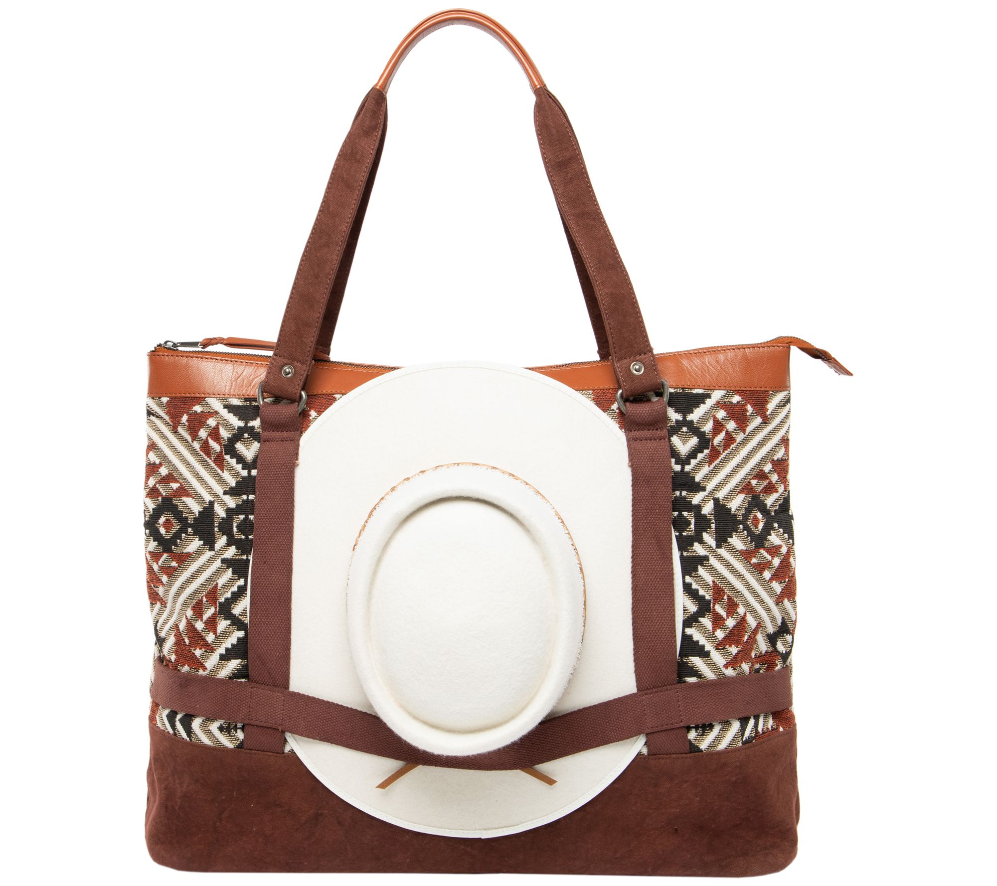 A multicolored masterpiece, this Emma Tote combines a tapestry fabrication with leather trim. A convenient back luggage slip and unique hat holder adds a fashionable touch, making it a perfect pick-up for your travel plans. From San Diego Hat Co.