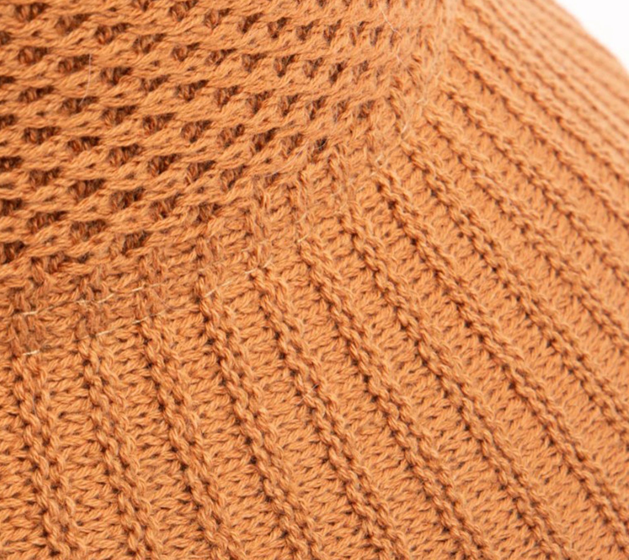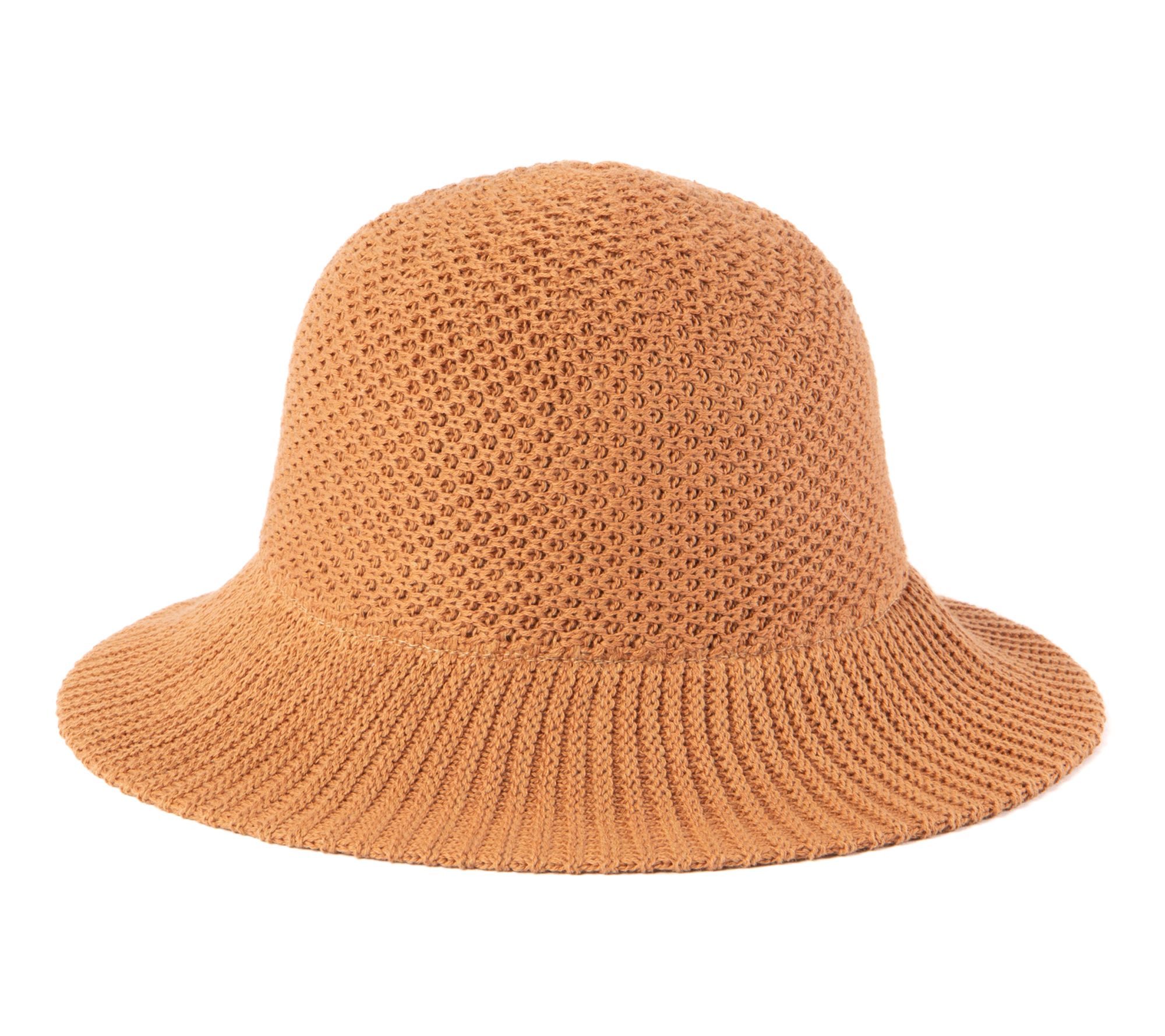Design details: unstructured bucket hat, machine-knit, tan color, 3-inch brim, versatile style