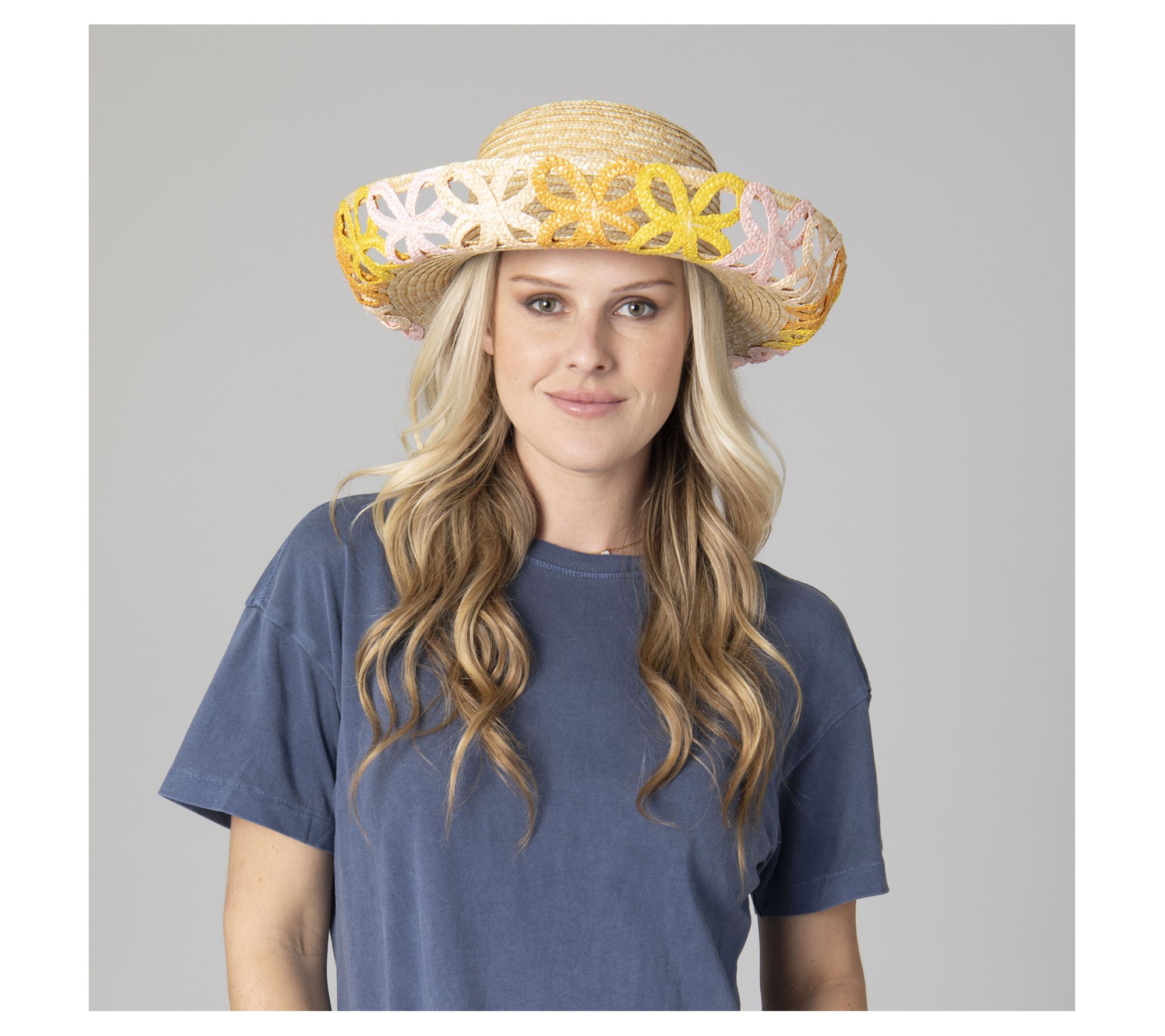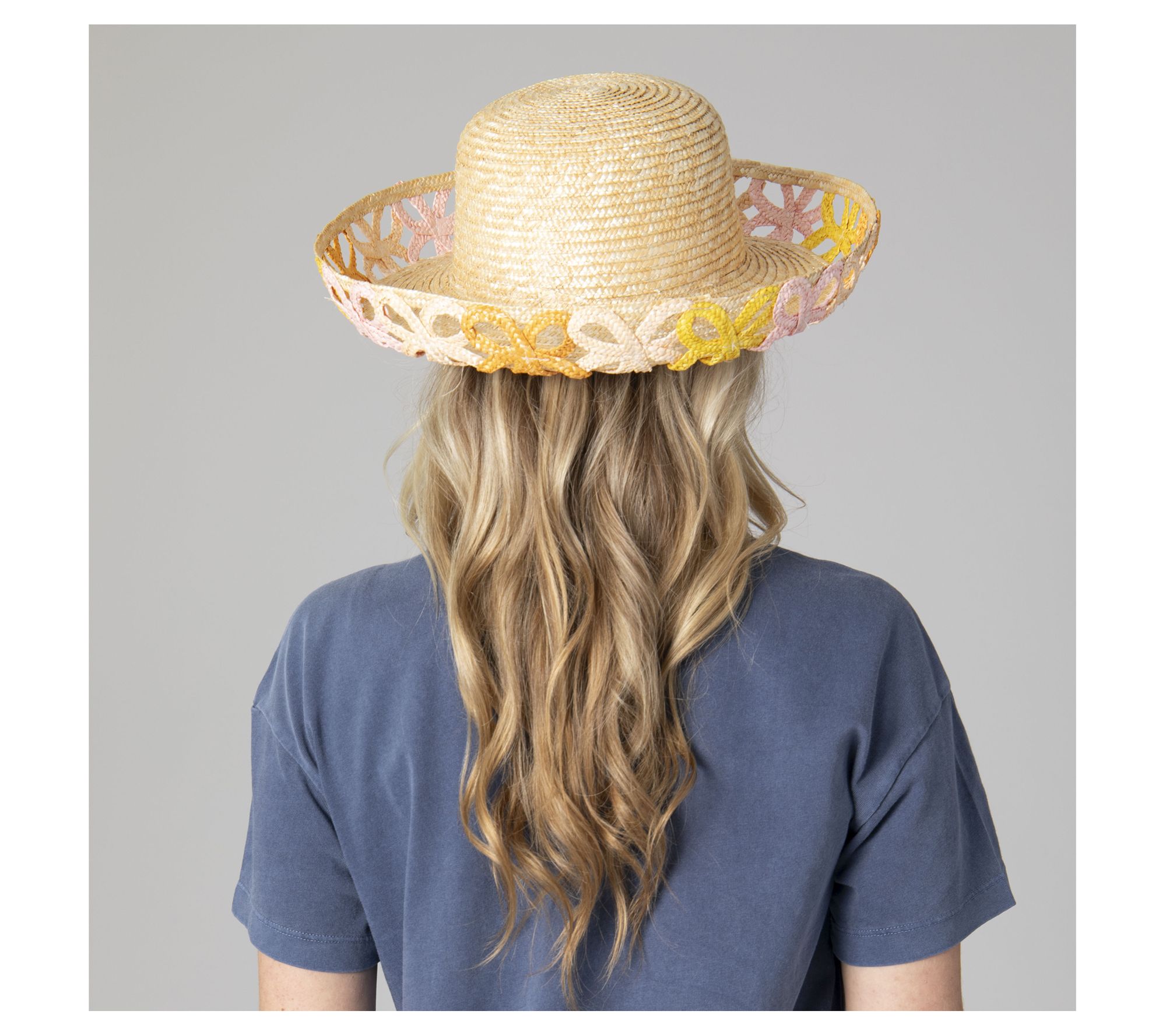 Make turning heads an art form with the Positano straw hat! Crafted from 100% wheat straw and embellished with a pastel ribbon pattern, this hat adds a pop of panache to your wardrobe. Perfect for spring and summer, it easily adjusts to fit most head sizes. From San Diego Hat Co.