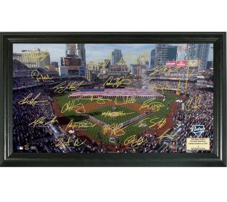 Home field advantage. Pay tribute to the ballpark of your beloved San Diego Padres with this winning collectible. Bordered by a wooden frame, it showcases a photo of Petco Park along with facsimile signatures of Padres players. From the Highland Mint.
