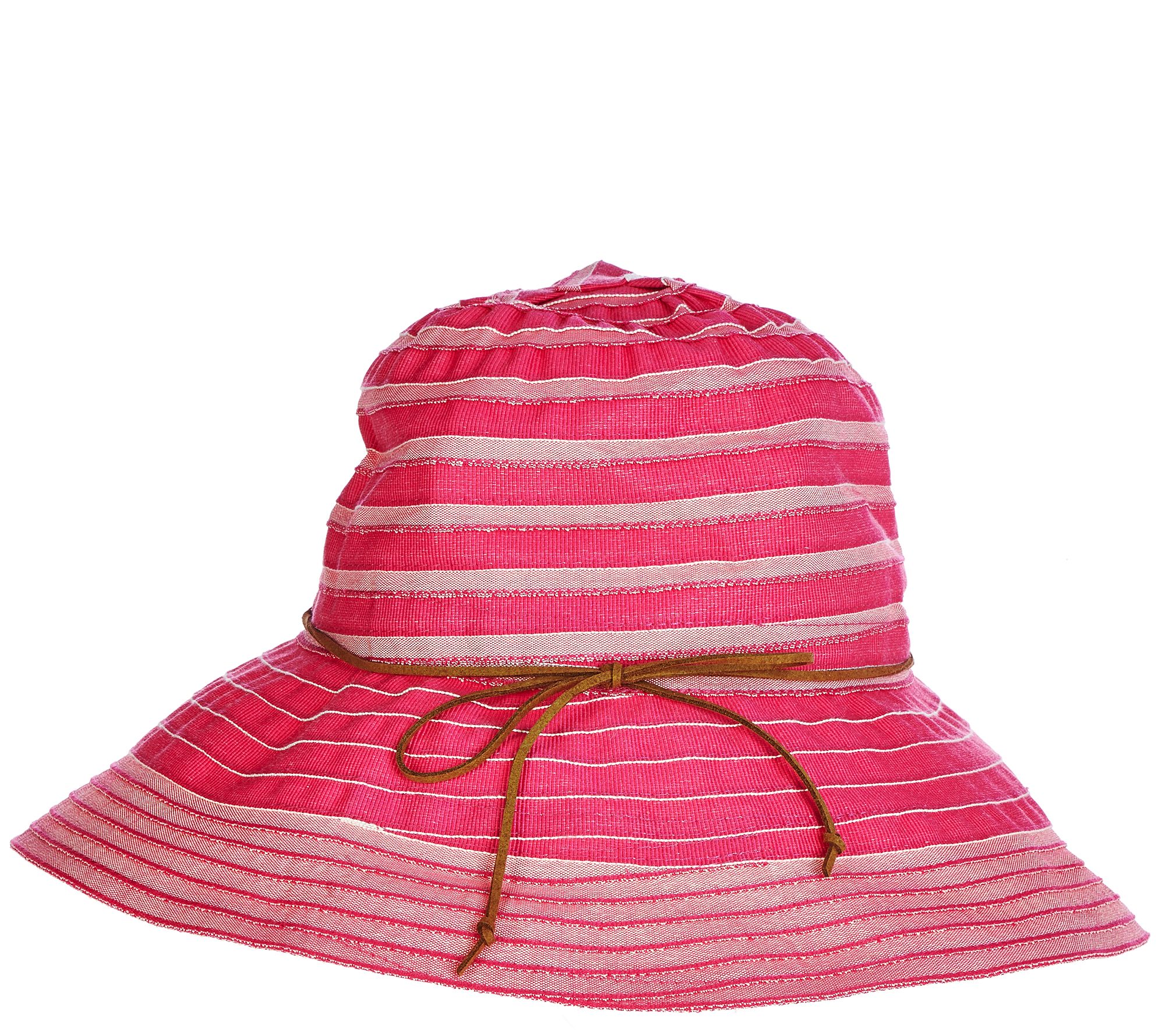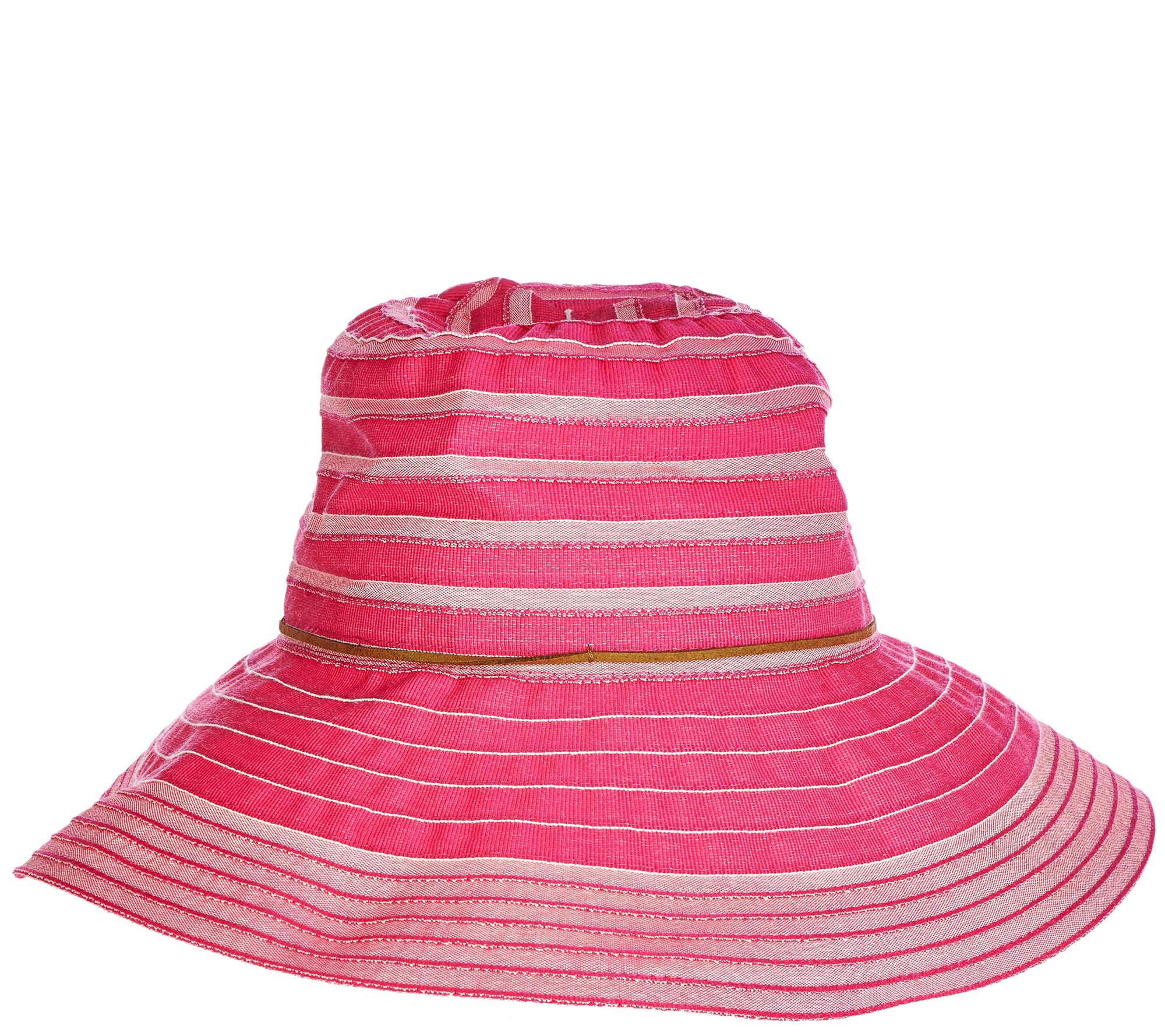 • Features: two-tone ribbon design, collapsible design, faux leather detailing, UPF 50+ sun protection