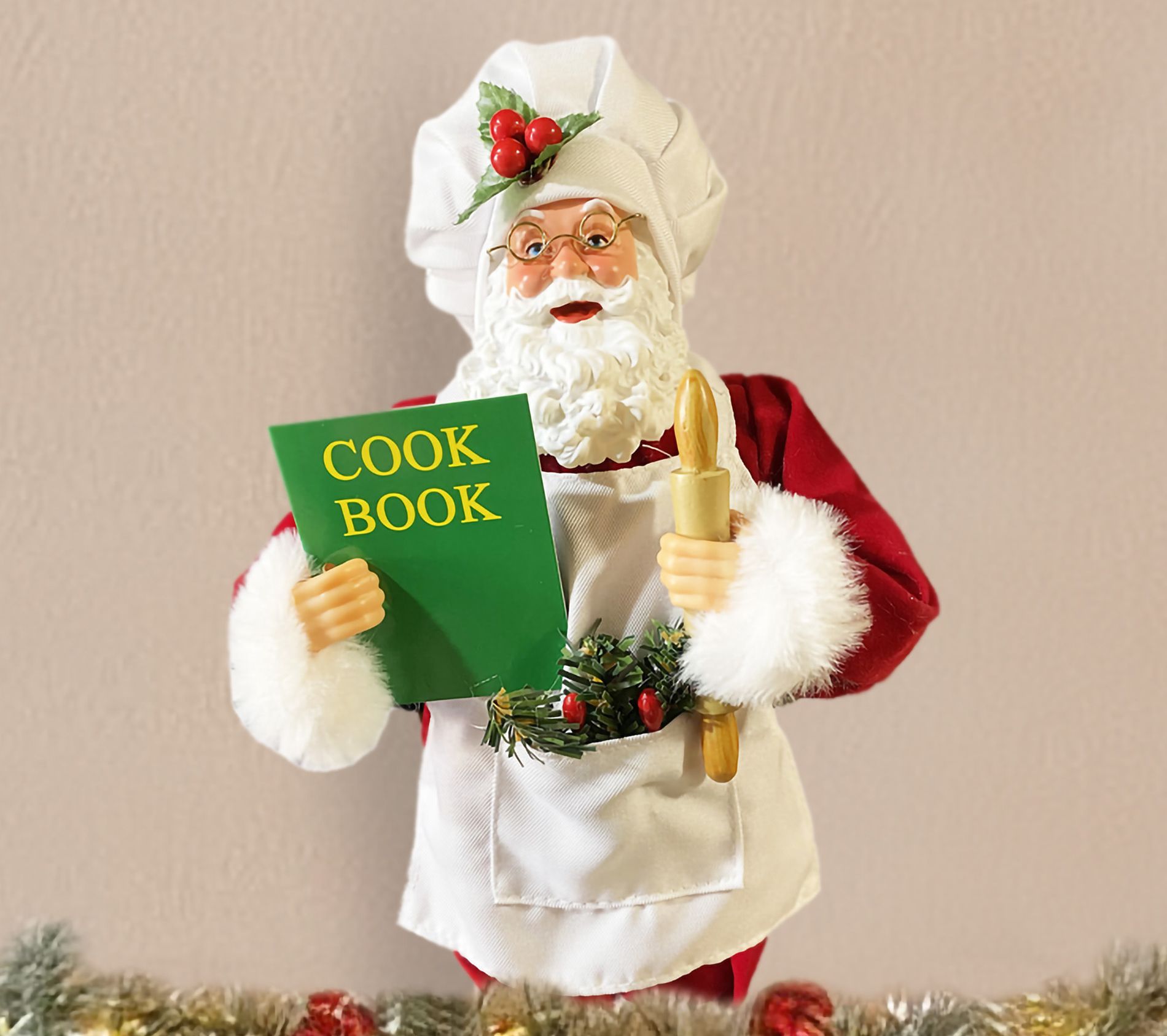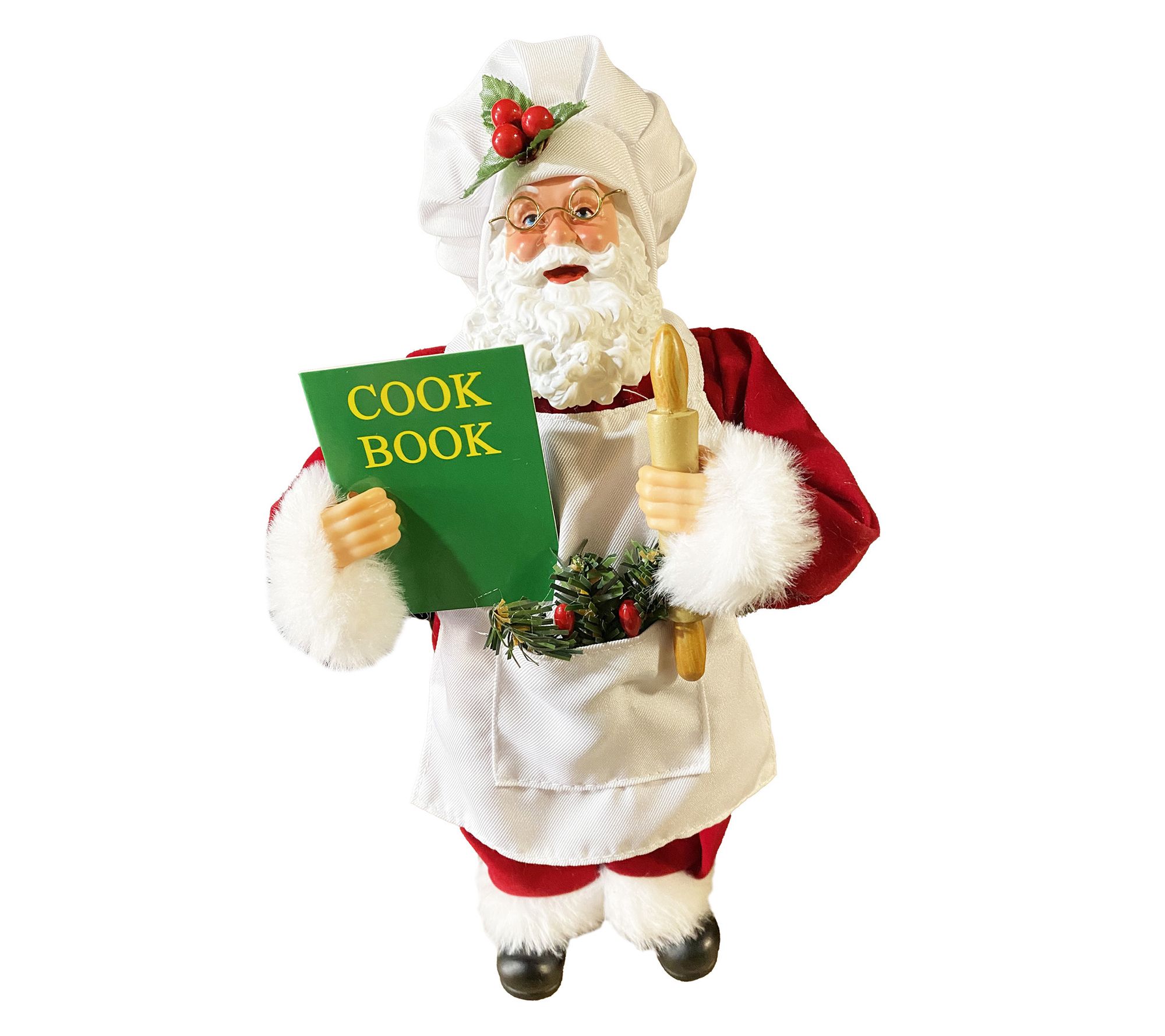 Who's that baking up sweet treats in your kitchen? It's that jolly baker Claus! Santa is hard at work, rolling up his sleeves and collecting his treasured recipes for festive favorites. Holding a rolling pin and cookbook, he adds a whimsical touch to any holiday gathering and will surely inspire smiles as you whip up your favorite holiday confections. Made with detailed craftsmanship, this cheerful figure promises charm and joy for many holiday seasons ahead. From Santa's Workshop.