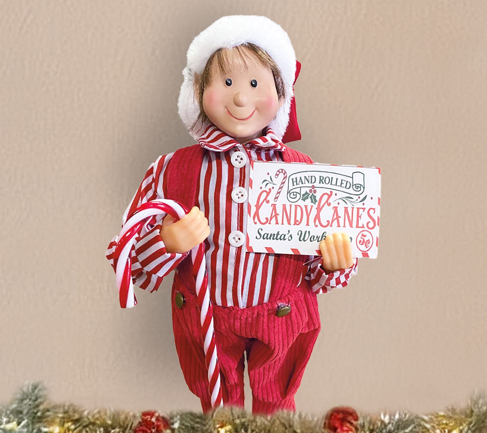 As the holiday season approaches, brighten your home with joy and charm by adding a whimsical elf into the mix. Delight guests with this spirited figure dressed in candy cane stripes, showcasing holiday cheer as he holds a festive treat in one hand and a colorful advertisement in the other. Whether perched on a shelf or nestled amongst your other decorations, this enchanting elf promises to bring smiles and capture the spirit of Christmas year after year. From Santa's Workshop.