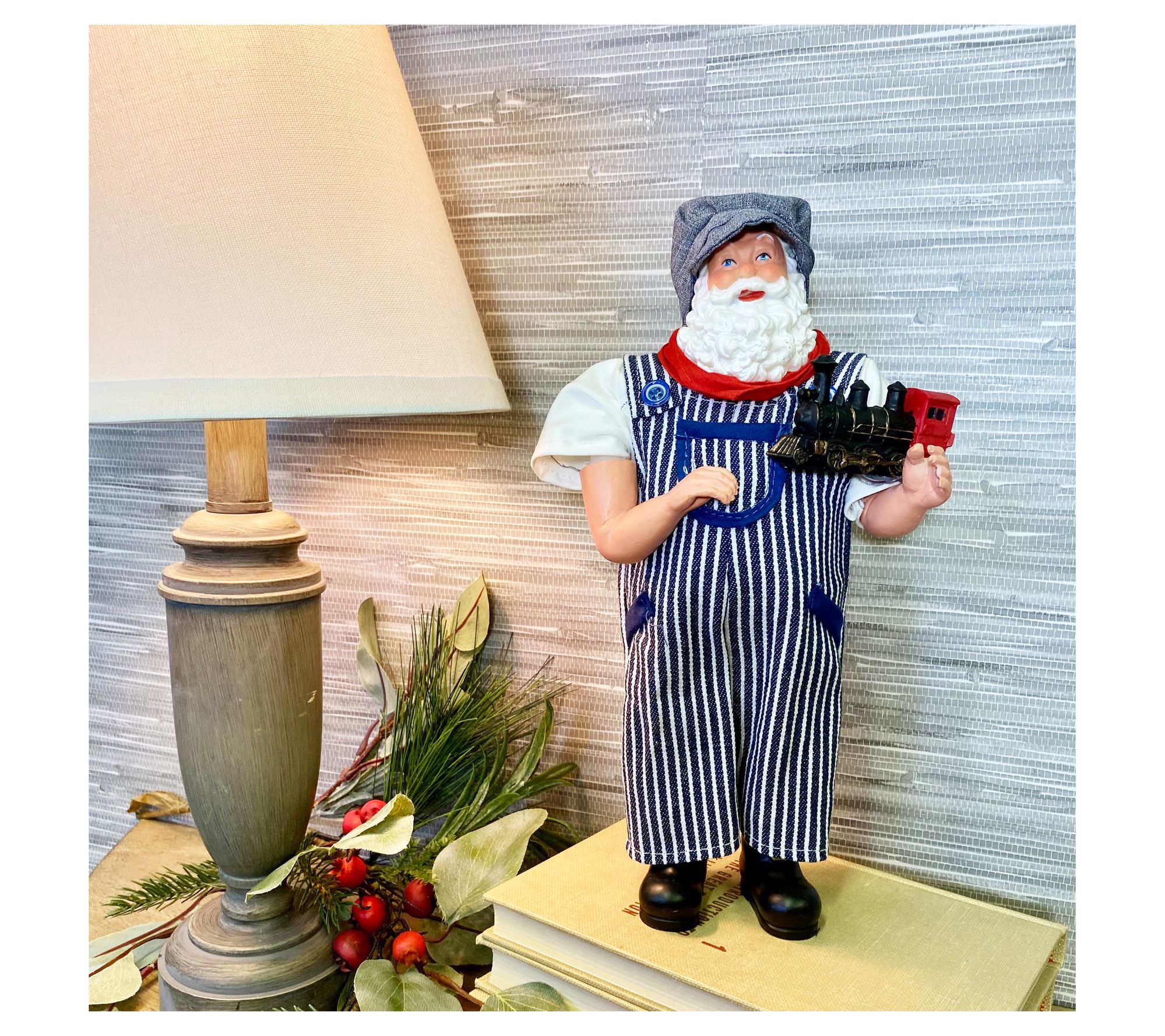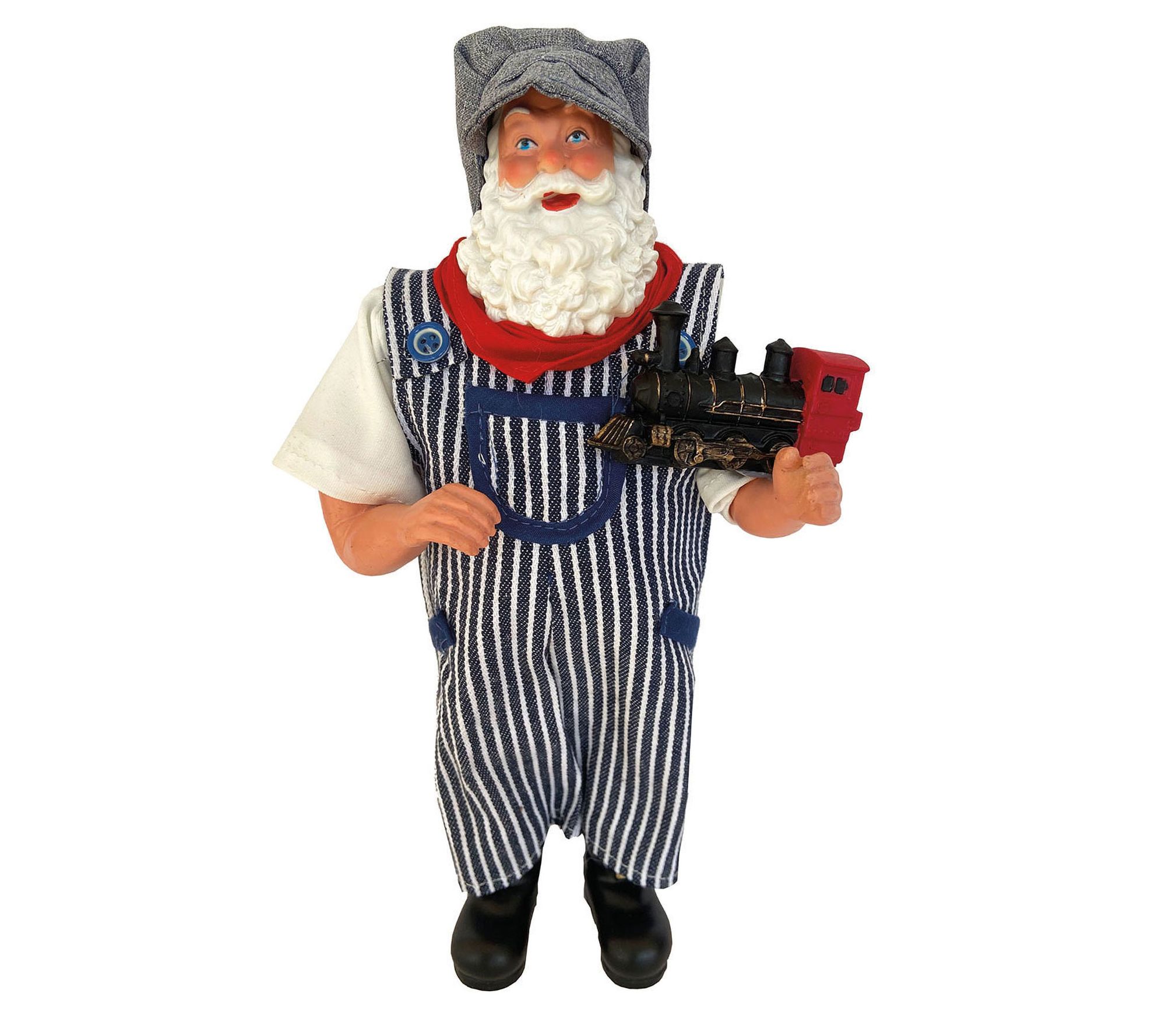 Santa's fondness for the festive season shines through in his attire, dressed smartly in blue-striped bib overalls that echo classic conductor style. Whether displayed by your fireplace or on a mantelpiece, his jovial expression and the charming locomotive he's holding invite warmth and whimsy into your home with a nod to traditional Christmas magic. Crafted with care from sturdy materials to ensure lasting enjoyment, this piece can become a cherished part of your holiday celebrations for years to come. From Santa's Workshop.