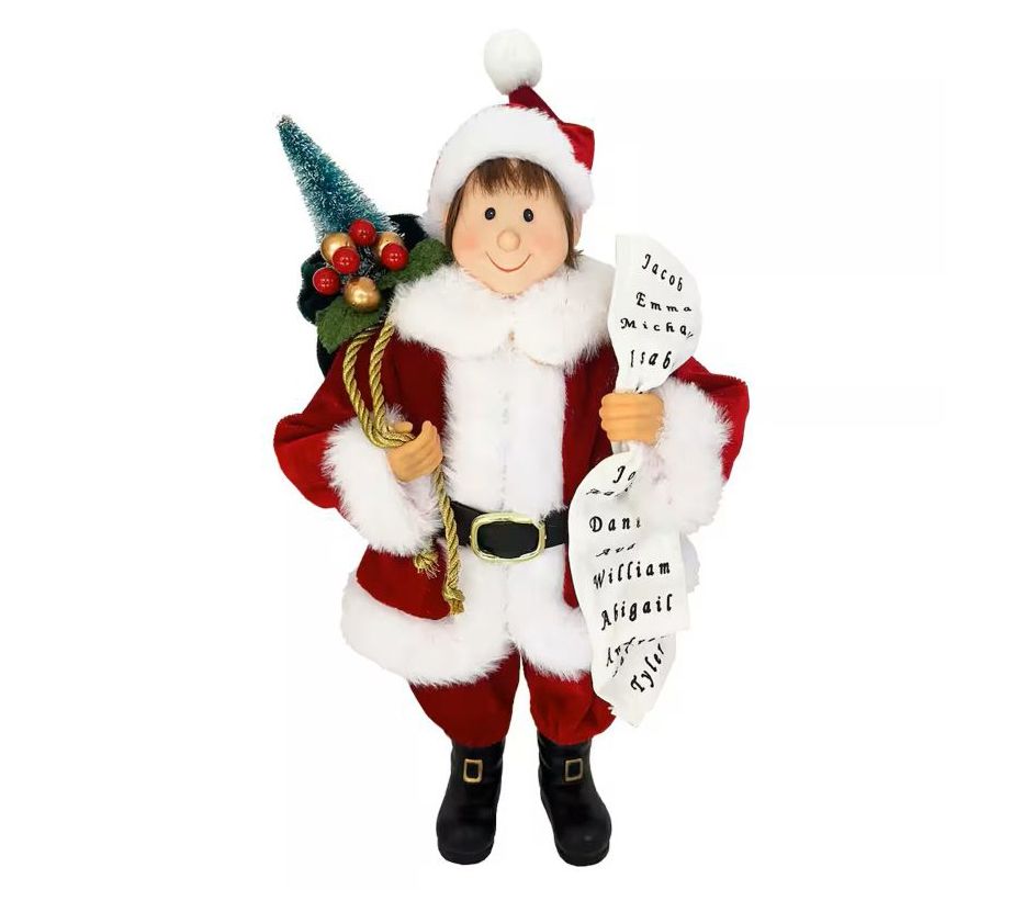 Add a touch of whimsy to your holiday decor with this charming little helper ready to spread Christmas cheer. Dressed in a festive red ensemble with a sack of goodies, this elf is a delightful addition that brings joy to any setting. Perfect for tabletops or mantels, this piece effortlessly captures the enchanting spirit of the season. Let this cheerful figure be part of your holiday tradition for many seasons to come. From Santa's Workshop.
