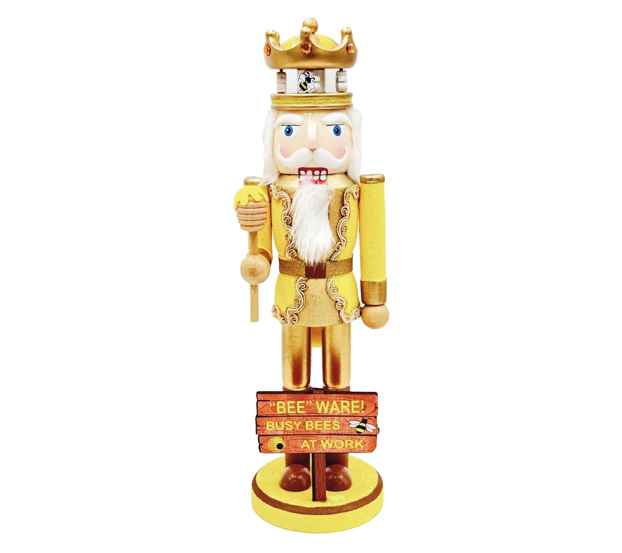 Bring a festive buzz to your holiday decor with a nutcracker that celebrates nature's hardworking creatures. Standing proudly, this charming figure in a sunny yellow ensemble grasps a honey-dipped stirrer, and the playful buzz of bees dances around his regal crown. Perfect for adding a whimsical touch to the season, he's a delightful addition for any lover of nature or whimsy. From Santa's Workshop.
