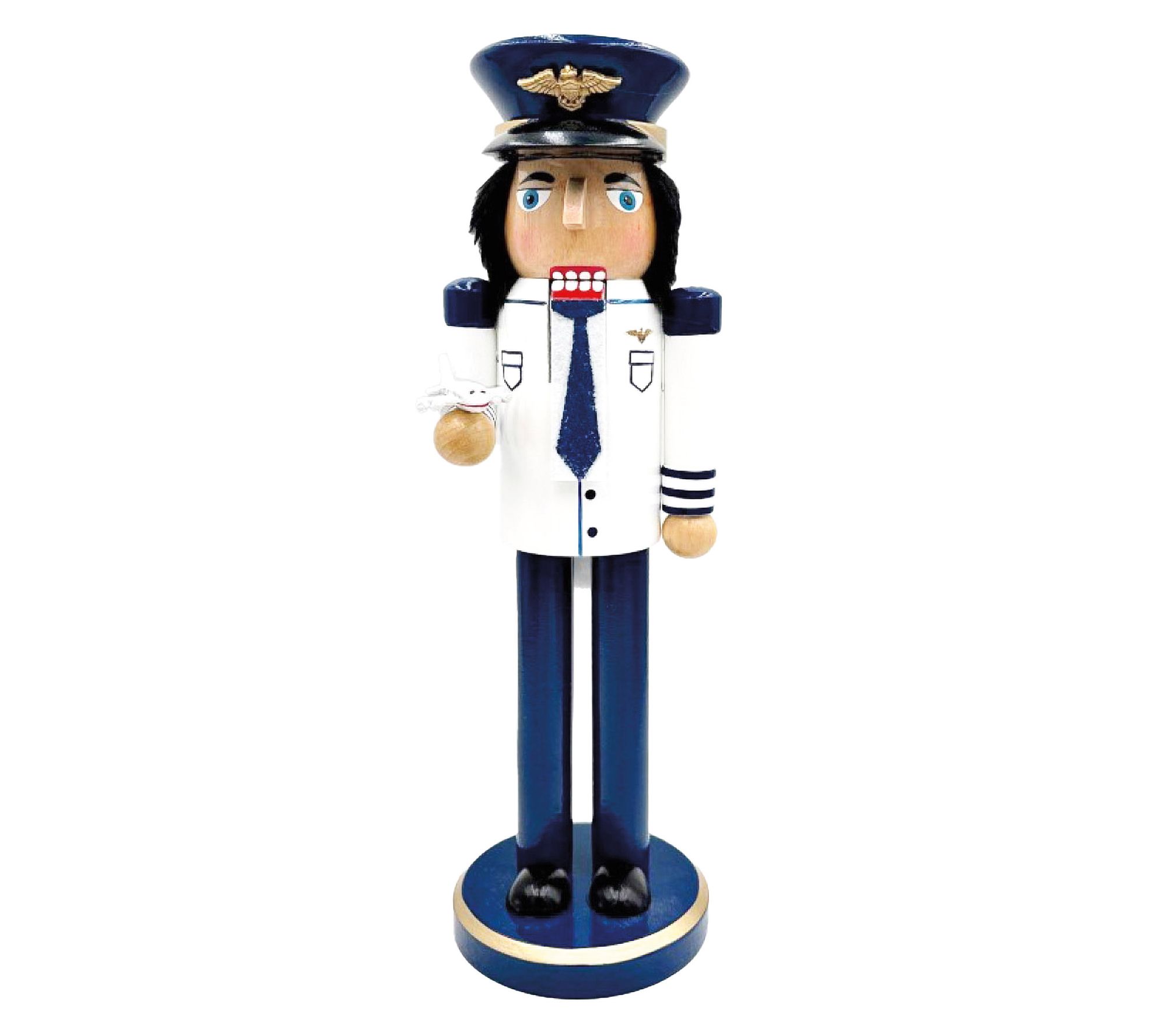 Let your holiday spirit soar with this charming pilot nutcracker. Dressed in a classic pilot's uniform, complete with an eagle-adorned cap, he's ready to guide you through a whimsical festive season. Whether perched on your mantel or welcoming guests at the door, his presence brings a touch of adventure and charm to your celebrations. Crafted from durable wood and holding a small airplane, this decorative piece invites seasonal joy and countless smiles. From Santas Workshop.