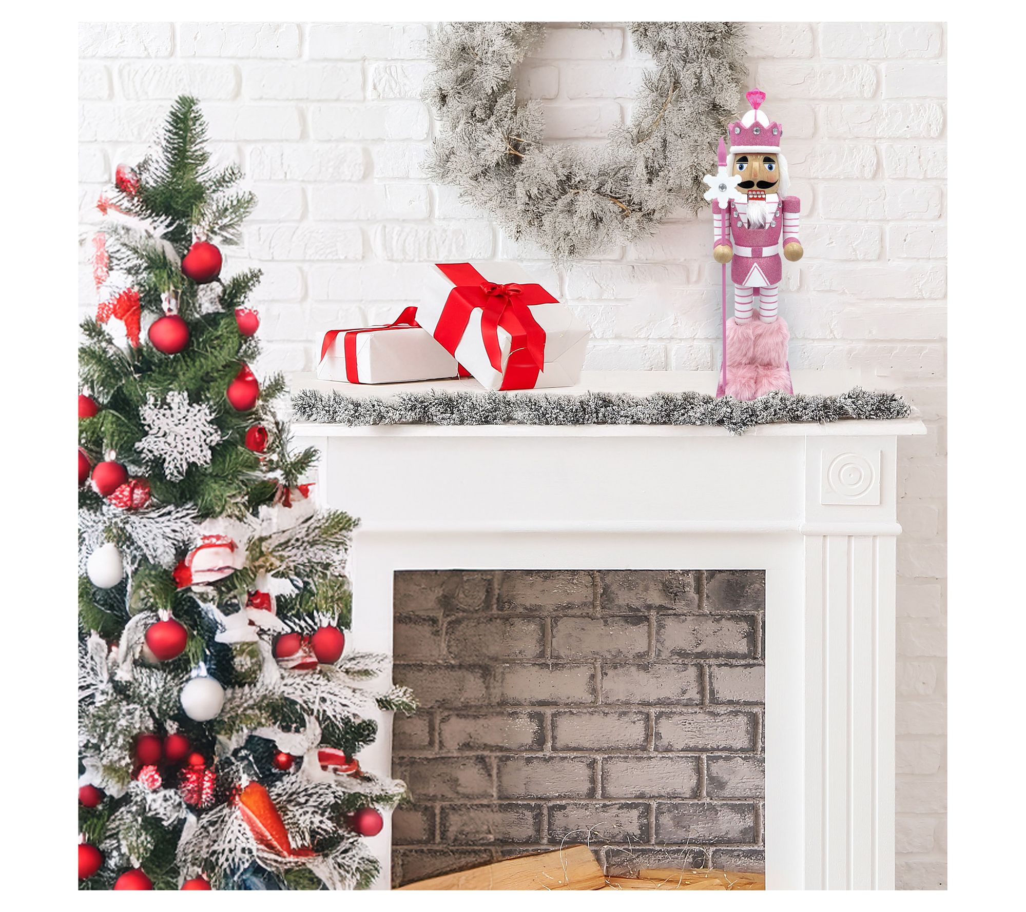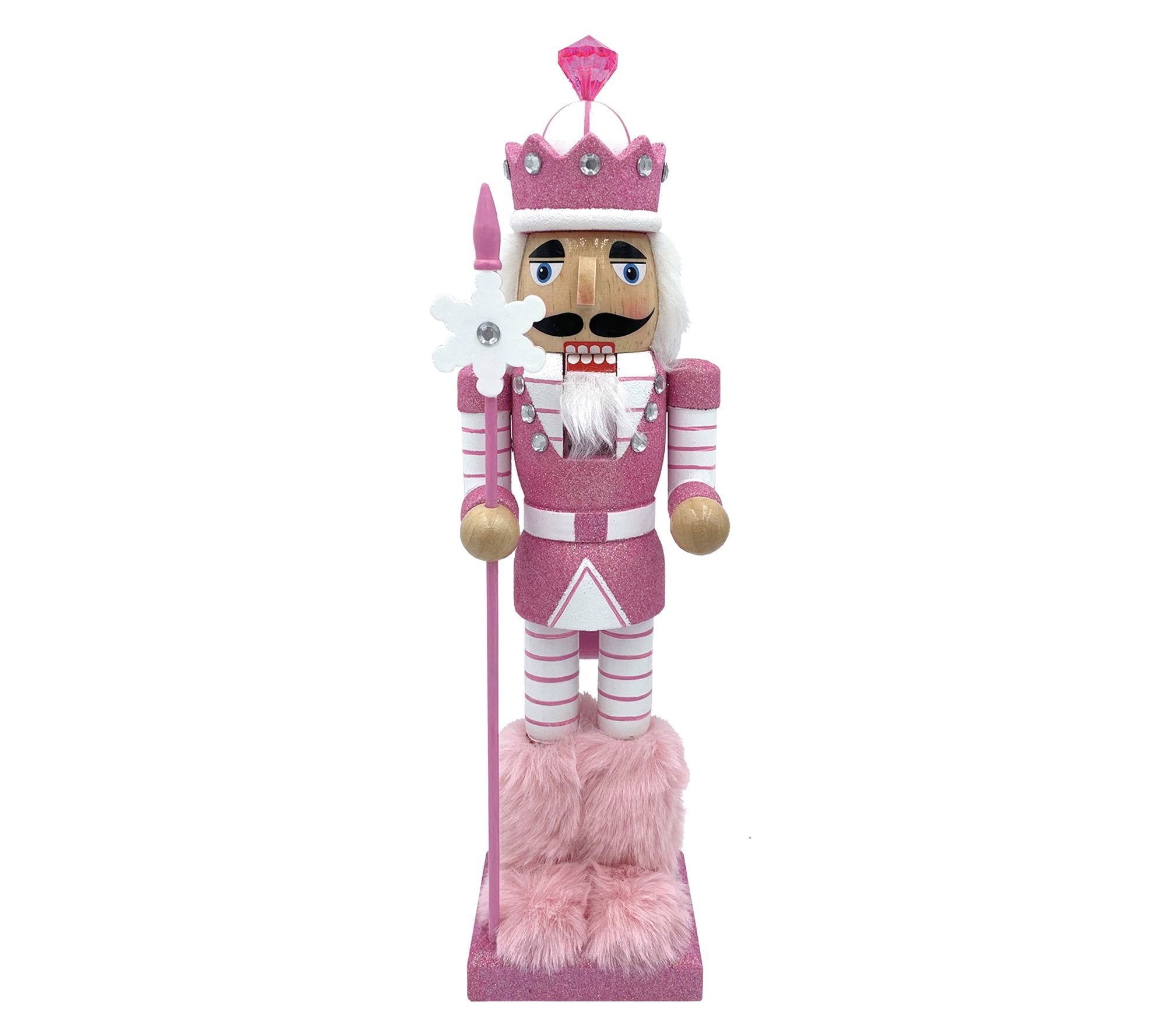 Bring a touch of whimsy to your holiday decor with this charming nutcracker, dressed in a bright pink and white uniform with fuzzy boots and a snowflake-topped staff. Perfectly sized to add delightful detail to mantels or shelves, it's crafted from wood and polyester for festive flair and longevity. Each glance at this stately figure will evoke the enchantment and warmth of the season, ensuring it becomes a cherished part of your holiday traditions. From Santa's Workshop.