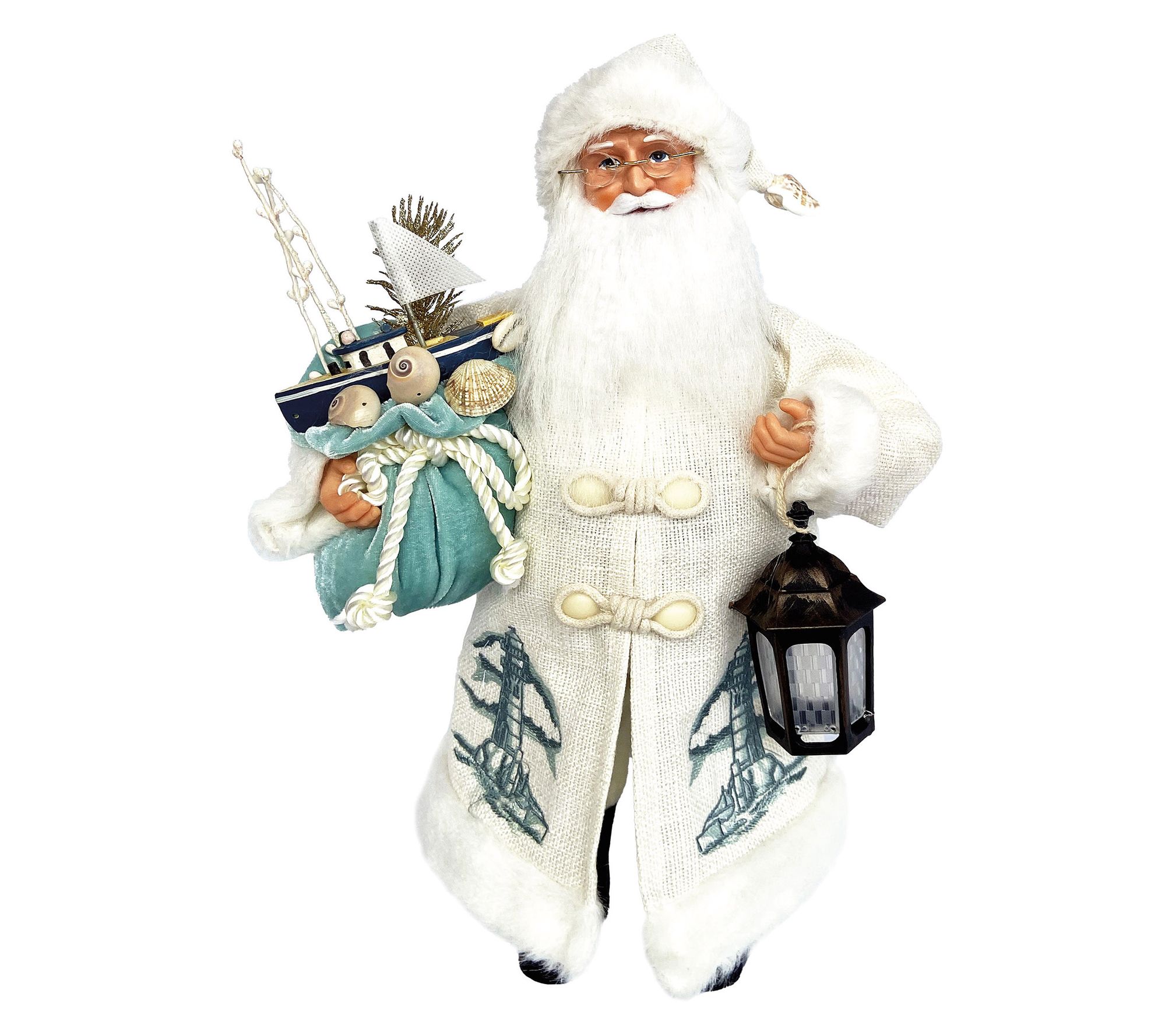 Embrace the coastal Christmas cheer with Santa's Workshop Coastal Claus II. Dressed in a classic white robe, this Santa holds a lantern and a sack filled with seaside treasures, ready to bring holiday warmth to any coastal setting. Perfect for adding a touch of nautical charm to your festive space, his presence is sure to make your holiday gatherings even more memorable. From Santa's Workshop.