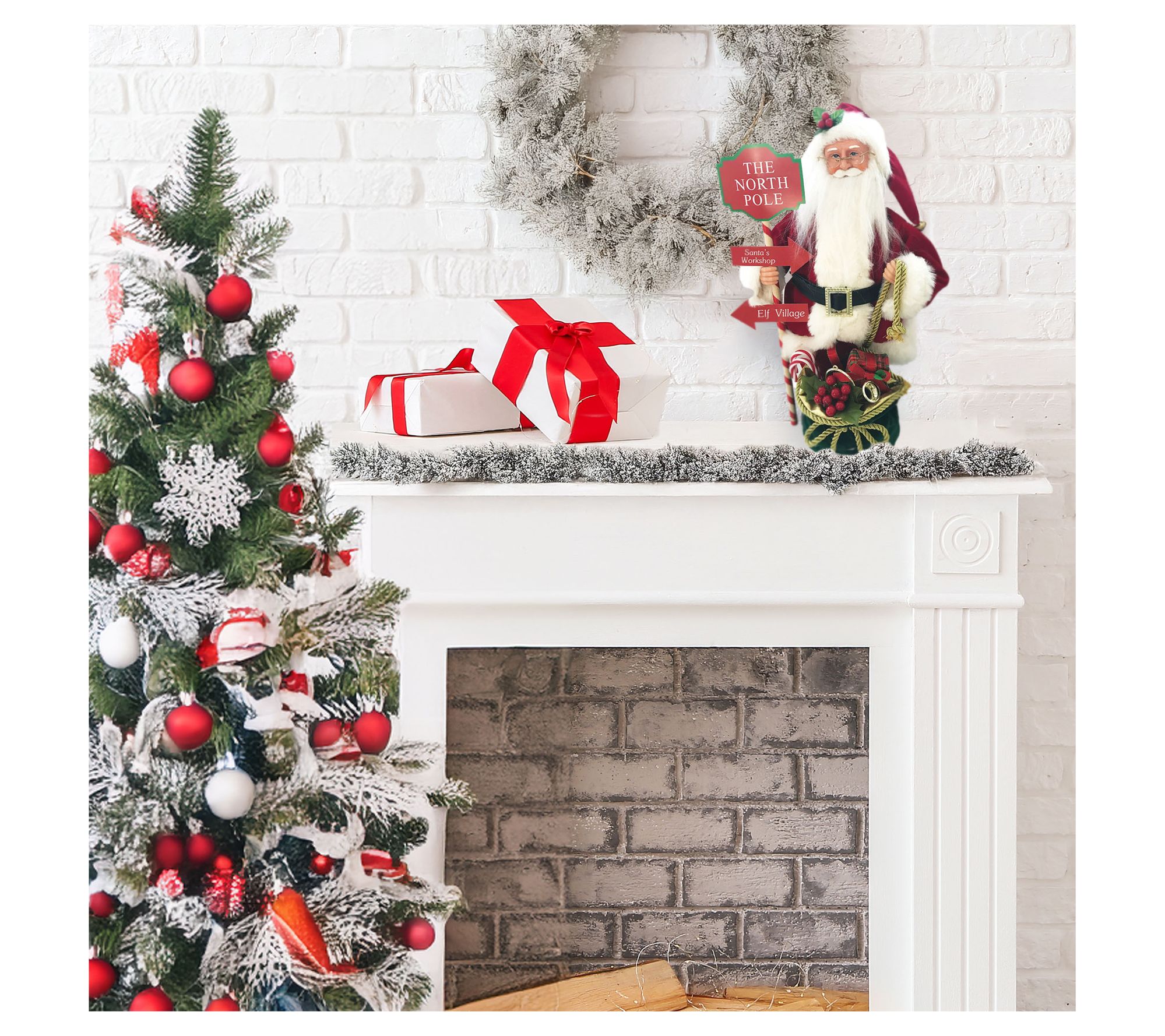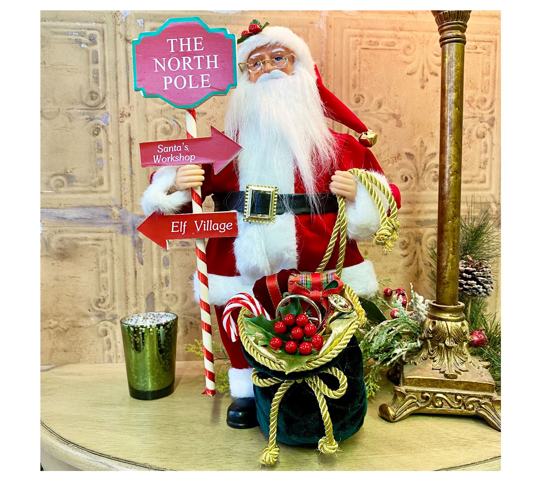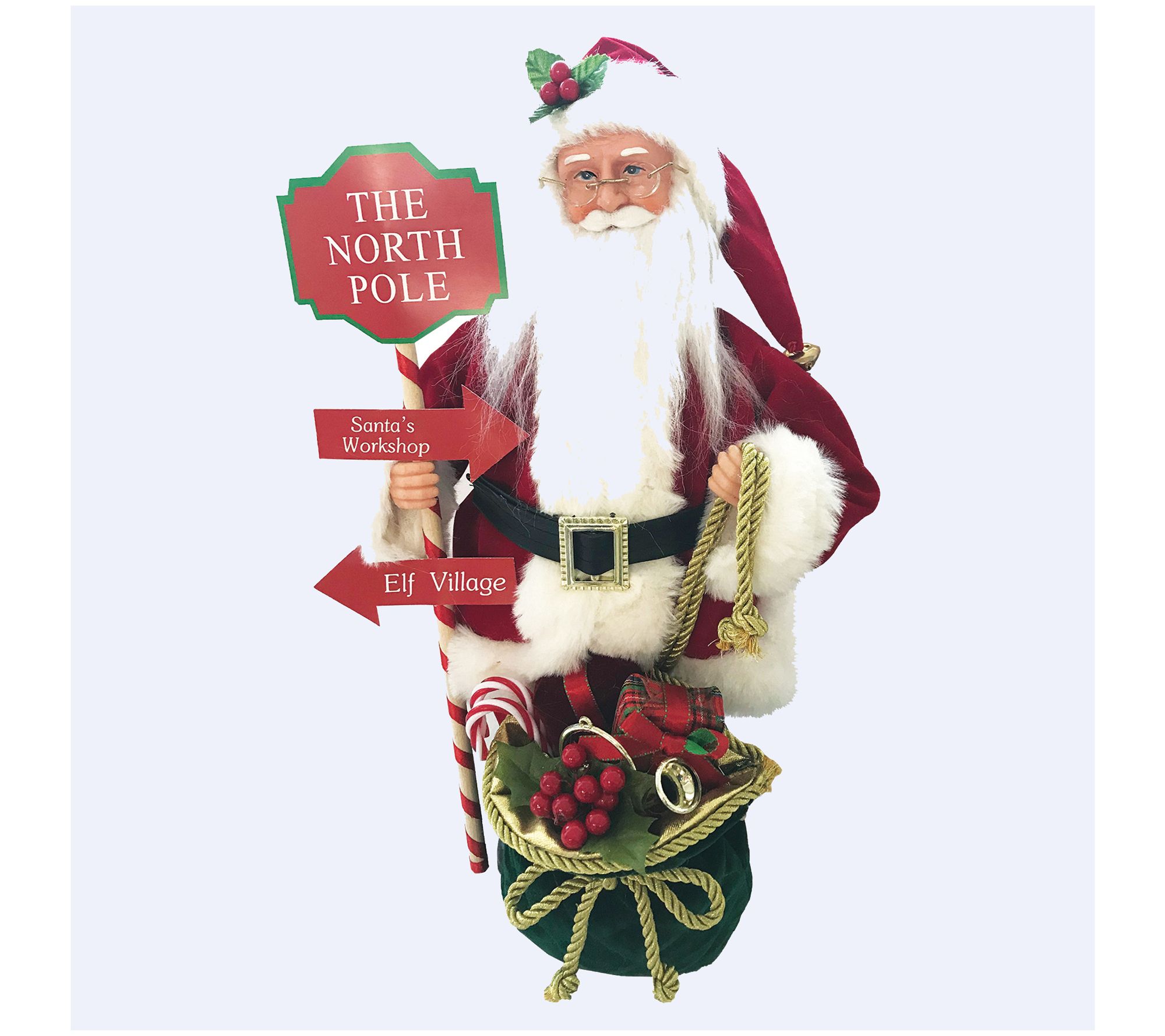 Catch a glimpse of festive cheer with the charming North Pole Santa Claus. Perfect for your mantel or tabletop, this delightful decoration brings the magic of Santa's Christmas Eve voyage to life, enchanting both young and old alike. Santa holds a North Pole sign, pointing to the hustle and bustle of the workshop and elf village, while carrying a bag brimming with gifts. This merry figure promises to be a cherished part of your holiday tradition for years to come. From Santa's Workshop.