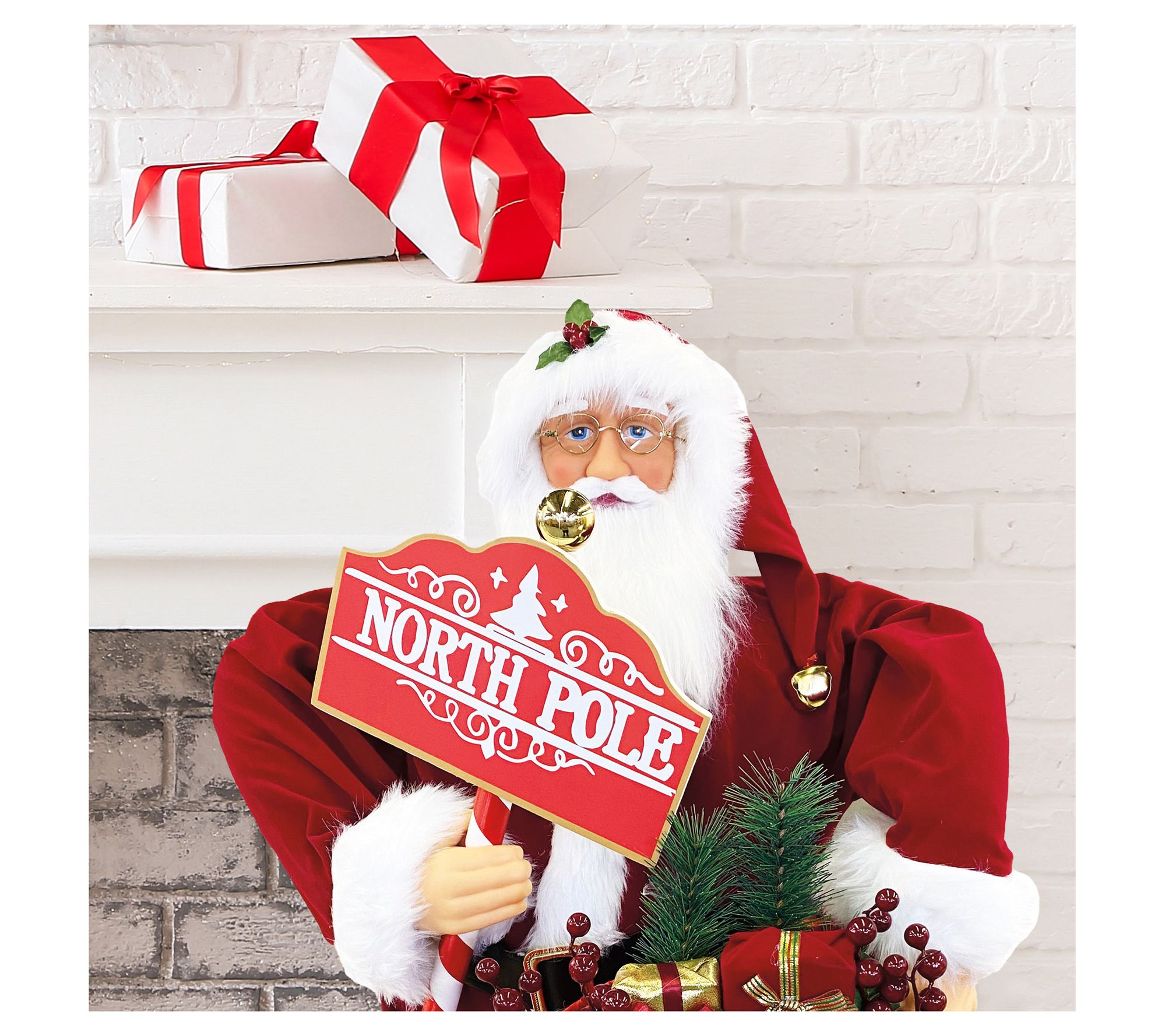 What could be more magical than a touch of Santa's charm to adorn your home this holiday season? Standing tall and cheerful, this festive figure brings the enchantment of the North Pole right to your living room. Let your imagination wander as you gaze at Santa holding his iconic sign and a sack brimming with goodies. It's truly an embodiment of holiday joy and a delightful reminder to always "Believe". From Santa's Workshop.