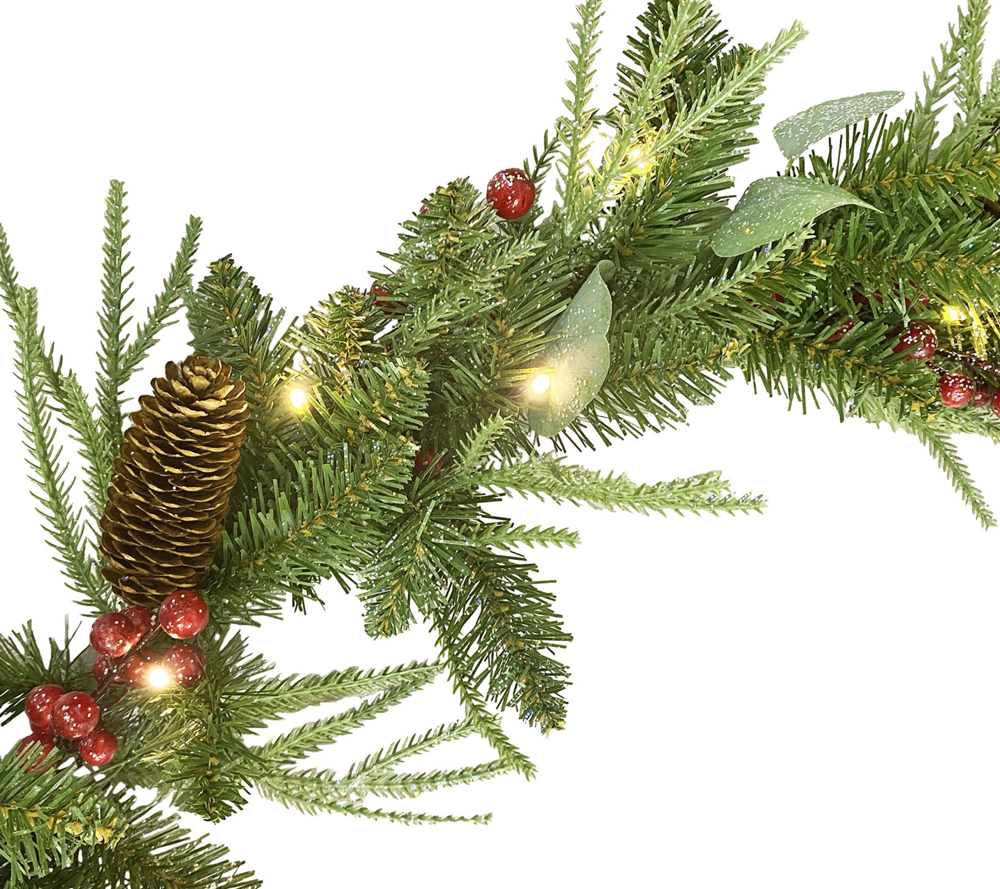 Deck your mantel, banister, or entryway with the inviting charm of this mixed pine and berry garland. Warm white lights glow among lush greenery, pinecones, and berries to create an effortless holiday atmosphere. Powered by3 AA batteries, this festive decor piece lets you spread cheer anywhere without needing a plug. From Santas Workshop.