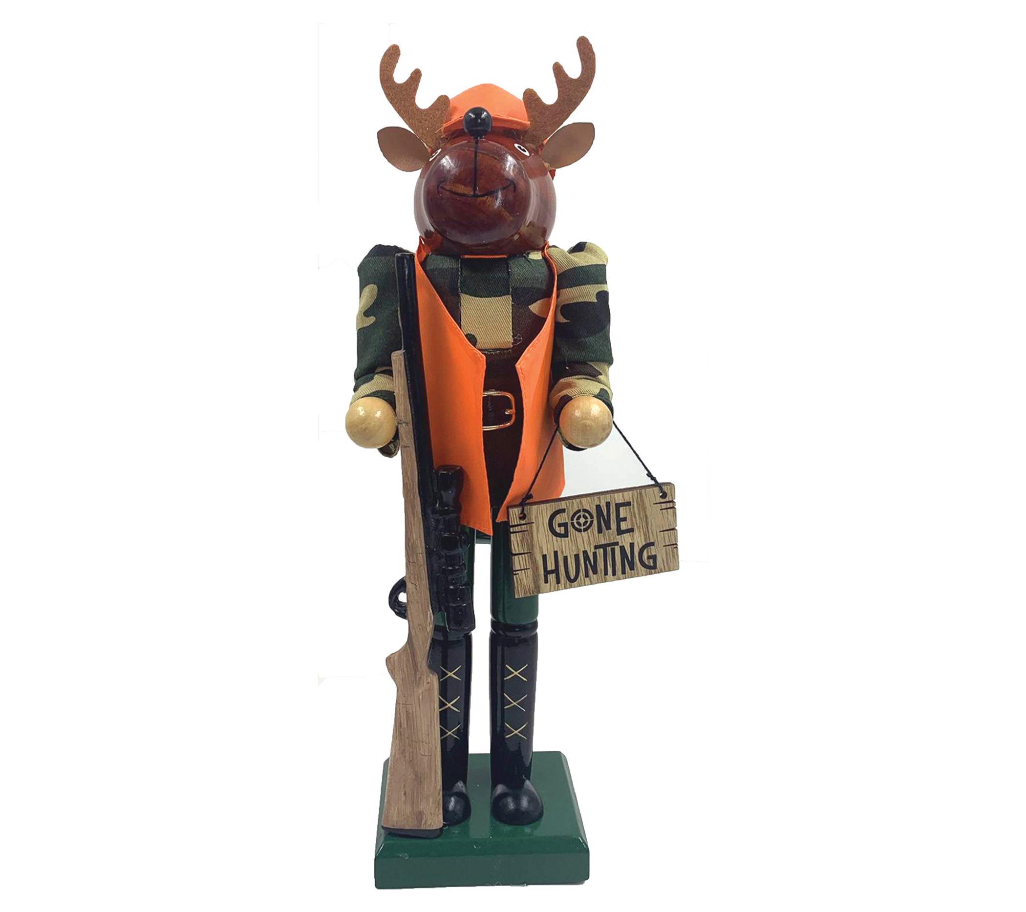 It's hunting season, and this moose is dressed for the part in his camouflage jacket and hunter orange hat and vest. Beautifully crafted from wood, this nutcracker is sure to delight for many seasons to come. From Santa's Workshop Inc.