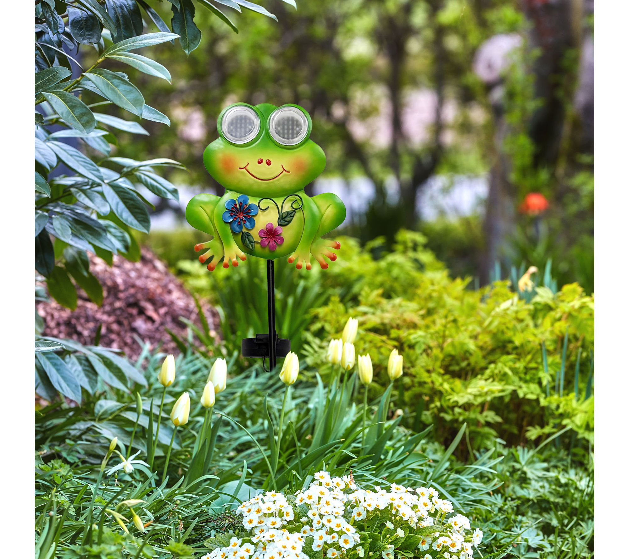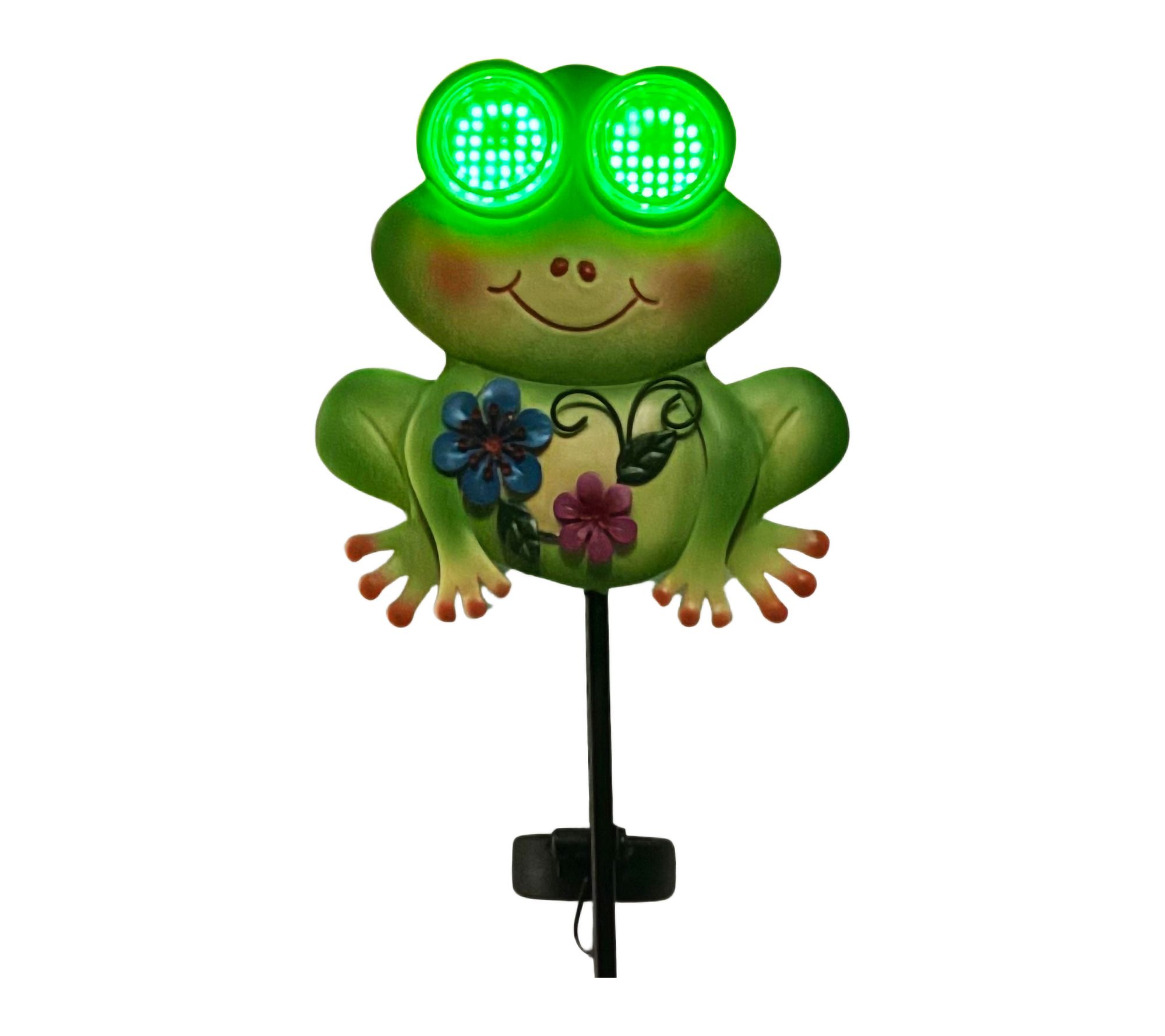 Add a playful pop of personality to your yard with this LED Frog Garden Stake. During the day, its cheerful smile and vibrant flower accents bring a whimsical charm to garden paths or flower beds -- and when evening falls, the frog's twinkling green eyes light up, creating a magical glow for nighttime enjoyment. From Santa's Workshop Inc.