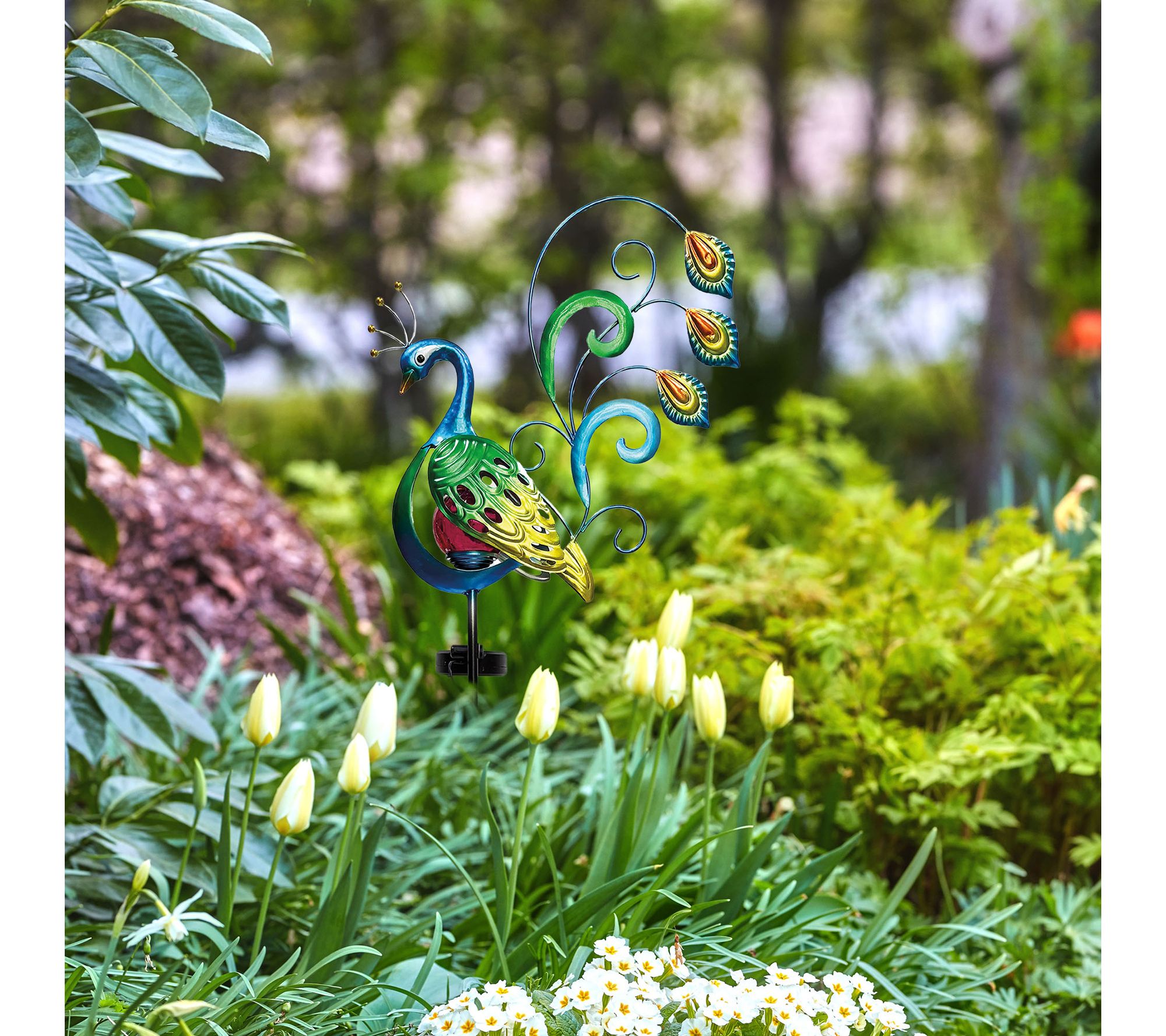 Add a splash of color and whimsy to your outdoor space with this solar iron LED peacock garden stake. By day, its bold hues and intricate feather detailing catch the eye, while at night, a softly glowing LED orb brings gentle illumination to walkways, flower beds, or patios -- creating a delightful ambiance for evening gatherings. From Santa's Workshop Inc.