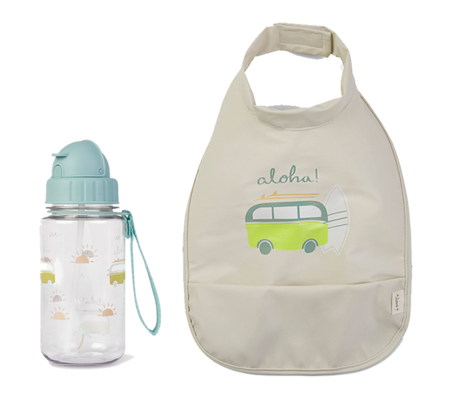 • Includes water bottle with straw and water-friendly bib