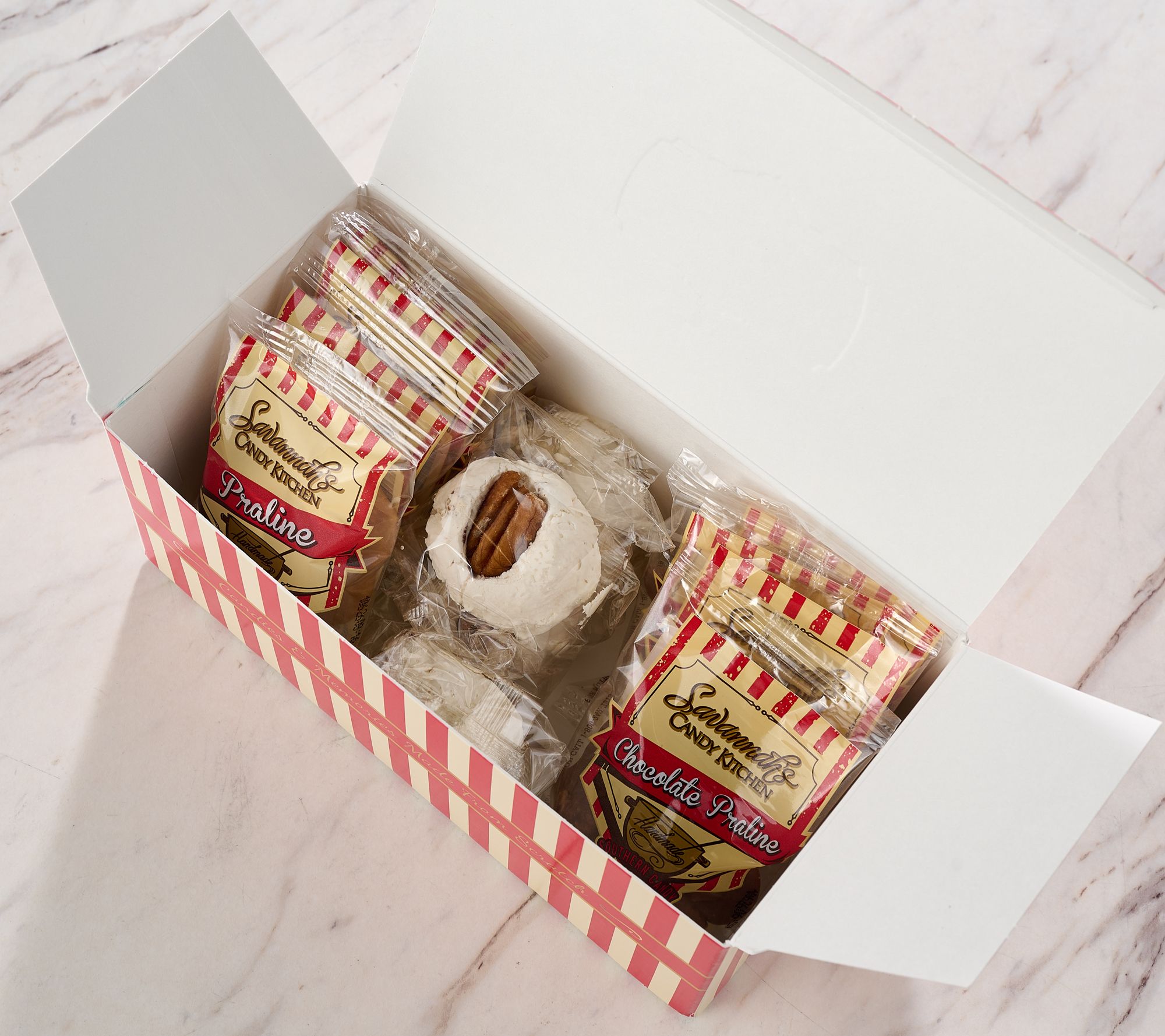 Treat someone special -- or yourself -- to a celebration of flavors with this confection assortment. Each bite brings Southern-inspired sweetness, from creamy divinity to classic pralines, all wrapped in a festive box that's ready to gift. From Savannah's Candy Kitchen.