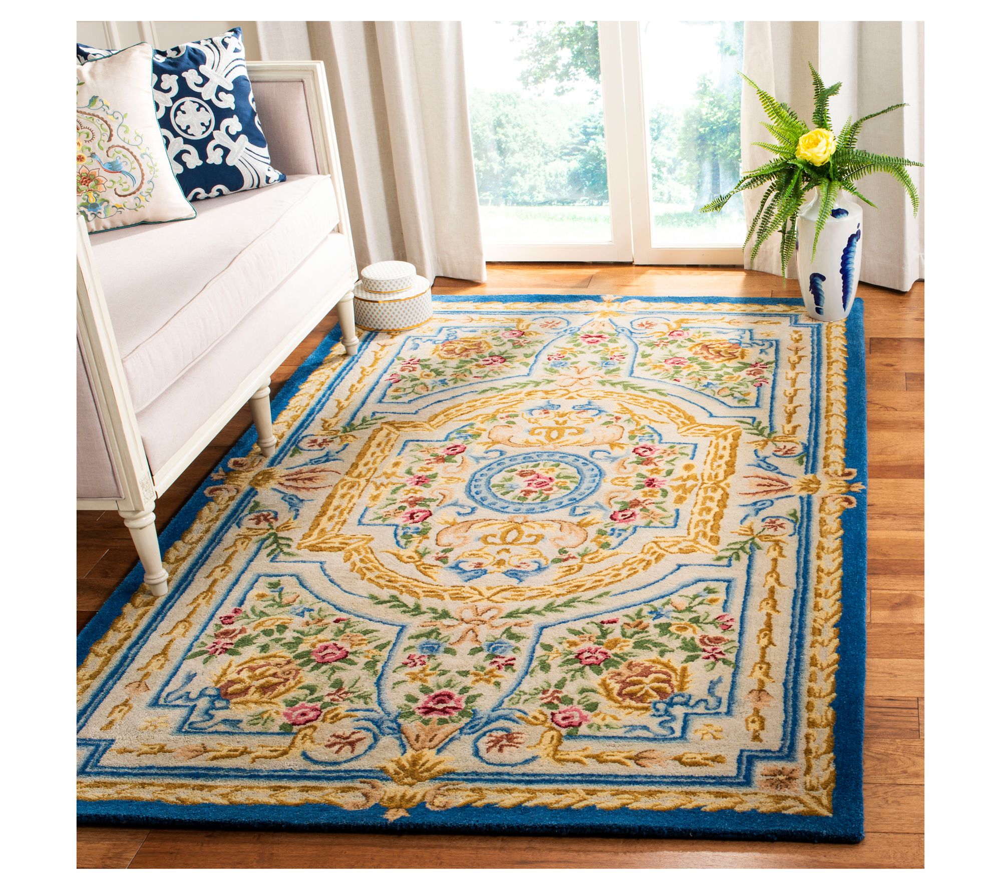Traditional charm meets refined living in this Palais Fleur rug, which weaves French-inspired elegance into every corner. Its soft blue and ivory palette, ornate floral medallions, and golden laurel accents bring warmth and richness to formal spaces or cozy retreats alike, offering both comfort and sophistication underfoot. From Safavieh.