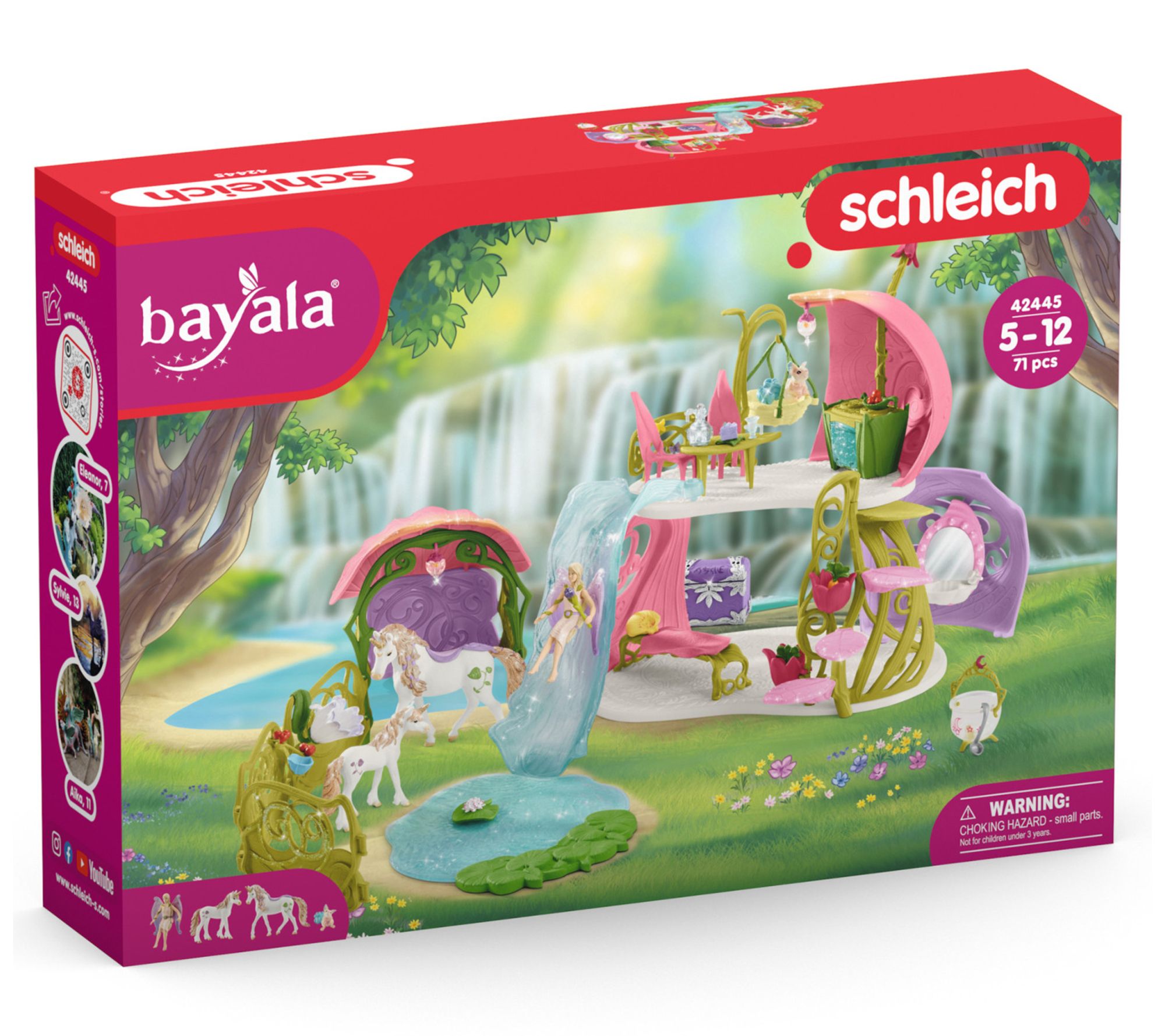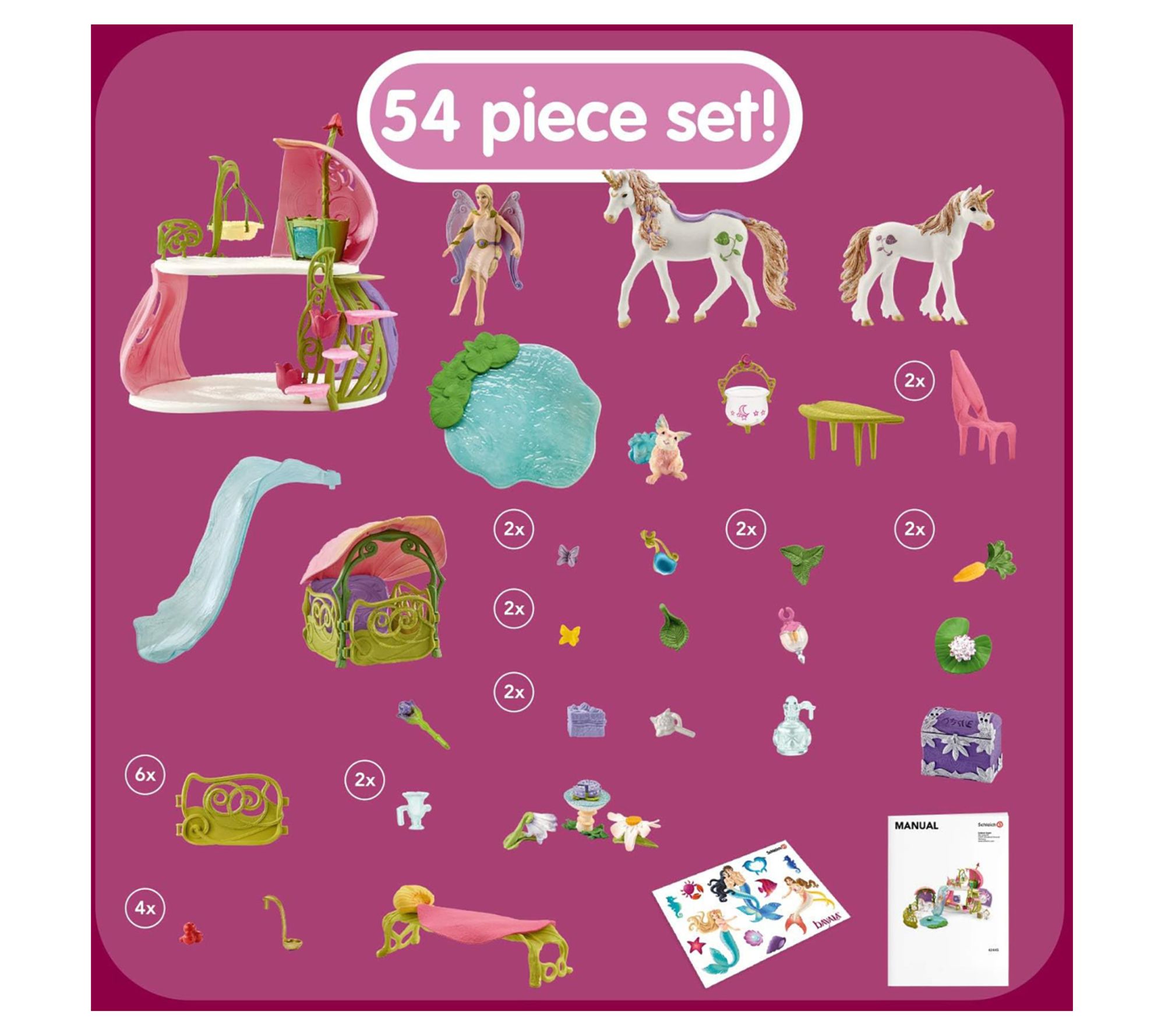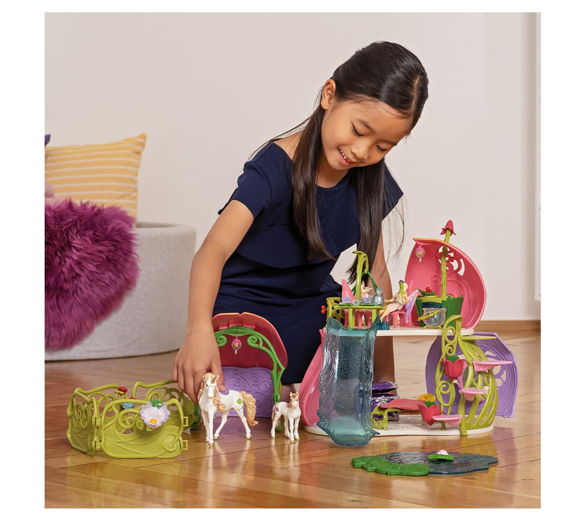Step into a whimsical journey with this enchanting playset, where a glittering flower house, unicorns, and magical details beckon hours of imaginative storytelling and adventure. The intricate design features a bubbling water slide, a stable for horses, and plenty of space for elves and friends to gather, dream, and explore endless new tales together. From Schleich.