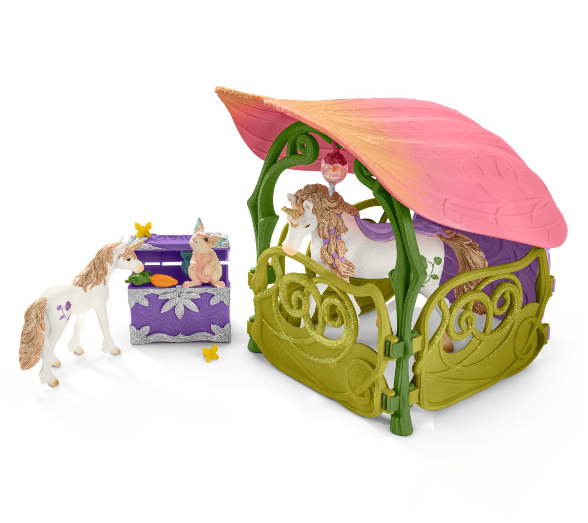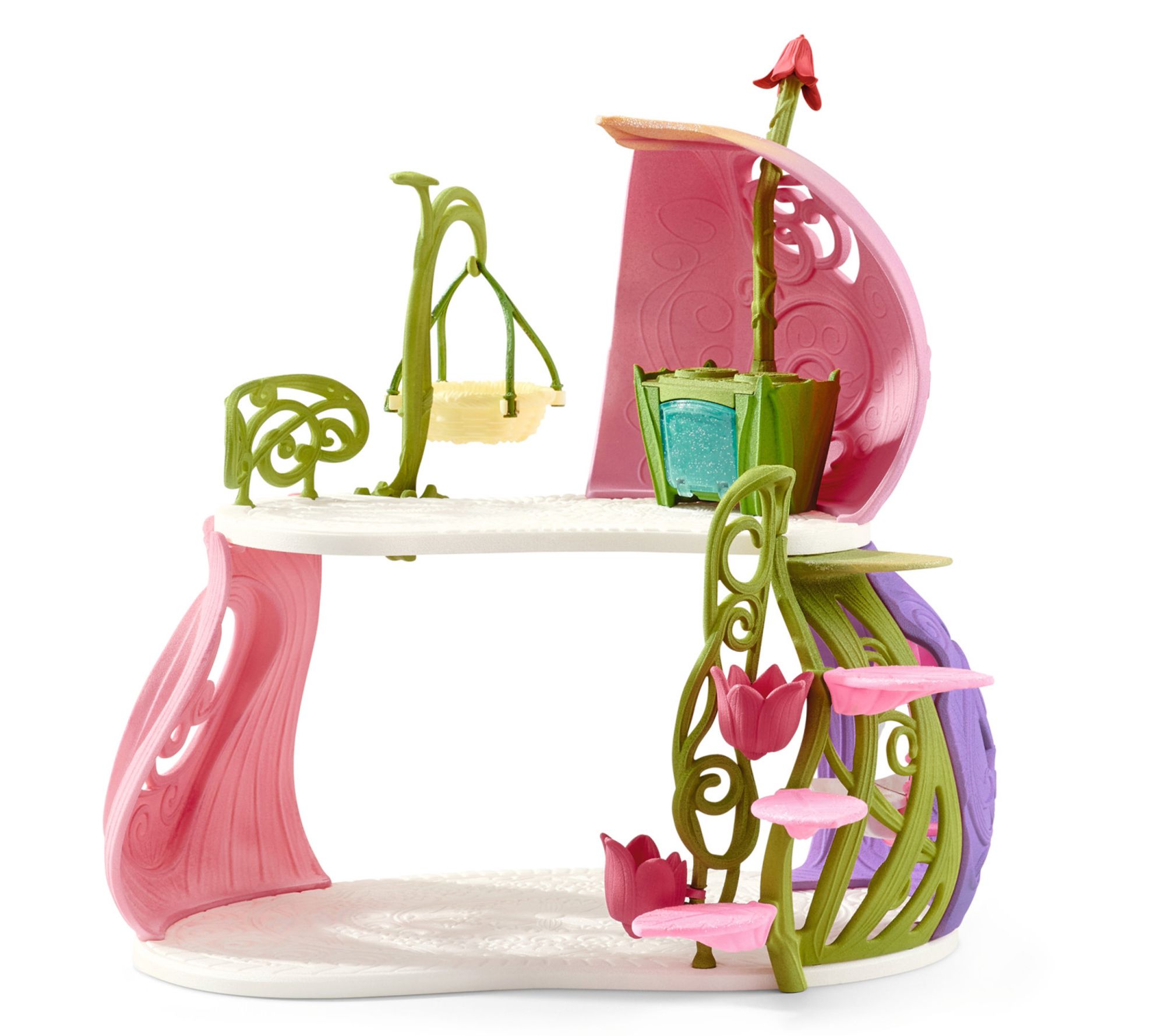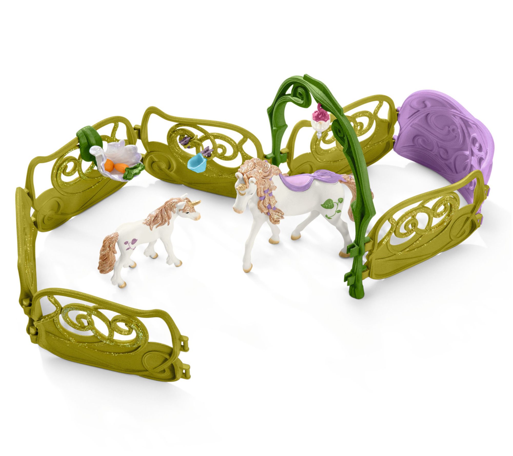 Step into a whimsical journey with this enchanting playset, where a glittering flower house, unicorns, and magical details beckon hours of imaginative storytelling and adventure. The intricate design features a bubbling water slide, a stable for horses, and plenty of space for elves and friends to gather, dream, and explore endless new tales together. From Schleich.