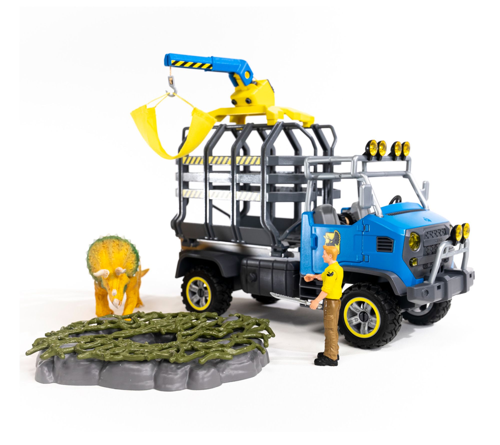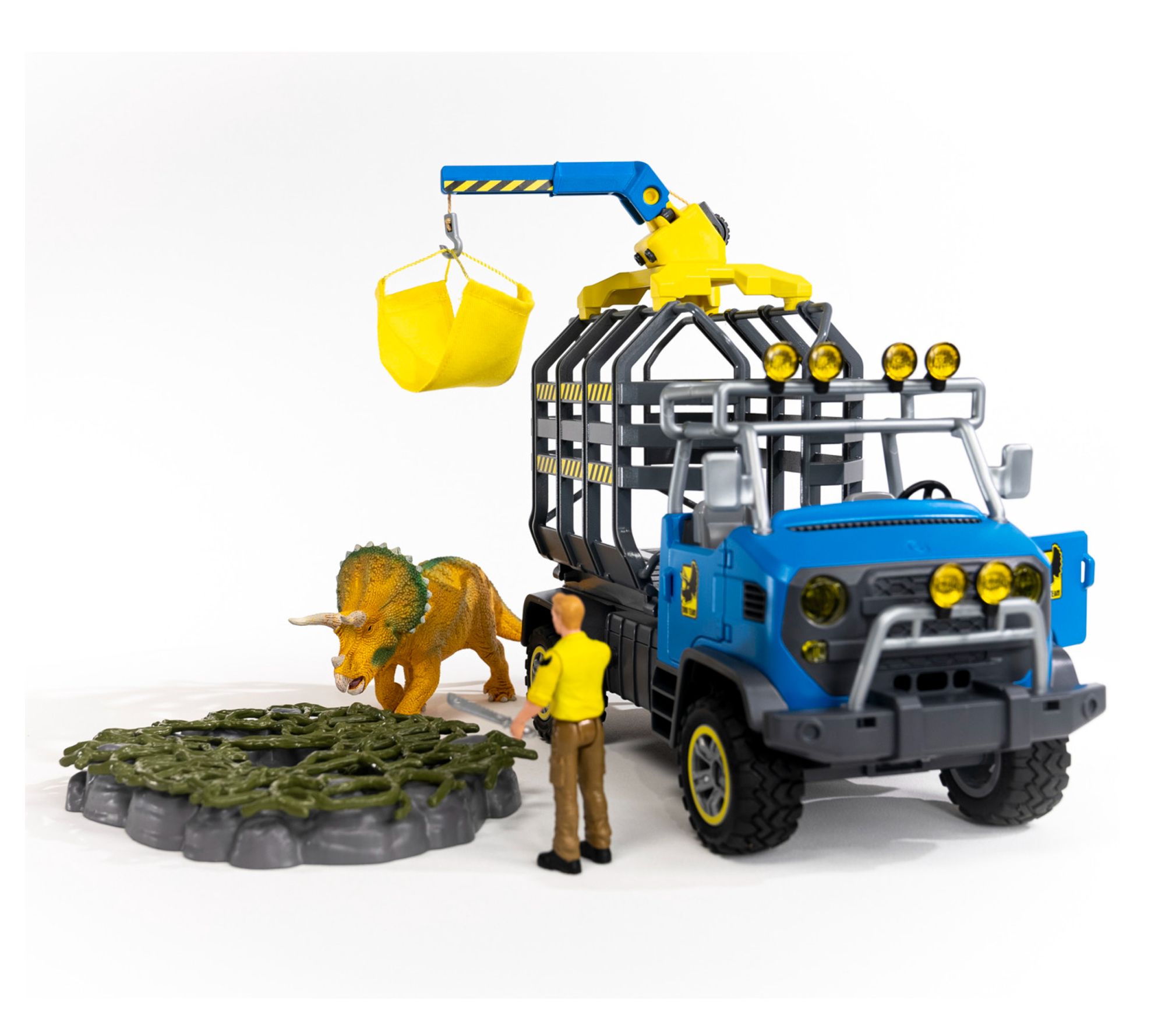 Includes truck with loading ramp, cage, crane, machete, smartwatch communicator, secret drawer, carrying sling, swamp hole, two liana mats, Ranger Luis, Triceratops, and sticker sheet