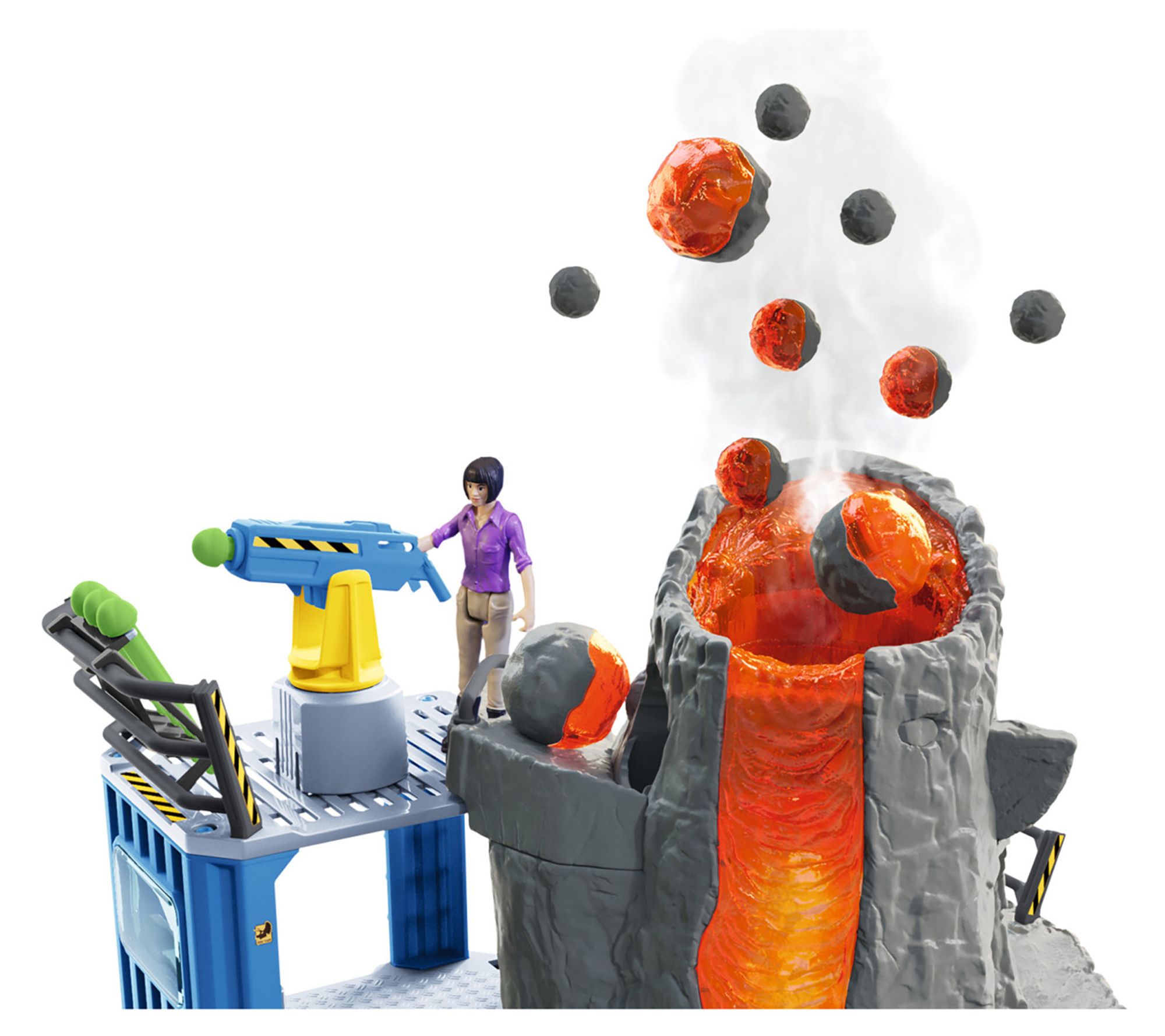 • Includes dinosaur researcher Yuki, Giganotosaurus, Ankylosaurus, volcano, container, railing container, railing bridge, bridge, railing top, railing corner, projectile holder, stone marble, two large stones, three medium stones, four small stones, two large crystals, two small crystals, liana, two large plants, three small plants, stalactite