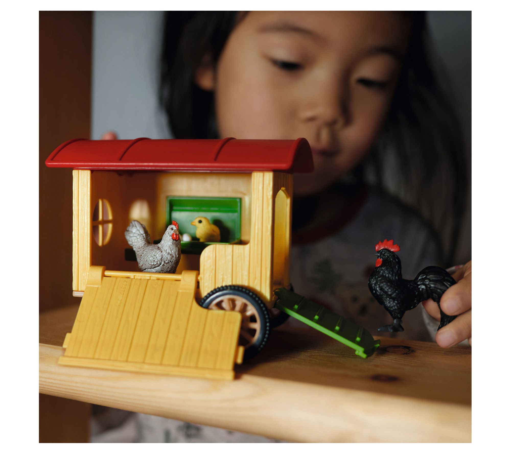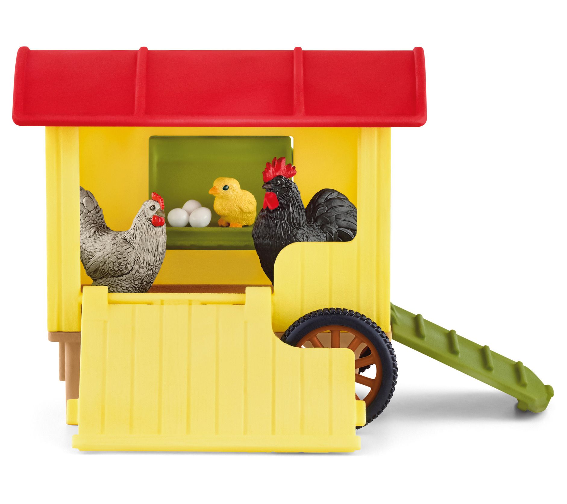 • Includes mobile chicken coop with side swing door, stowaway ramp and brooding box, rooster, hen, chick, and eggs