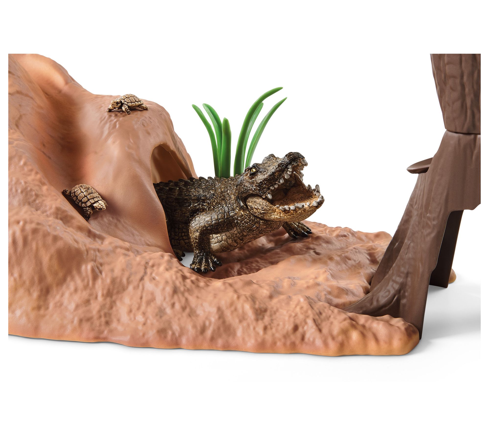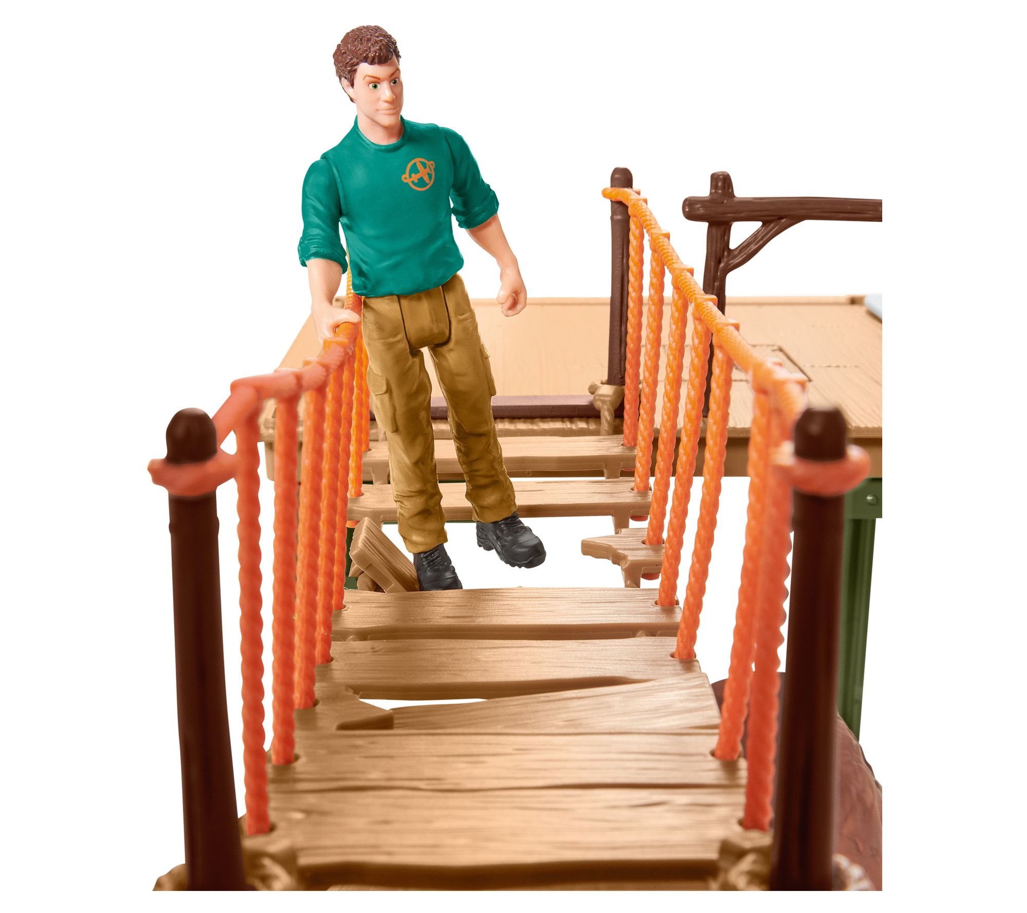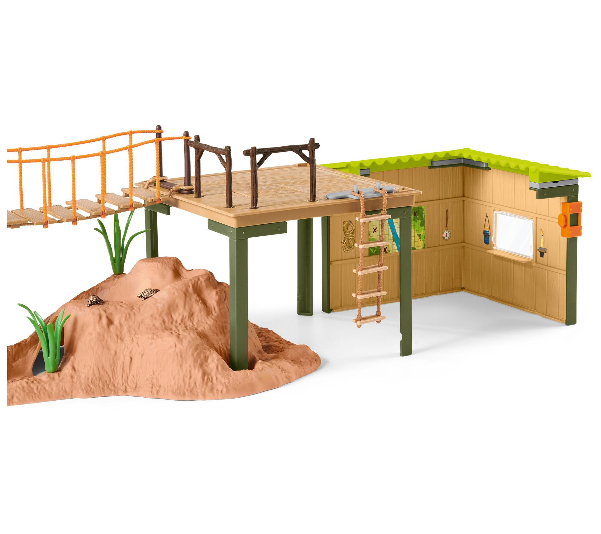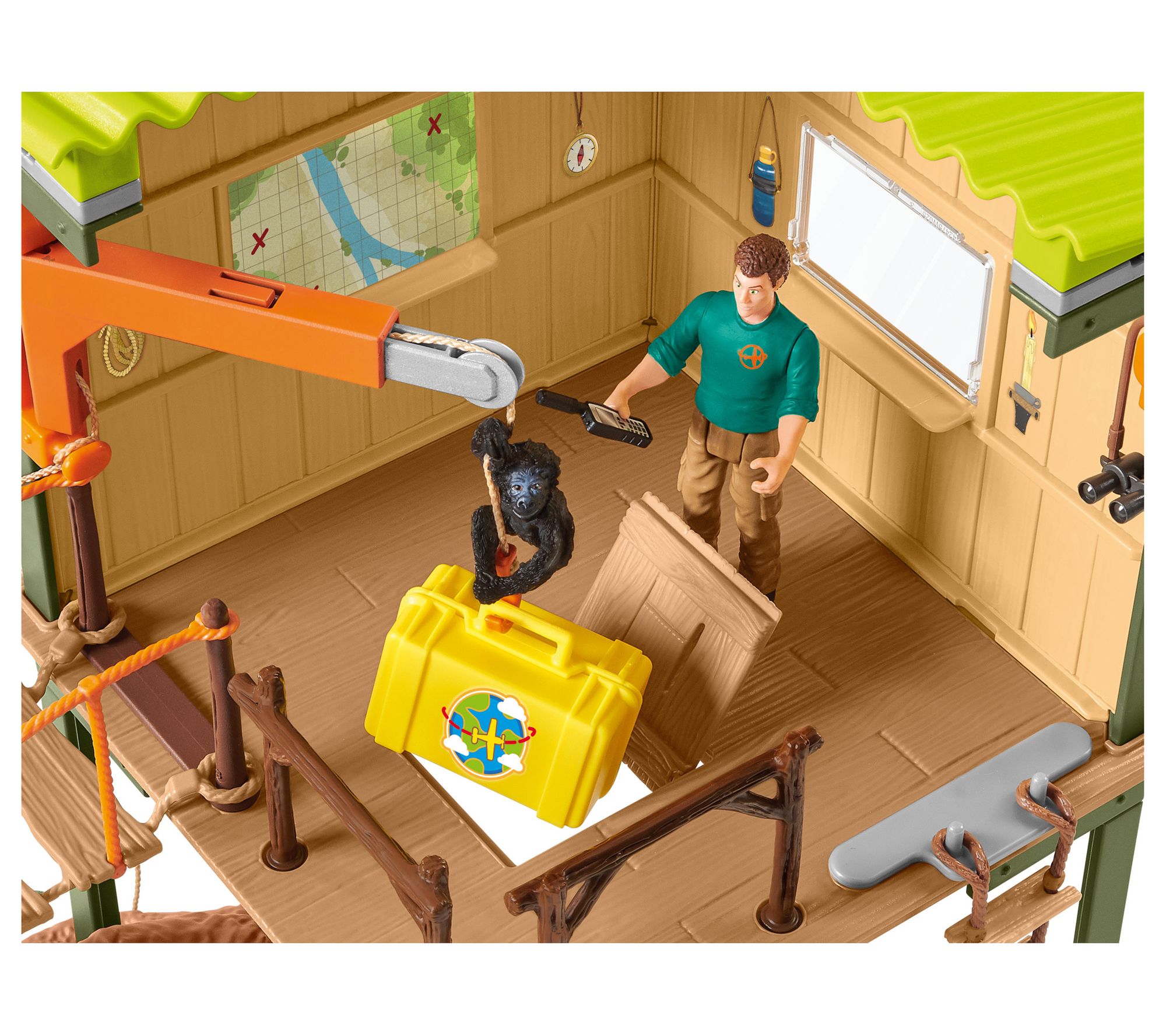 Includes adventure station with ranger, gorilla baby, black panther, crocodile, two baby tortoises, three-piece suspension bridge with drop function, floor panel with hollow and slide, crane with hook, three-piece tree with slide, rope ladder, adapter hook, rock, two bulrushes, leaf, transport box, satellite telephone, knife, binoculars, torch, and chair
