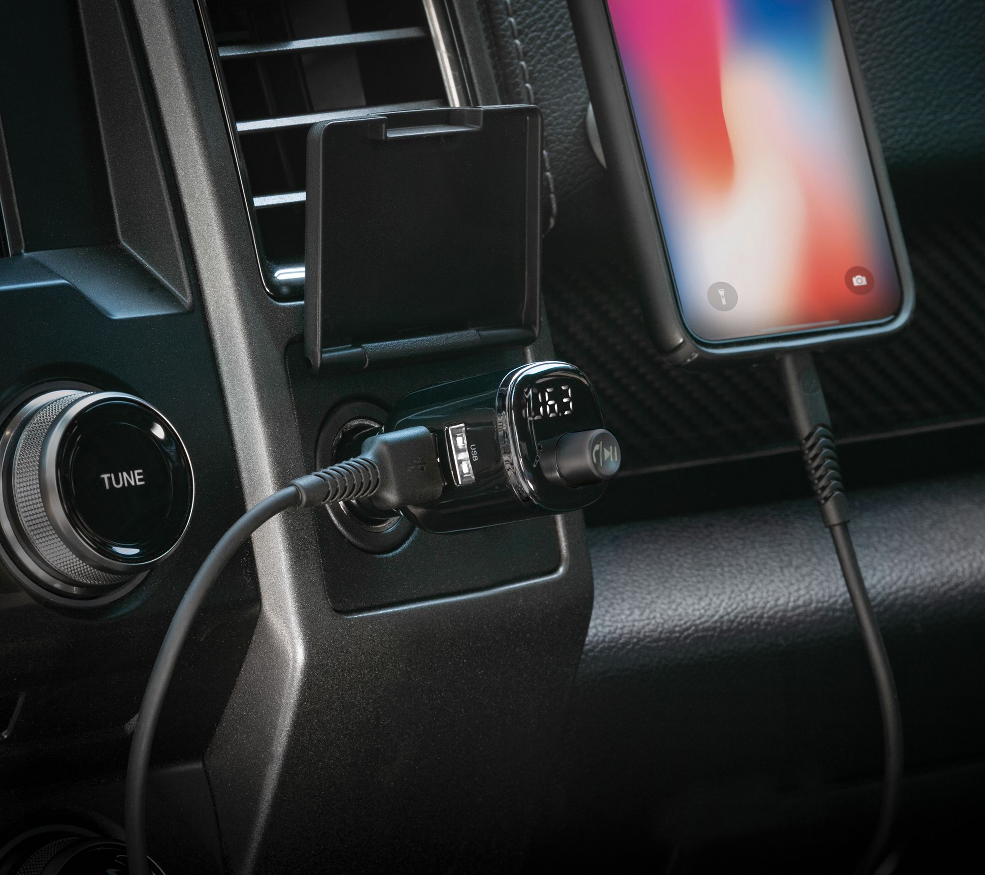 • Includes FM transmitter/car charger, suction cup mount, vent clip mount, and extra mount