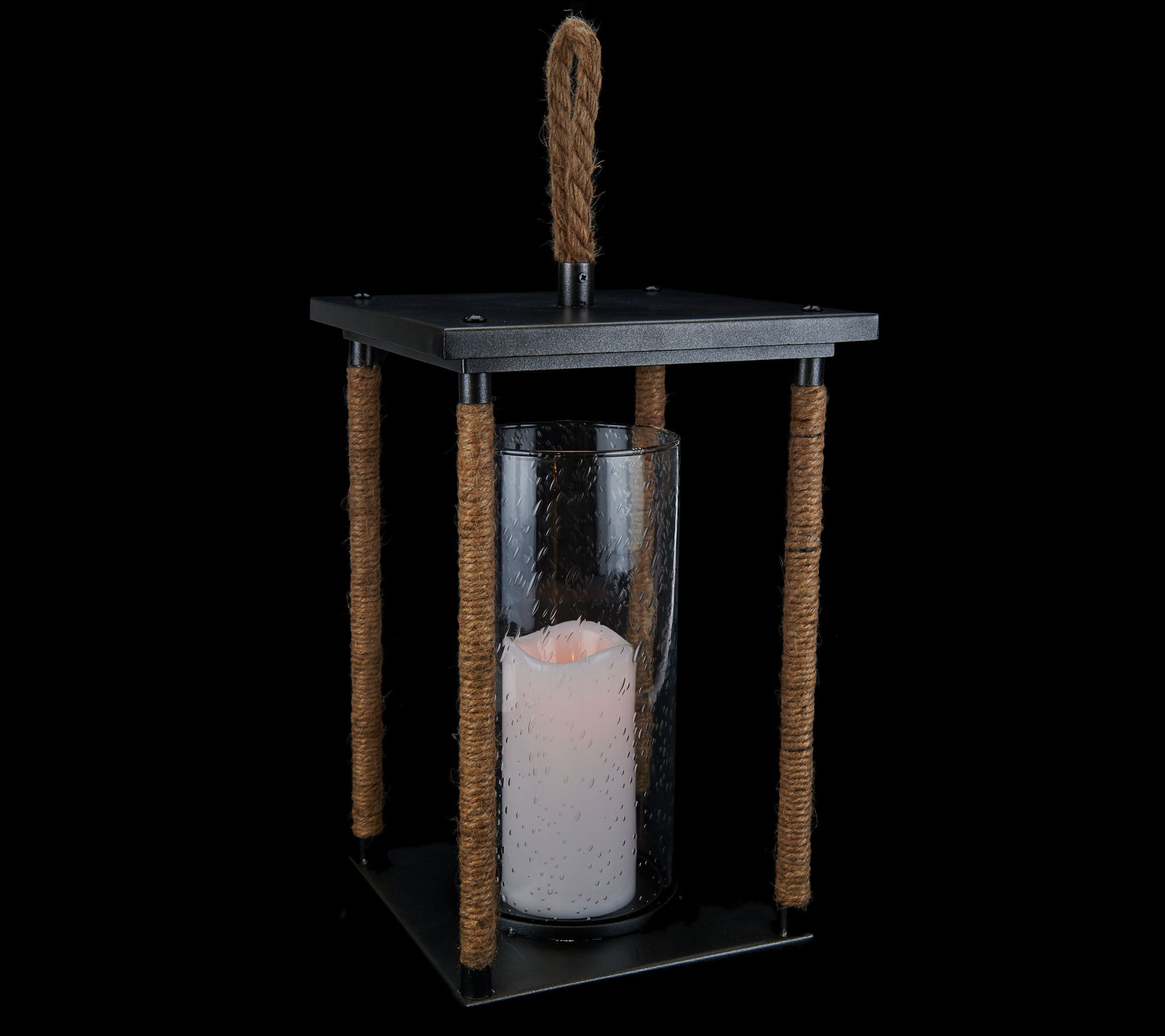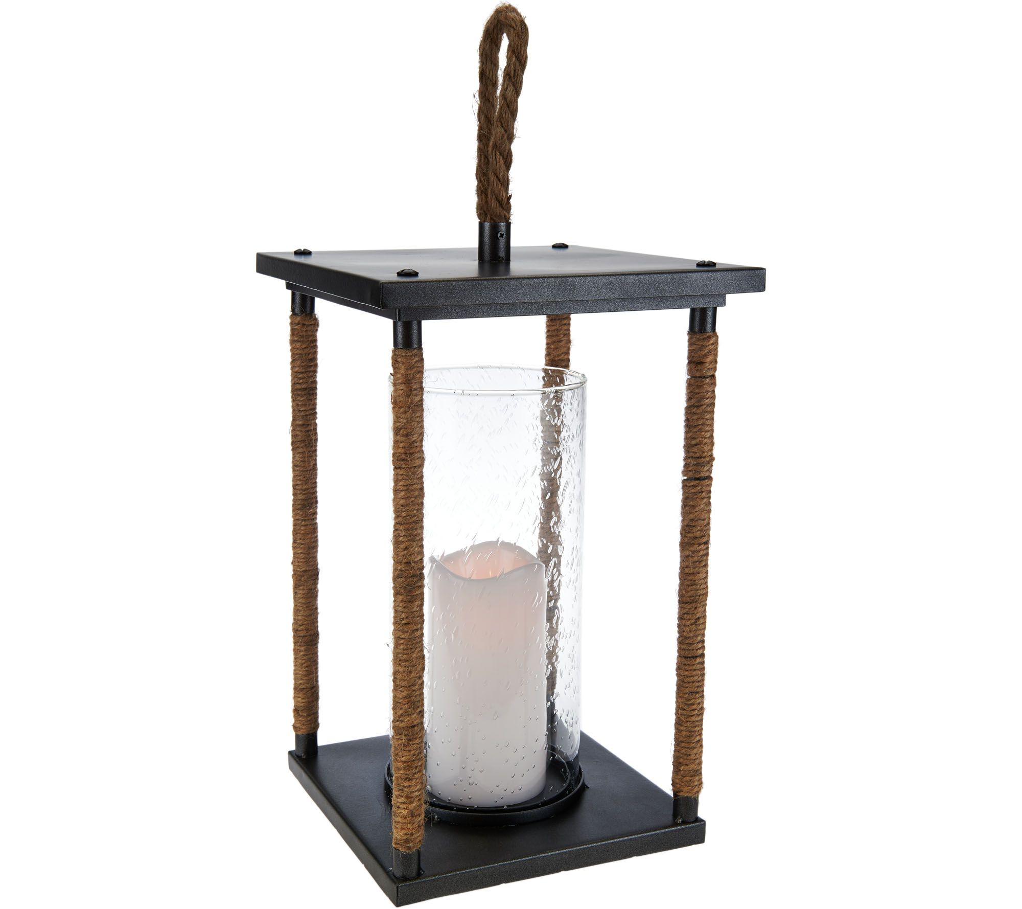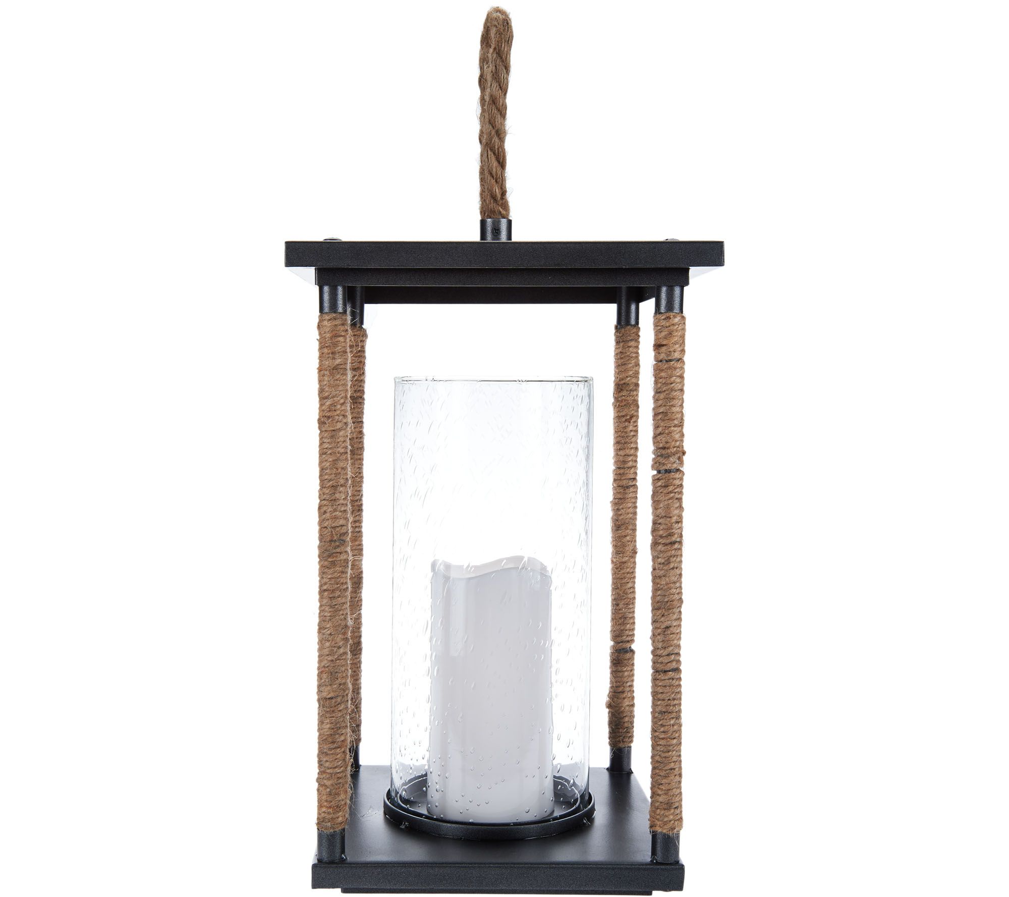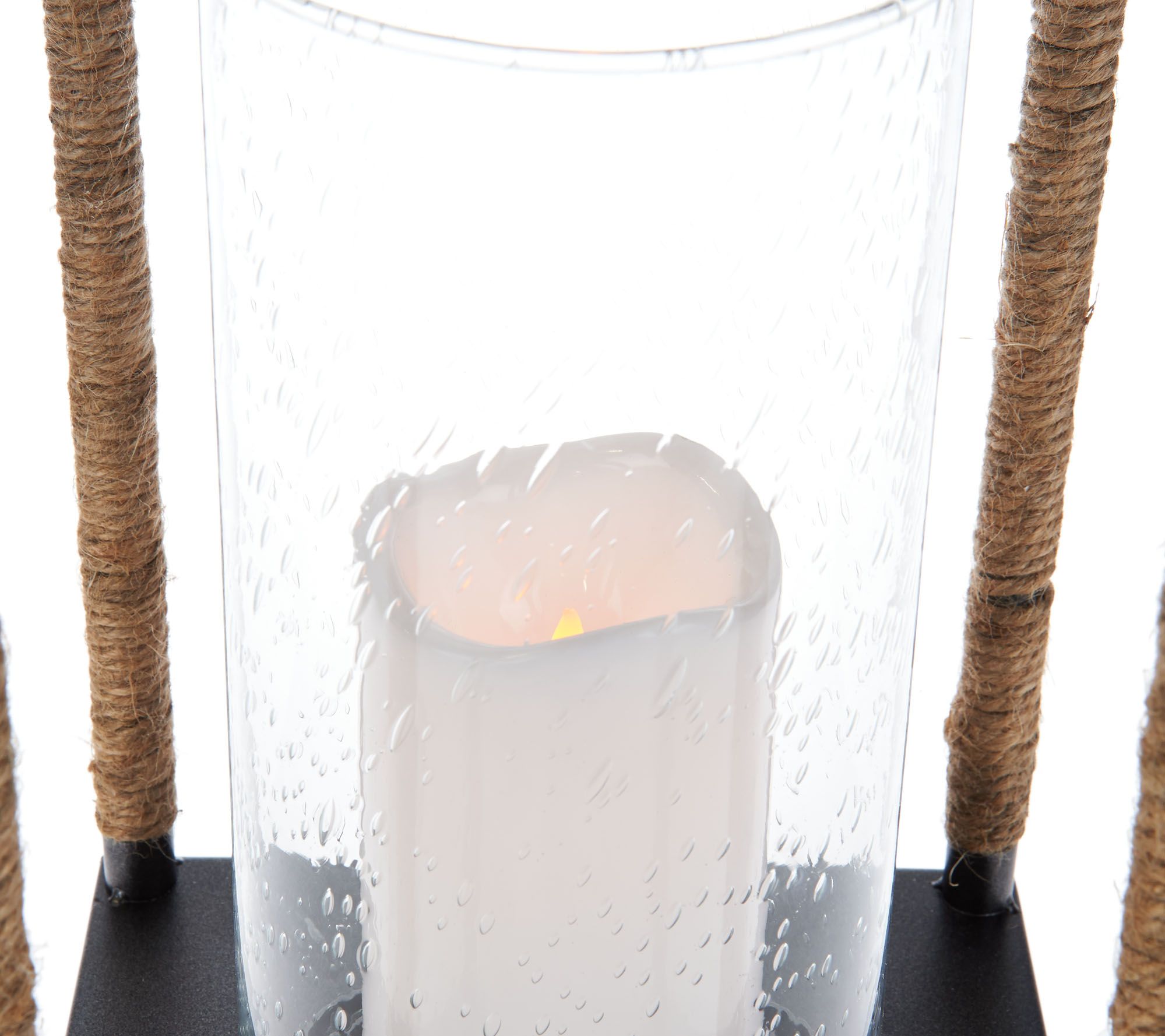 • Includes jute-wrapped lantern with clear glass cylinder and flameless candle